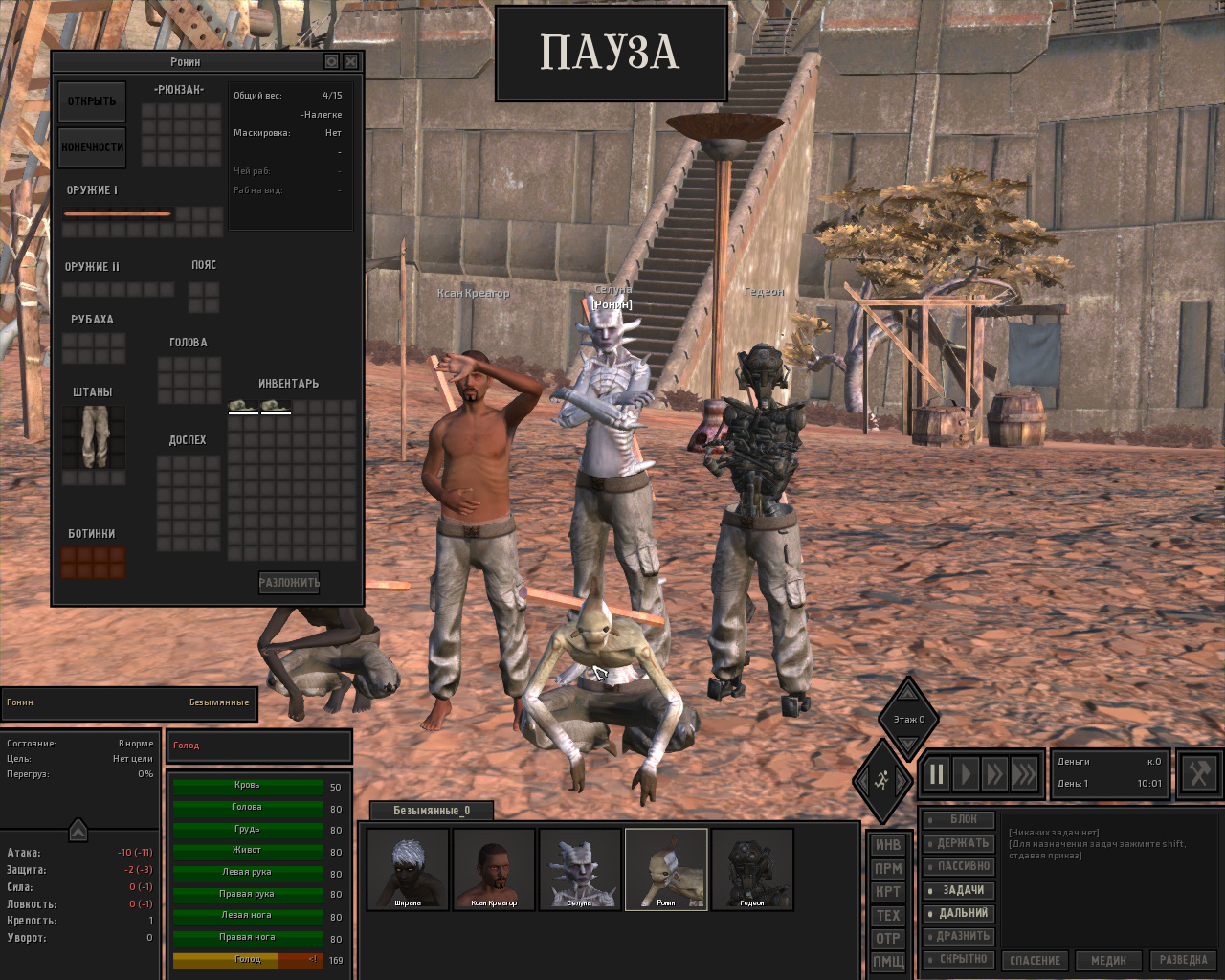 Негативные стороны, ровно как и плюсы в данном старте достаточно неоднозначны. Несмотря на высокий показатель голода в самом начале игры, еда без особых затрат добывается в ближайшем поселении (о безопасном способе её добычи я напишу ниже). А отсутствие одной из рук на ранних этапах, пусть и может доставить некоторые малозначительные неудобства, но я не назвал бы данное происшествие однозначной катастрофой в игре, где любую потерянную конечность можно заменить на охренительный бионический протез, чья степень полезности напрямую будет зависеть от толщины кошелька вашего отряда.