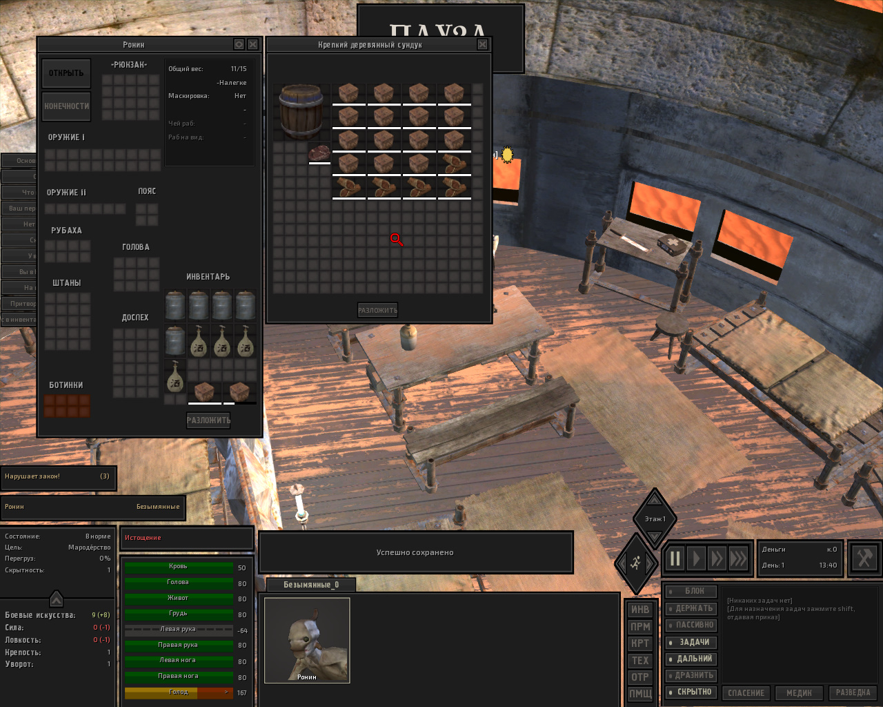 Прим. автора: после совершения любого противозаконного действия, на игрока в течении короткого промежутка времени накладывается статус «Нарушает закон!». В то время, пока действует этот статус, всеми силами старайтесь избегать любого обнаружения (желтый или красный значок глаза над головой скрывающегося персонажа), во избежание ареста вашего подопечного.