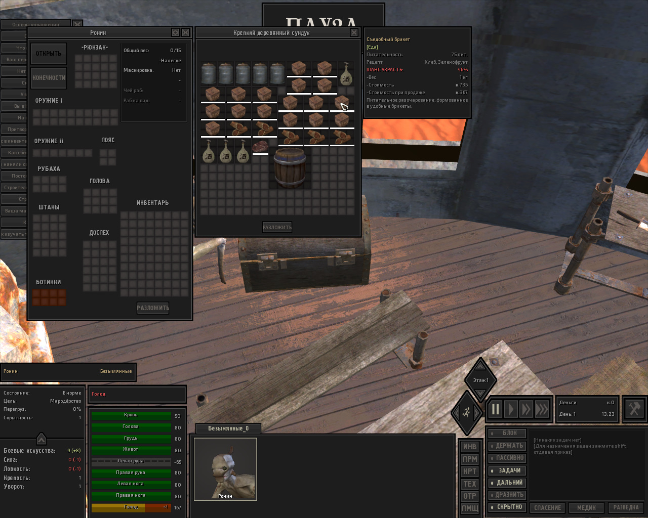 Для решения второй проблемы на территории самого города необходимо найти здание бара (их тут, кстати - целых три штуки), своей формой отдаленно напоминающее перевернутый стакан из под виски. Поднявшись на второй этаж, вы увидите одинокий и если вам немного повезёт, никем не охраняемый сундук, который достаточно легко открывается даже малоопытным взломщиком. В этом сундуке, как правило, хранится много дорогой и высококолорийной еды (шаурма и съедобные брикеты), а также большое количество алкоголя. Здесь думаю, следует особо подчеркнуть, что любое взаимодействие с чужой собственностью должно производиться исключительно в режиме скрытности (кнопка «Cкрытно» в правом нижнем углу экрана). Если же получилось так, что на втором этаже кто-то есть и вам никак не удается взломать замок на сундуке, при этом не попав в поле зрения охраны или посетителей, просто сделайте контрольное сохранение, а потом сразу же загрузитесь. Данная манипуляция с игровыми файлами тут же запустит скрипт, который заставит всех мешающих вам «NPC» перейти в другое место и таким образом даст вашему персонажу небольшое безопасное «окно» в 5-10 секунд.