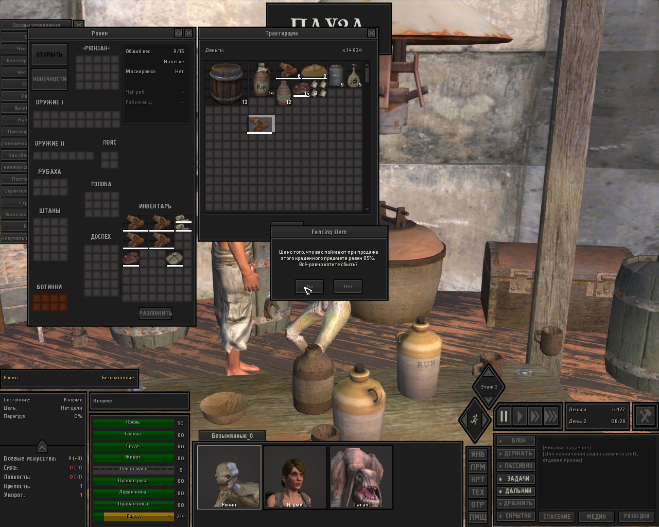 И пока вы с радостными воплями и диким улюлюканьем не побежали сбывать всё честно наворованное ближайшему торгашу (возможно даже тому, которого сами только что обворовали), вынужден вас предупредить, что в большинстве случаев игровые механики не позволяют безнаказанно продавать магазинам ворованный товар (и уж тем более тот товар, который вы «позаимствовали» в этом же городе). В подобной ситуации, единственной спасительной соломинкой, которая может помочь вам с пользой для своего кошелька избавиться от лишнего хлама в собственном инвентаре, является скупщик краденного. Данный персонаж постоянно курсирует от одной «забегаловки» к другой и с удовольствием, без лишних вопросов купит у игрока любой сомнительный товар за половину его рыночной стоимости. А учитывая тот факт, что практически каждый продаваемый предмет в любой торговой лавке постоянно обновляется примерно раз в игровые сутки, данная схема (украл -> выпил -> в тюрму -> продал краденное скупщику) позволяет каждый день генерировать из воздуха весьма внушительные суммы (ограниченные только небольшим суточным запасом бабла у этого «барыги») денег, особенно для первых часов игры.