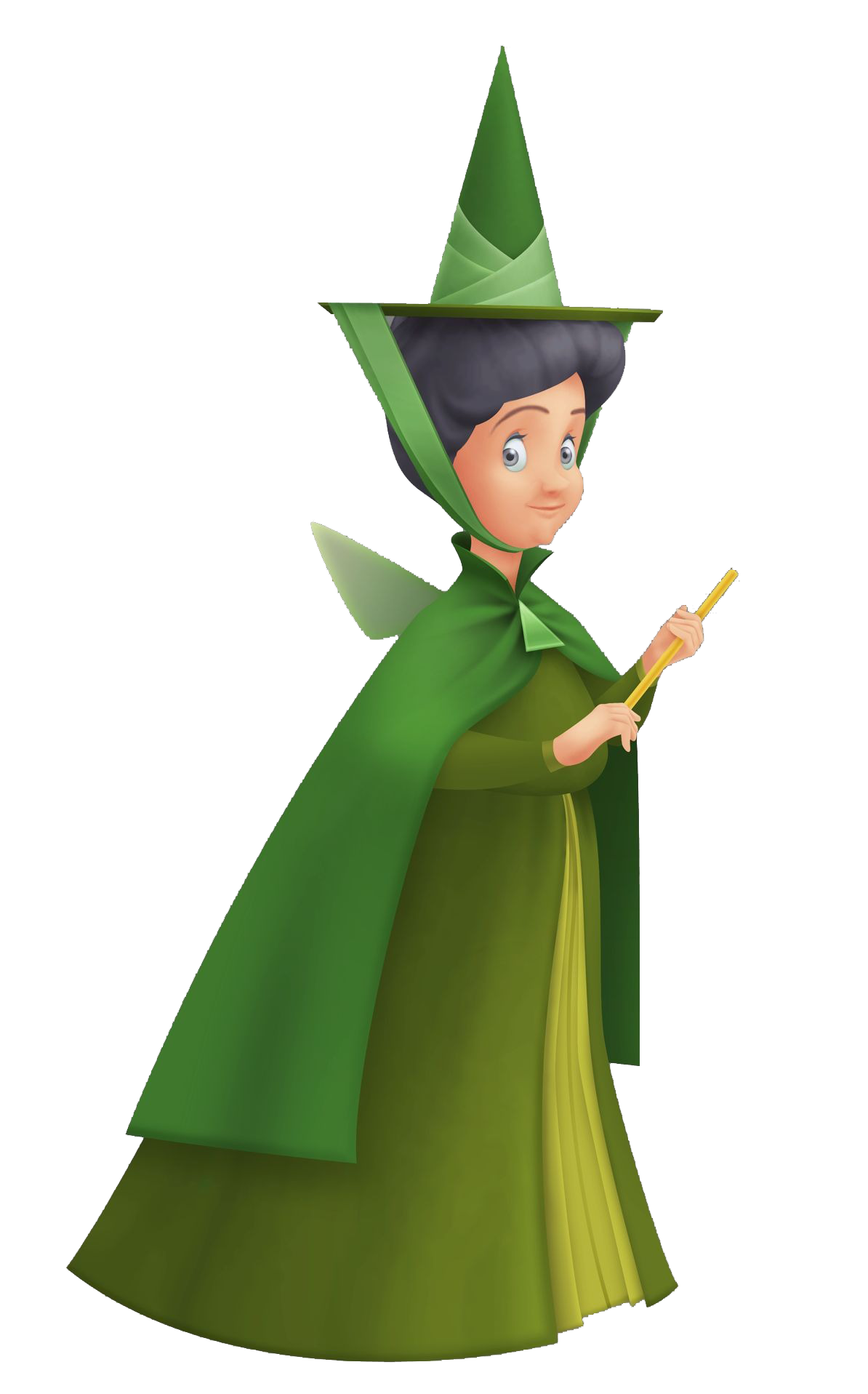 Фея в зеленом. Наиболее уравновешенная из трех фей являясь воплощением доброты в её первозданном виде. Нет вещи которая могла бы вызвать у неё агрессию, ведь она повелевает силами природы, являясь аллюзией древнегреческой богини Фауны повелительницы всех зверей и растений. Наградила новорожденную Аврору даром певчего голоса. На протяжении шестнадцати лет живет с сестрами и принцессой в лесном домике. |