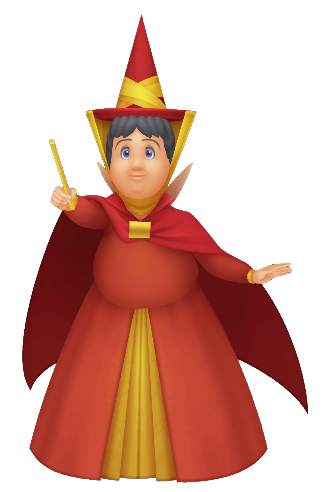 Фея в красном. Временами легкомысленна, тем не менее является главной из трех добрых фей. Подарила новорожденной Авроре дар редкой красоты. Чтобы обезопасить от Малефисенты, три феи шестнадцать лет живут с принцессой в лесном домике. |