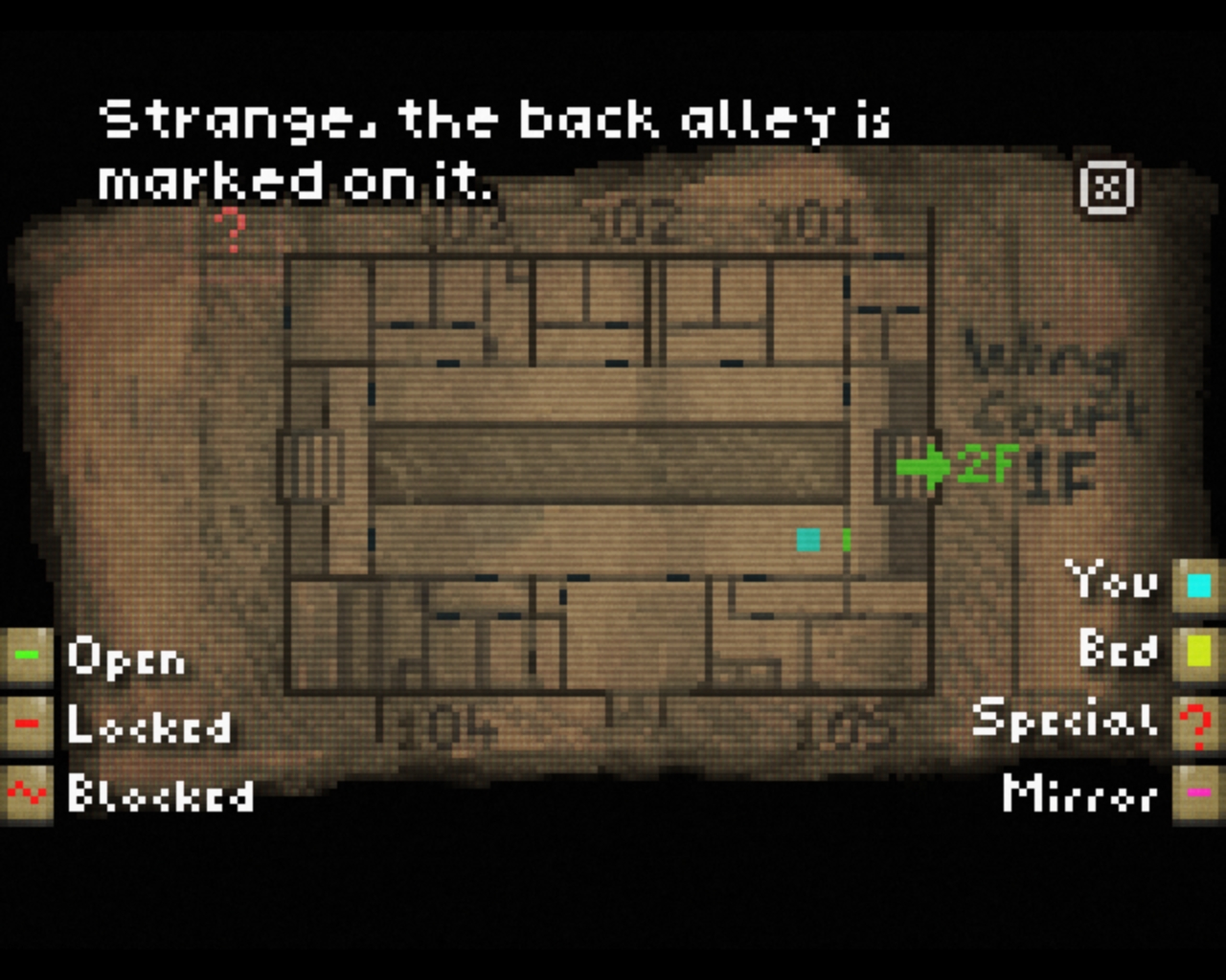 Заходите в здание рядом. Во время очередной галлюцинации, человек в синем спросит, знаете ли вы его или нет? Похоже, что выбор ответа влияет на психику героя, но не могу сказать точно. Когда герой придет в себя, подберите [золотой ключ] и лечебный тоник. Выходите из здания и идите дальше направо. Отправляйтесь на запад и найдете карту города. За дверью поблизости вы найдете батарейку, банку бобов и зеркало. Переулок пока проигнорируйте. Пройдите дальше по улице и найдете лечебный тоник. Кроме того вы встретите новое невраждебное существо – кота. Сейчас он вам никак не пригодится. Левее можно заметить дверь в больницу, но она закрыта на кодовый замок. К ней вернемся позже. Заходите в переулок.