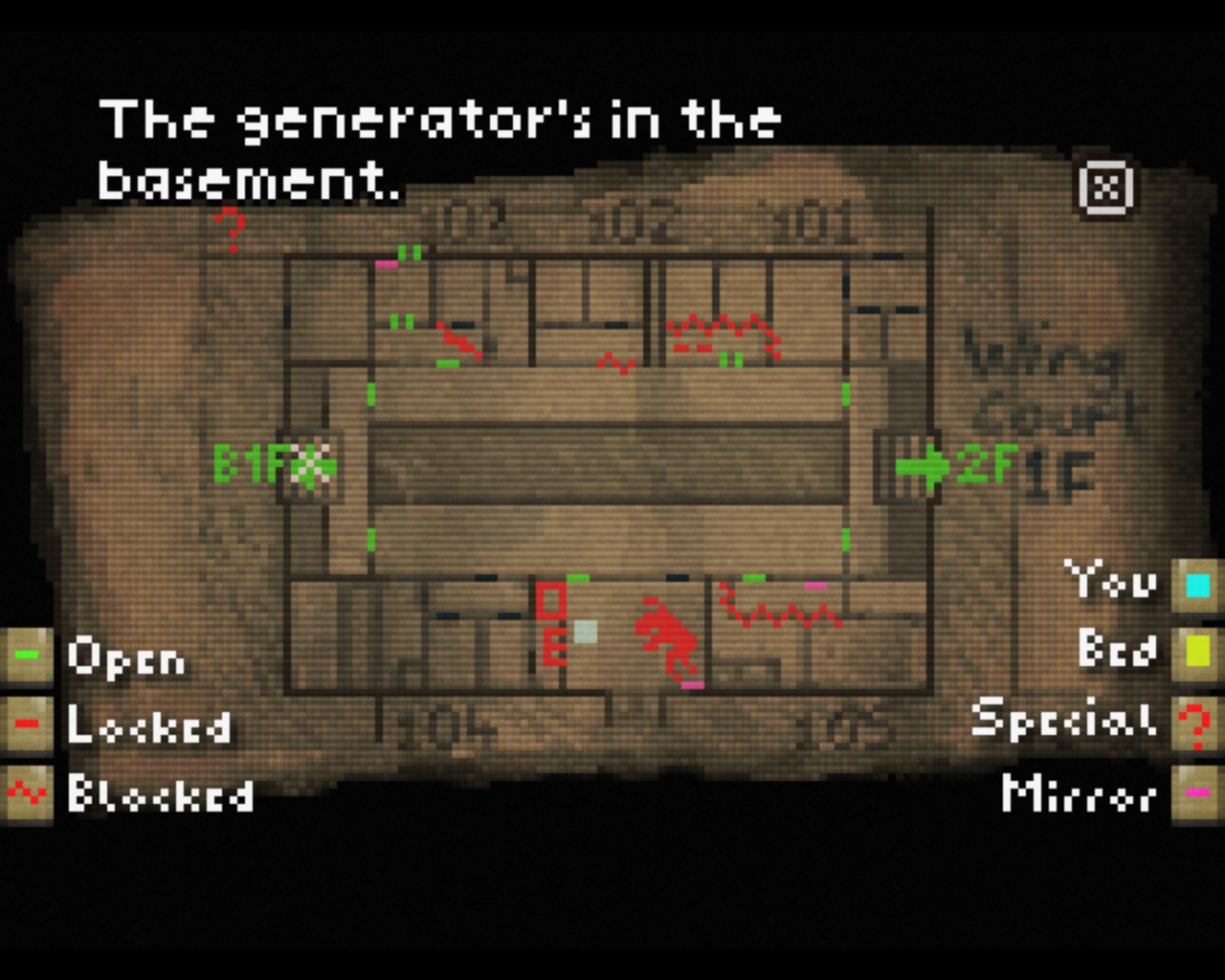 Слева от выхода, со стены, можно взять [карту этого этажа]. Все ваши исследования будут автоматически заноситься на карту – заблокированные или запертые двери, обрывы и прочее. Совсем как в Silent Hill. Метка на карте указывает на 203 номер. Будем искать путь туда. Но сначала посмотрите на растение, которое стоит рядом с окном.