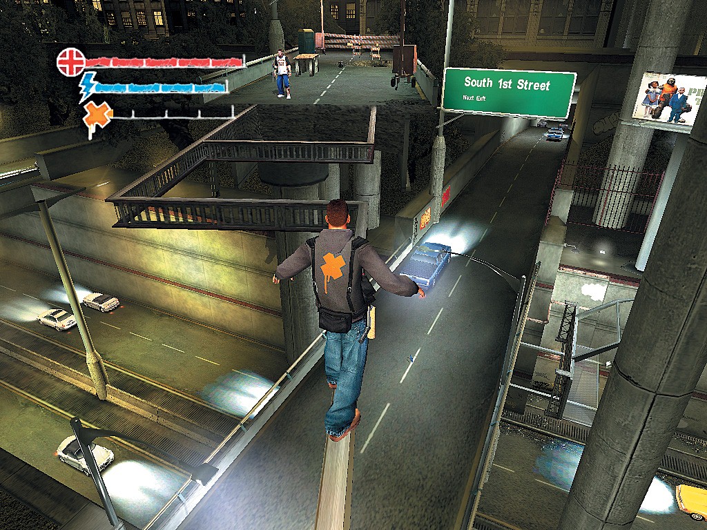 Но игру я полюбил за другое – за необычный геймплей. Как я уже говорил, игра является единственным полноценным симулятором райтера. Тут соблюдены все мелочи граффити: есть множество вариантов кастомизации: тэги, граффити разных размеров, стилей и цветов, трафареты, стикеры… Походу игры надо выполнять всякие задания, некоторые не обязательны (например, изрисовать стену энным количеством тэгов за энное количество времени – за это дают дополнительные очки). Будут целые миссии, где надо будет делать шикарные граффити по всей длине состава поезда (при этом, поезд будет находиться в движении – надо постоянно уклоняться от всяких преград, которые норовят сбить главного героя), на стенах, участвуя в соревновании с другими райтерами. Но помимо художества, придется еще и вступать в бои с другими райтерами, правоохранительными органами, периодически кричащими «art is a crime!». Некоторых из таких полицаев будет довольно сложно уложить – у них довольно увесистая броня, есть пушки. У игрока же тоже может быть оружие в виде деревяшек, кирпичей, бейсбольных бит. Но оно тоже не всегда эффективно. В общем, как beat ‘em up игра тоже хороша. Так же по ходу игры нам будут встречаться граффити легендарных райтеров их надо будет фотографировать на смартфон Nokia 7710. А еще надо будет собирать бонусные треки в секретных местах, в виде айподов. Такой вот веселый плейс-маркетинг.