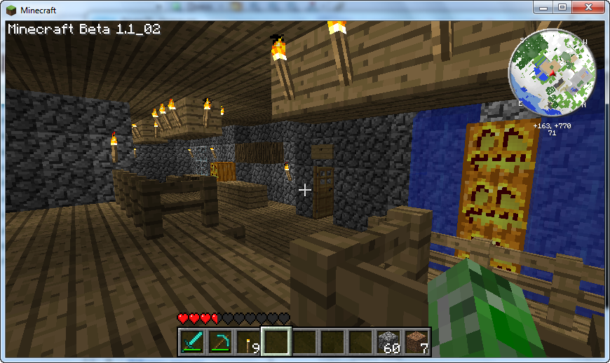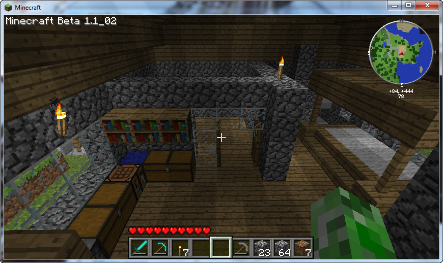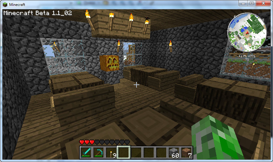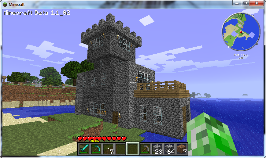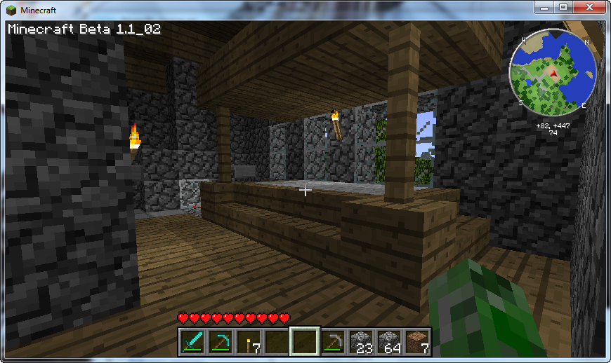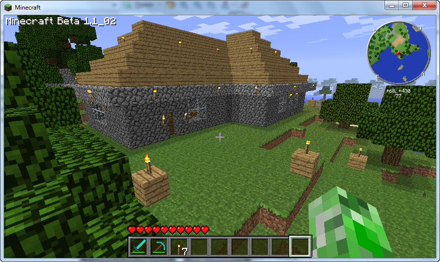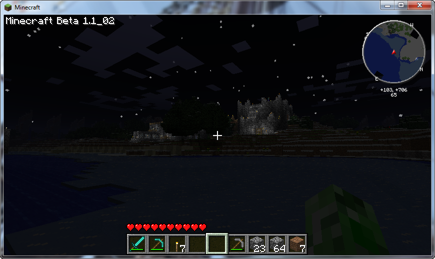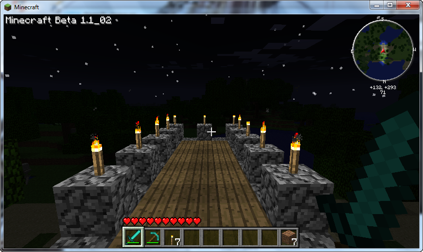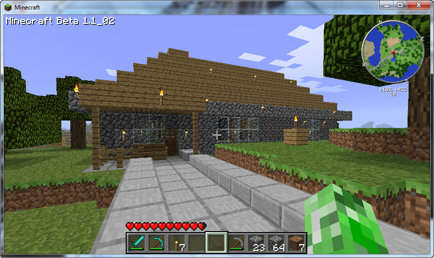 Пока я исследовал эти подземелья, наступила ночь, но впереди был ещё долгий путь, поэтому, рискуя жизьнью, я начал пробираться сквозь густые леса и пустынные равнины, за мной увязался один очень настойчивый зомби, и кто знает, чем бы закончилось моё приключение, если бы вдалеке я не увидел огни непонятного строения. Подойдя ближе, я ясно смог различить нечто, возможно, служащее кому-то ночным убежищем, во всяком случае, именно так использовал его я.