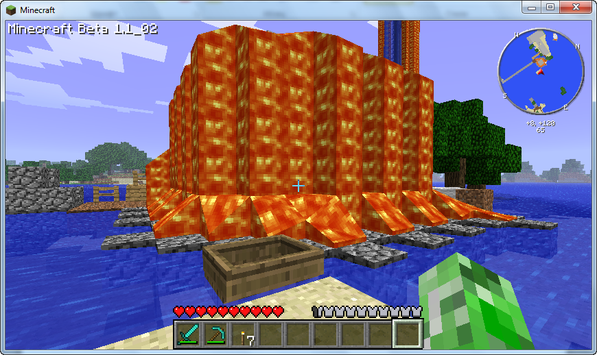 И первый же объект, на который упал мой острый взор, и куда потянул жаждущий приключений конь, виден даже со спавна. Наверняка, многие из вас, только появившись на сервере, сразу замечали огромный лавовый столб, а некоторые, возможно, даже исследовали окресности этого загадочного строения. Когда начинал я, этого столба ещё не было, да и после, времени на него я как-то не нашёл, поэтому, путешествие я хочу начать именно с этого замка.