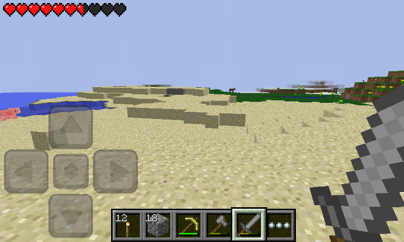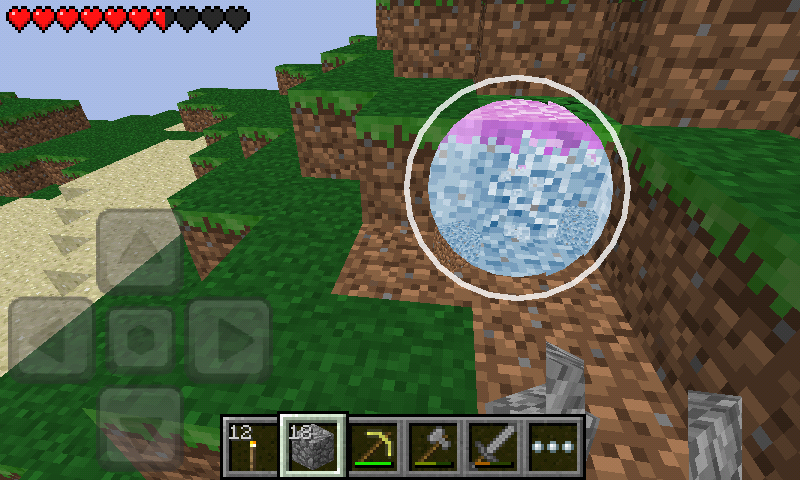 «Крест» сенсорных кнопок отвечает за ходьбу и прыжок (а так же за полет в «Креативе»), а правую мы используем для строительства (касание сенсора поставить блок, долгое нажатие разрушить).