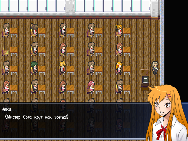 Мы оказываемся в пустой комнате, сначала проверяем дверь (нас ОПЯТЬ закрыли!!), после кликаем на комп – смотрим сценку, после чего на книжный шкаф – снова смотрим сценку (учитель кстати появится перед книжным шкафчиком, но это призрак, так что просто кликайте по нему). Там-там! Дверь открылась, выходим, идём направо и быстро убегаем от учителя в дверь напротив. После выходим, кликаем на котейку и снова смотрим сценку. Топаем за учителем, разговариваем, смотрим сценку, разговариваем, смотрим сценку, снова топаем за ним и снова разговариваем. Всё =.=