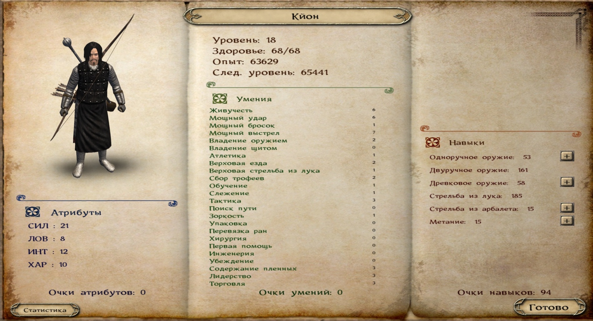 Харизма с каждым очком Харизмы увеличивается максимальное количество воинов в отряде на 1. Навыки, которые относятся к Харизме, не могут превышать 1\3 от её значения. Например, если Харизма 9, то содержание пленных не может быть больше 3.