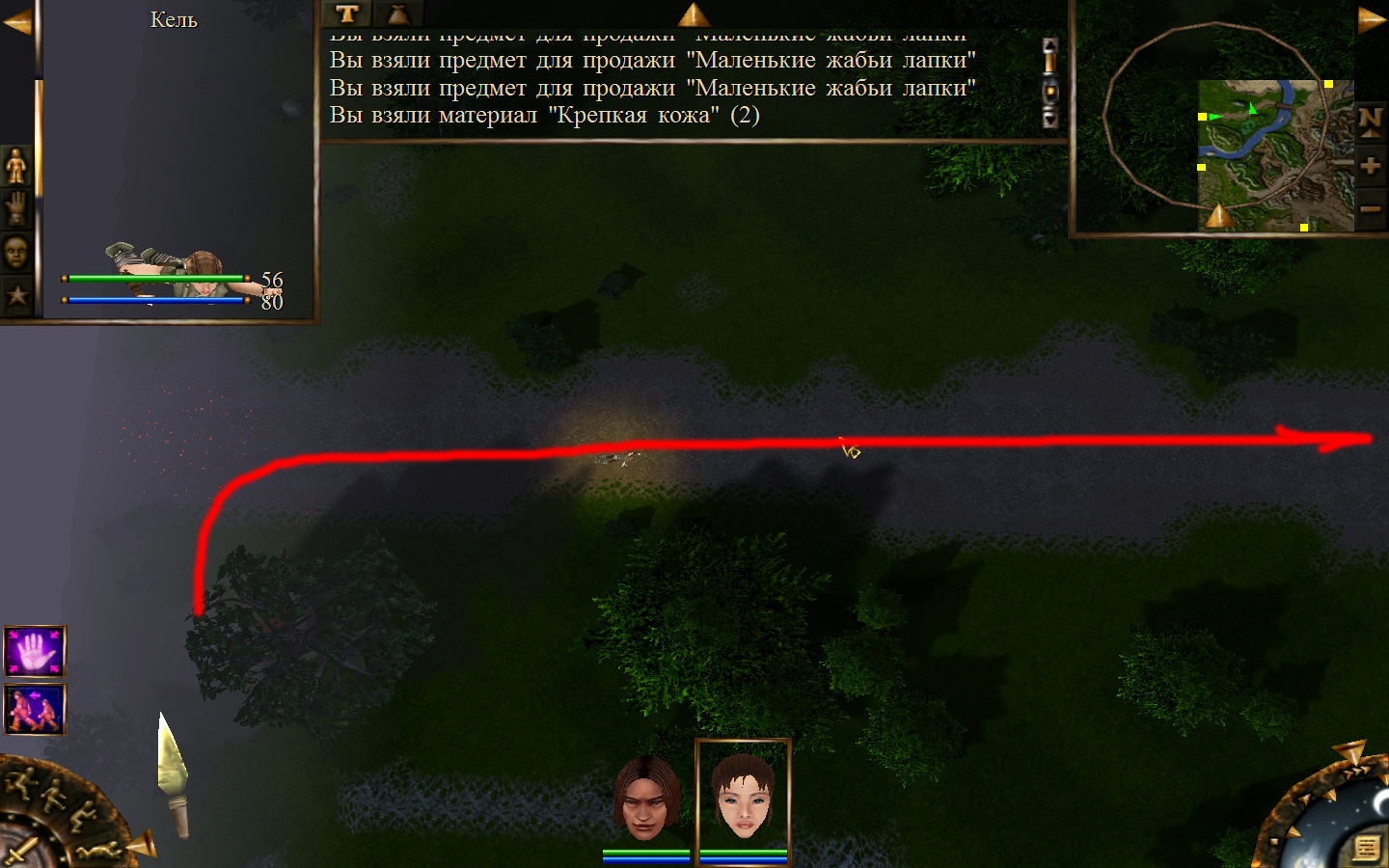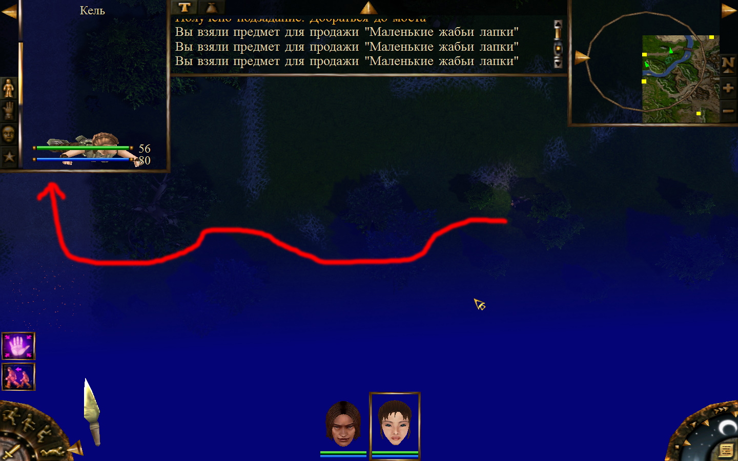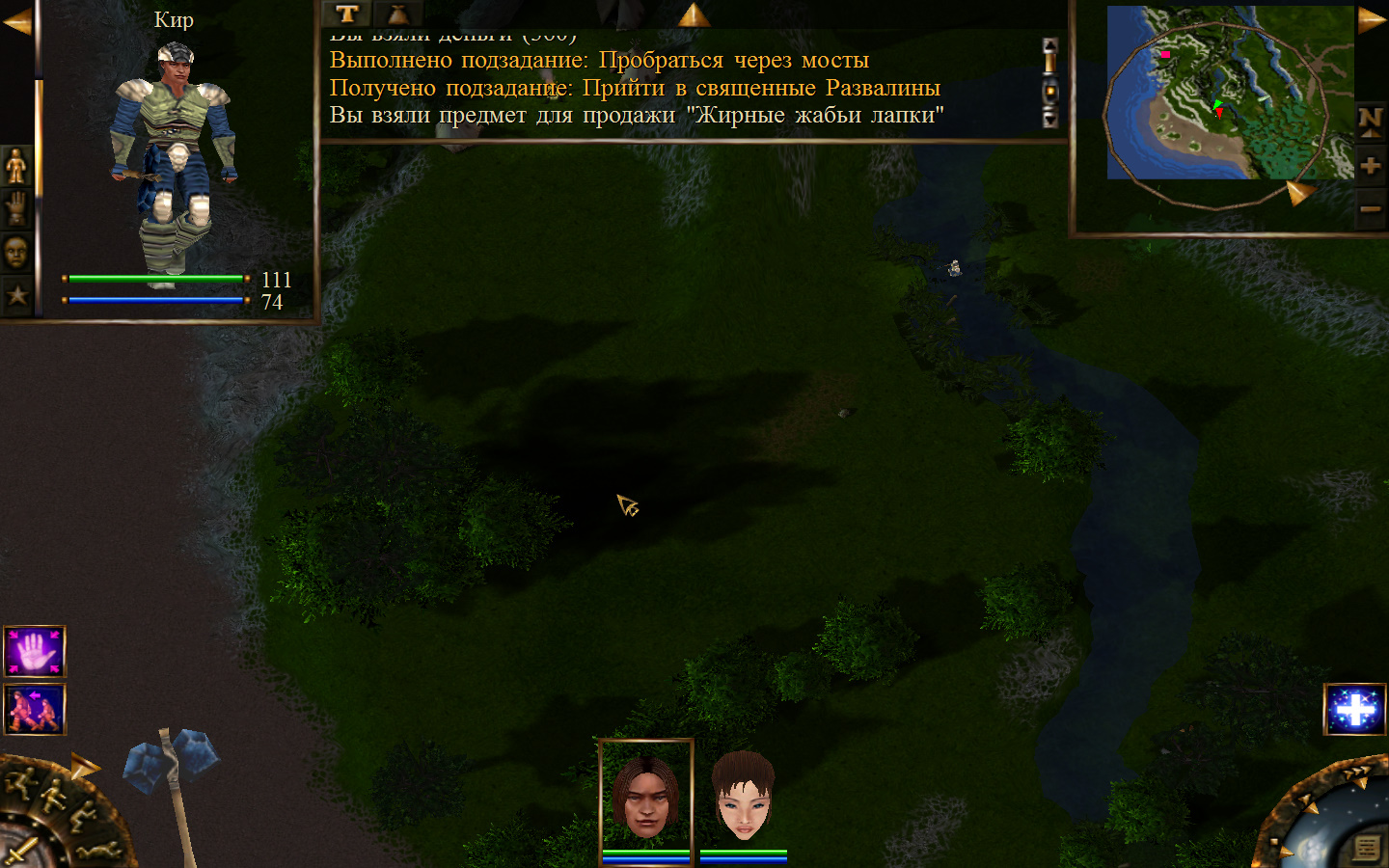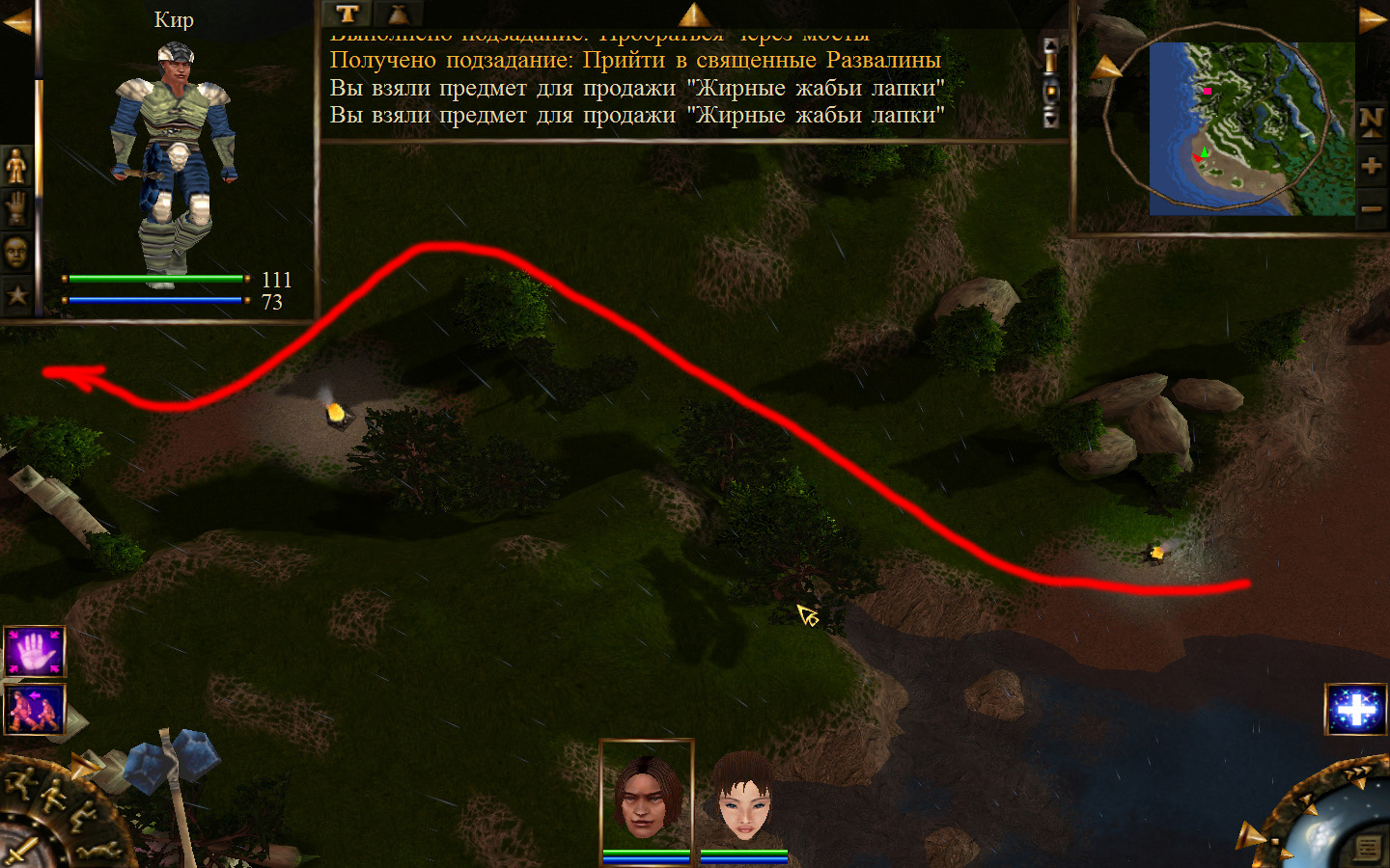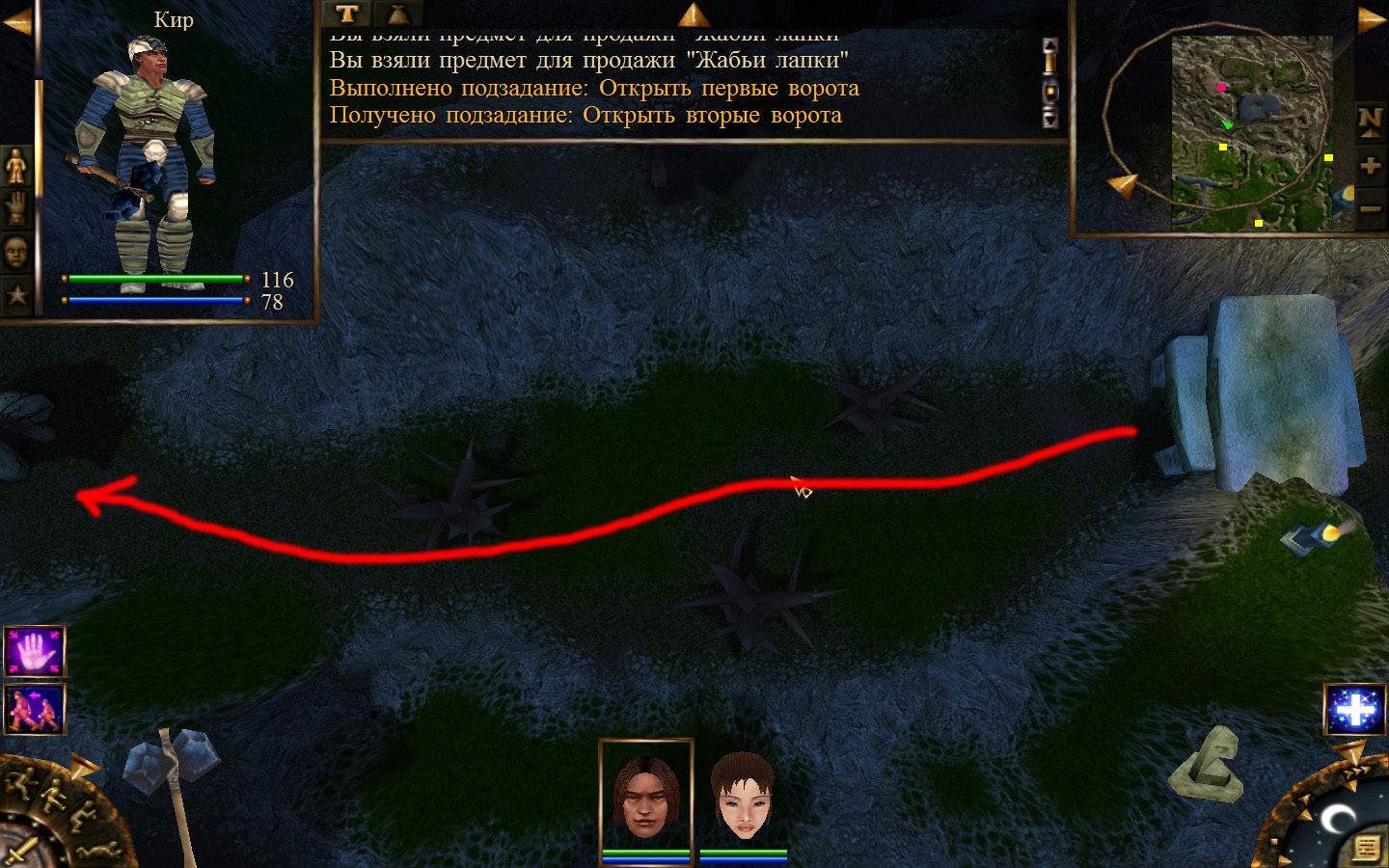 И вот, мы на Гипате, но не все так просто. Закинуло нас не пойми куда и не пойми как. Кир и Кель находятся в разных местах, локация зовется Мертвый город и нам необходимо найти поселение. Киром ползем вдоль реки, по той же траектории, что и на скрине. Убиваем одну за другой ядовитых жаб, лучше всего со спины и по одной, потому что с несколькими на данном этапе развития персонажа никак не справиться. Выползаем на тропинку и переключаемся на Кель.