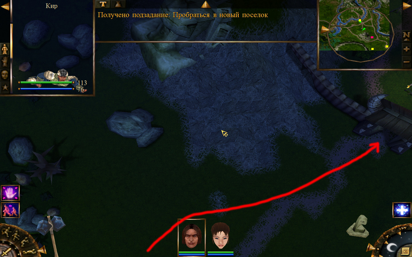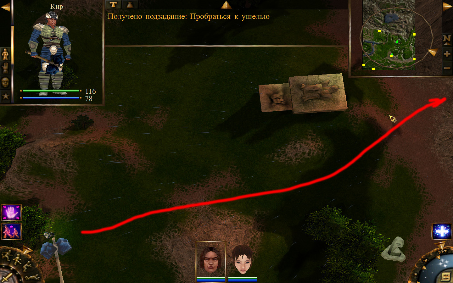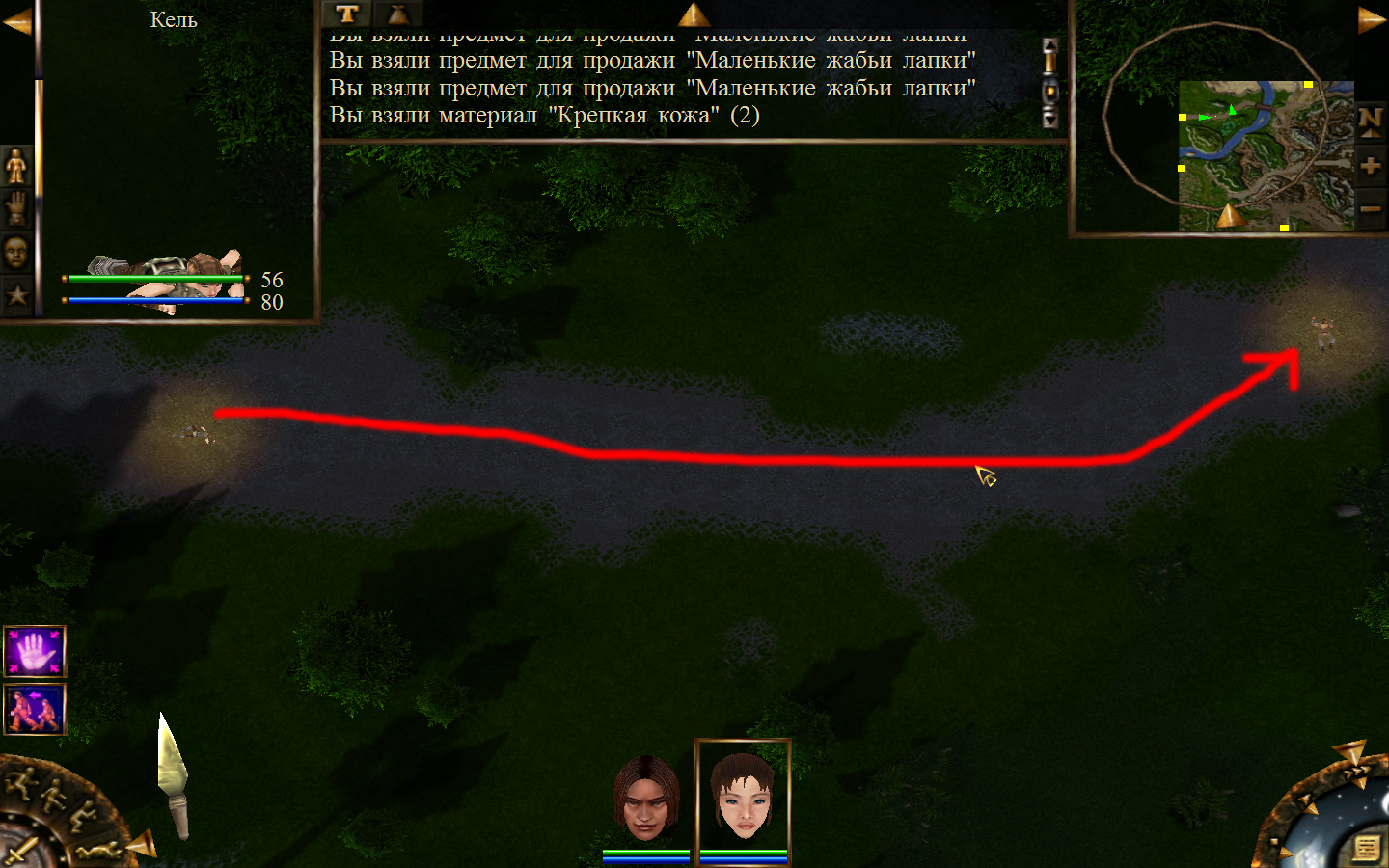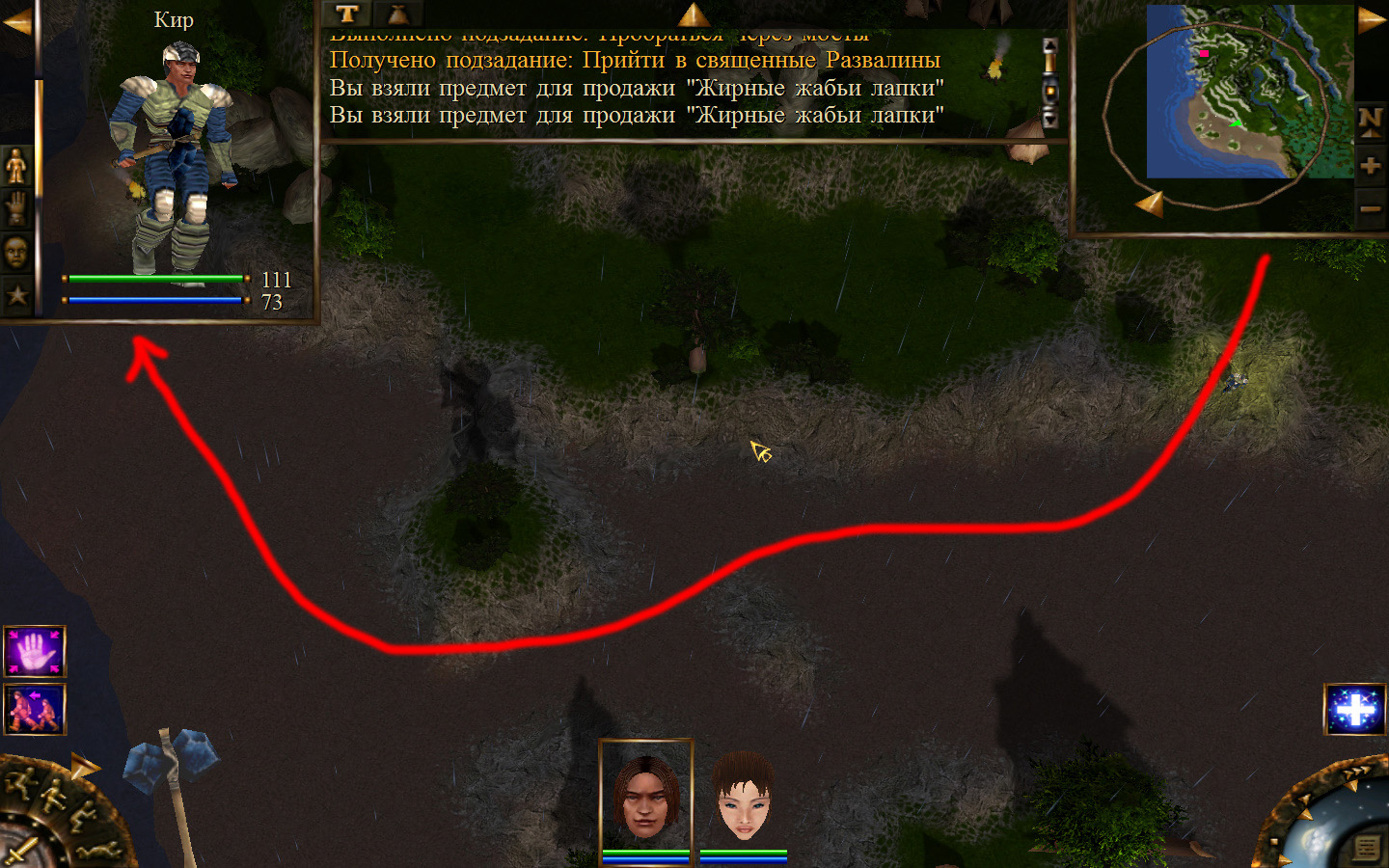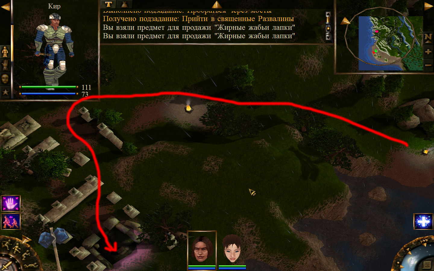 И вот, мы на Гипате, но не все так просто. Закинуло нас не пойми куда и не пойми как. Кир и Кель находятся в разных местах, локация зовется Мертвый город и нам необходимо найти поселение. Киром ползем вдоль реки, по той же траектории, что и на скрине. Убиваем одну за другой ядовитых жаб, лучше всего со спины и по одной, потому что с несколькими на данном этапе развития персонажа никак не справиться. Выползаем на тропинку и переключаемся на Кель.