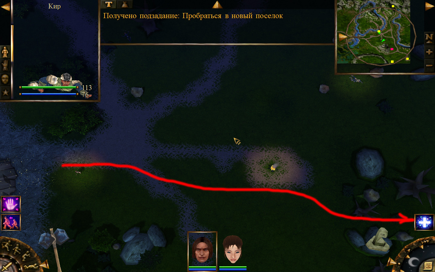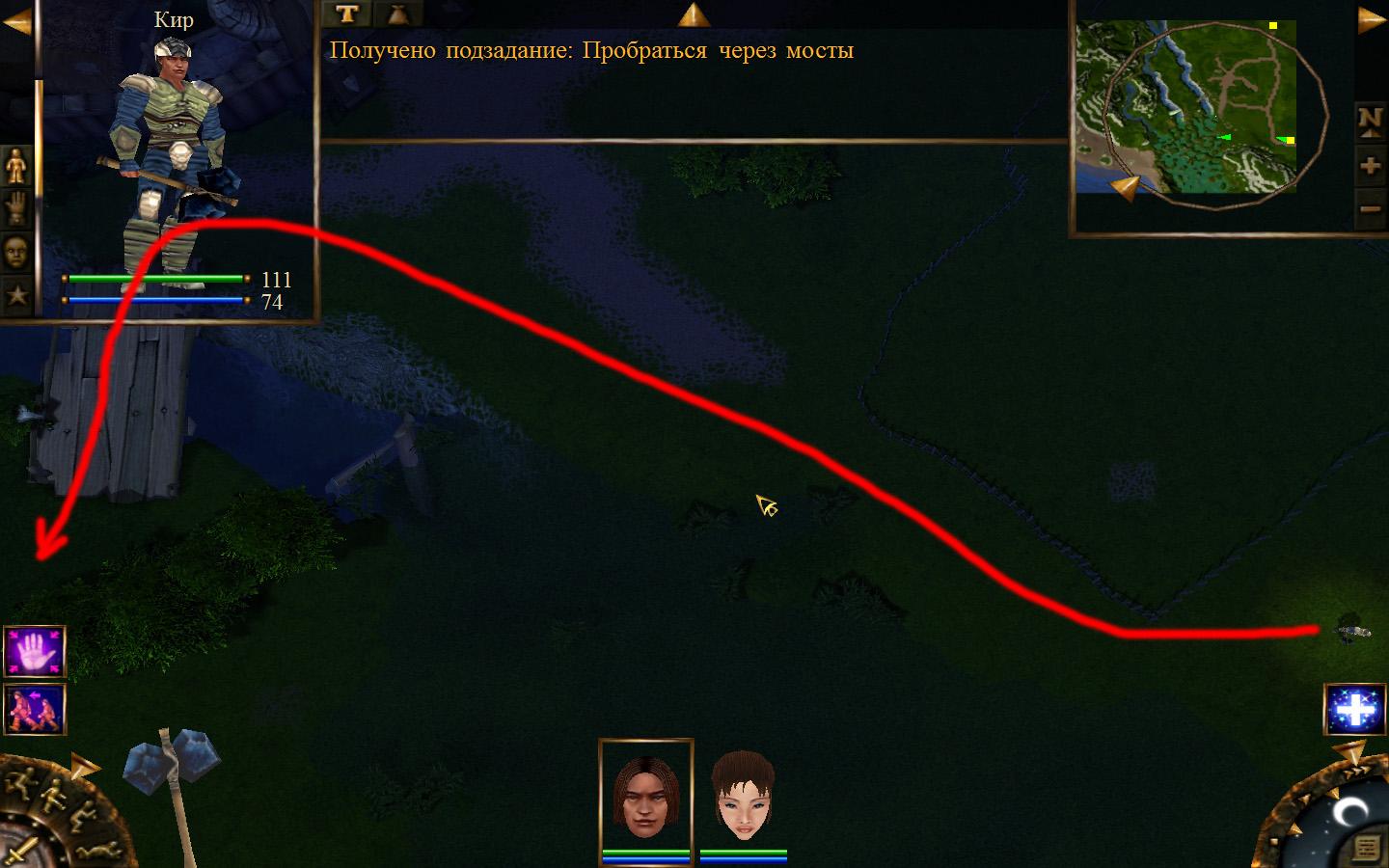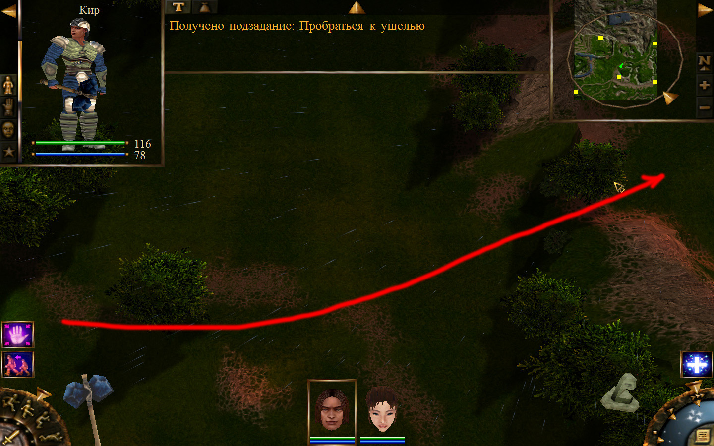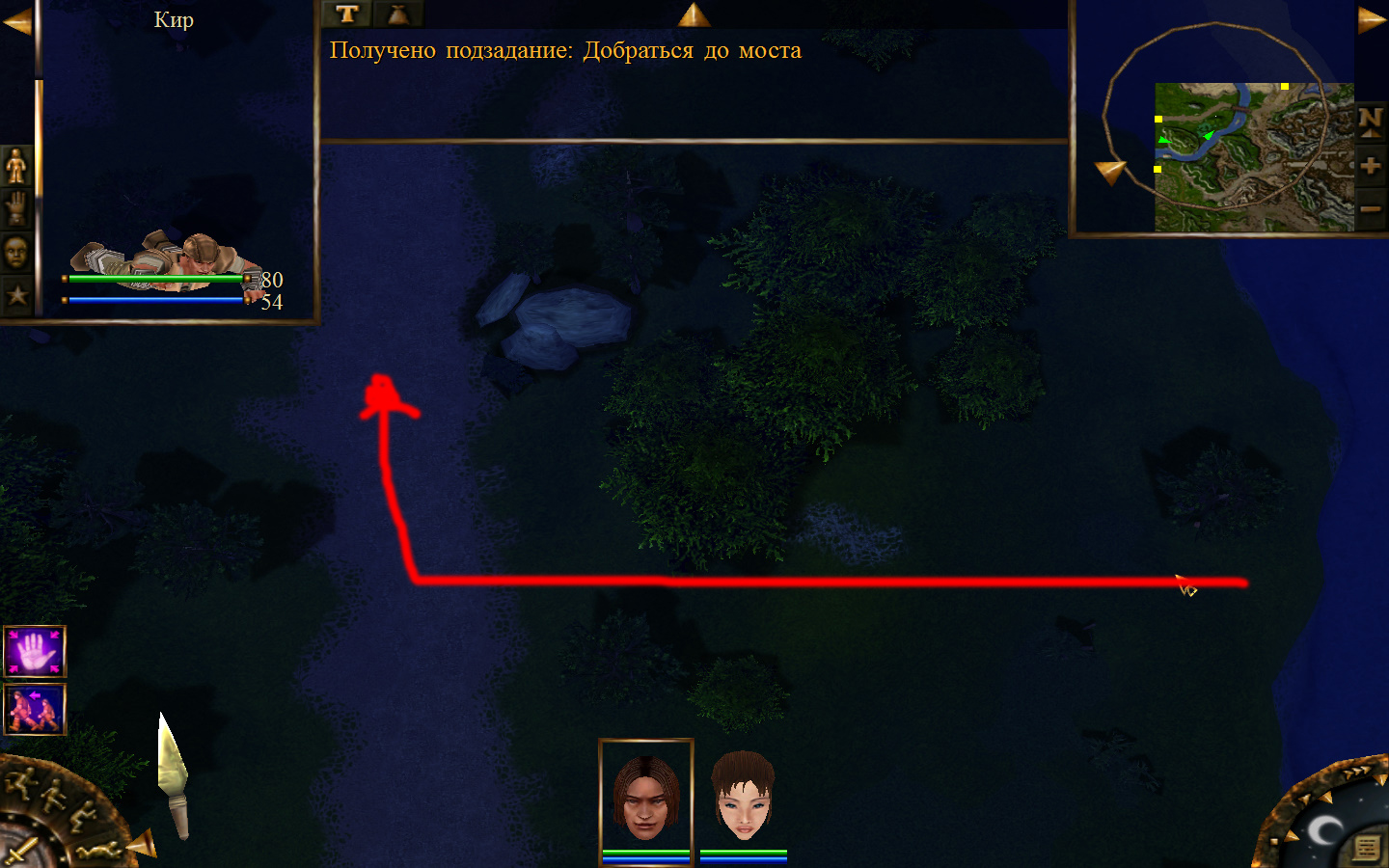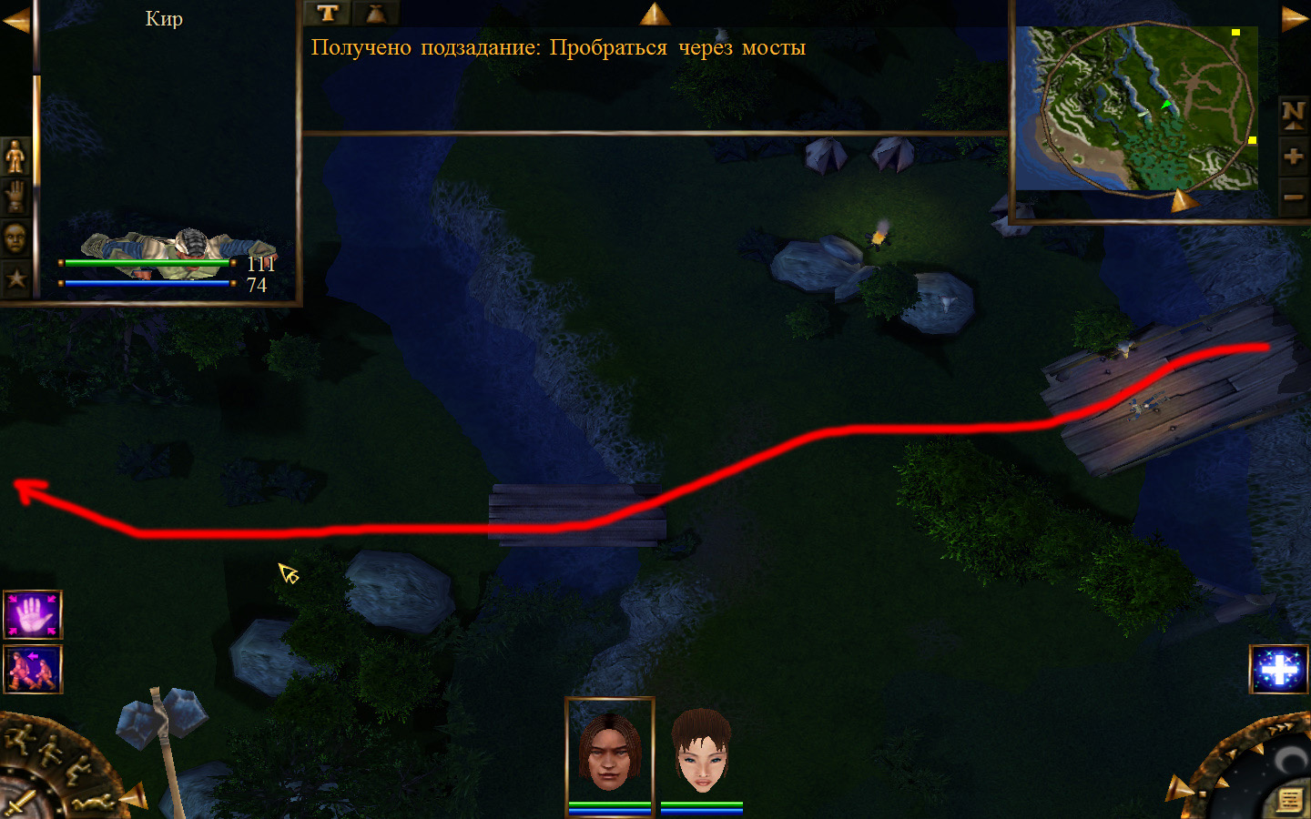 Ей до тропинки ближе, но перед ней стоит кабан. Необходимо дождаться, пока кабан повернется спиной к Кель и нанести удар. После этого ползком пробраться до Кира по тропе. Далее обоими персонажами ползем до моста. Перебравшись через мост, поворачиваем налево и ползем в горку к переходу между игровыми зонами. Вот и все мы в поселении.