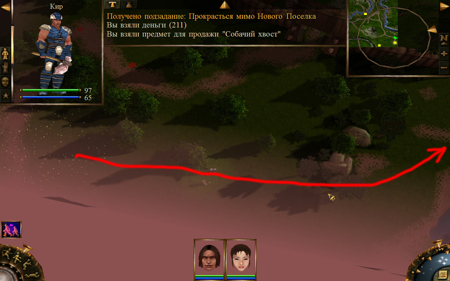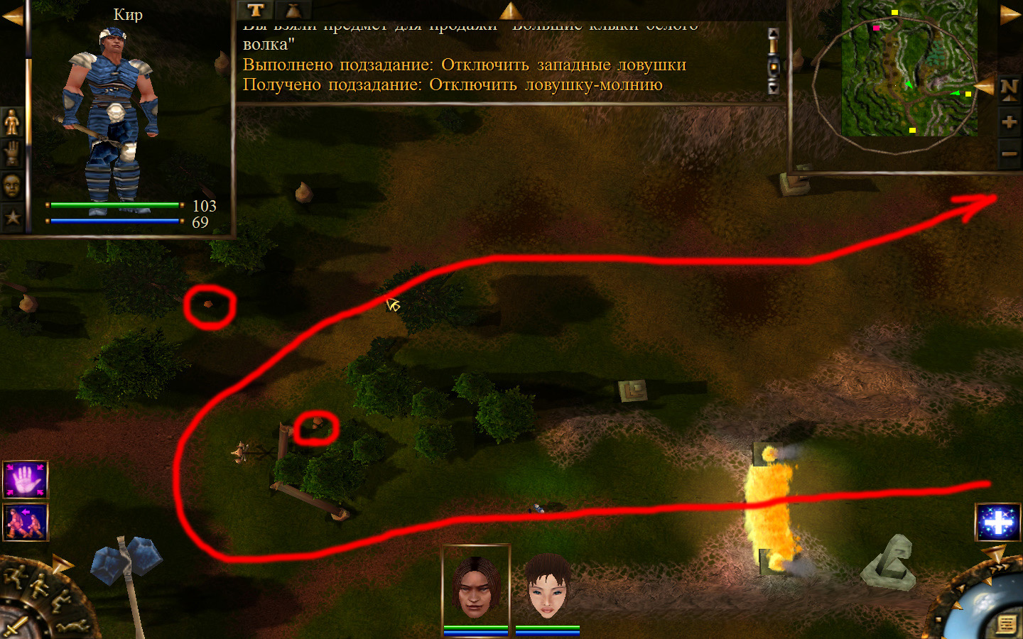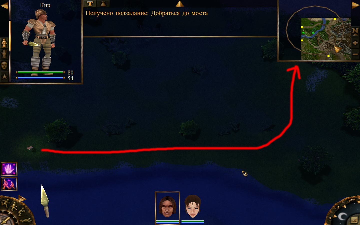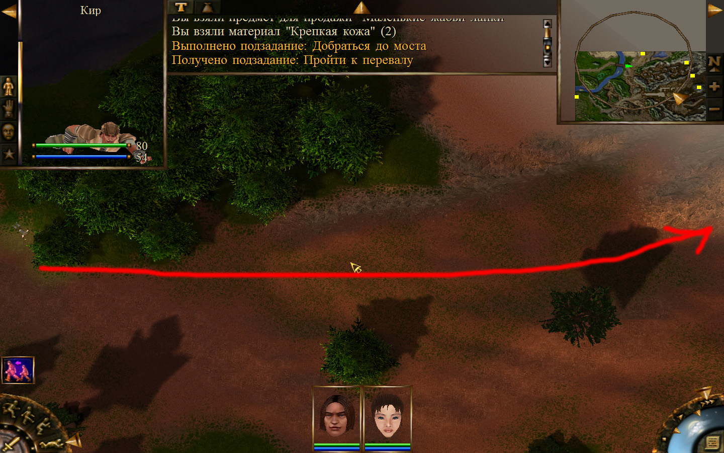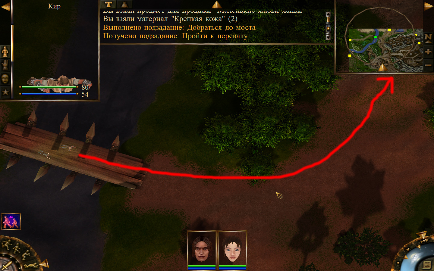 Ей до тропинки ближе, но перед ней стоит кабан. Необходимо дождаться, пока кабан повернется спиной к Кель и нанести удар. После этого ползком пробраться до Кира по тропе. Далее обоими персонажами ползем до моста. Перебравшись через мост, поворачиваем налево и ползем в горку к переходу между игровыми зонами. Вот и все мы в поселении.