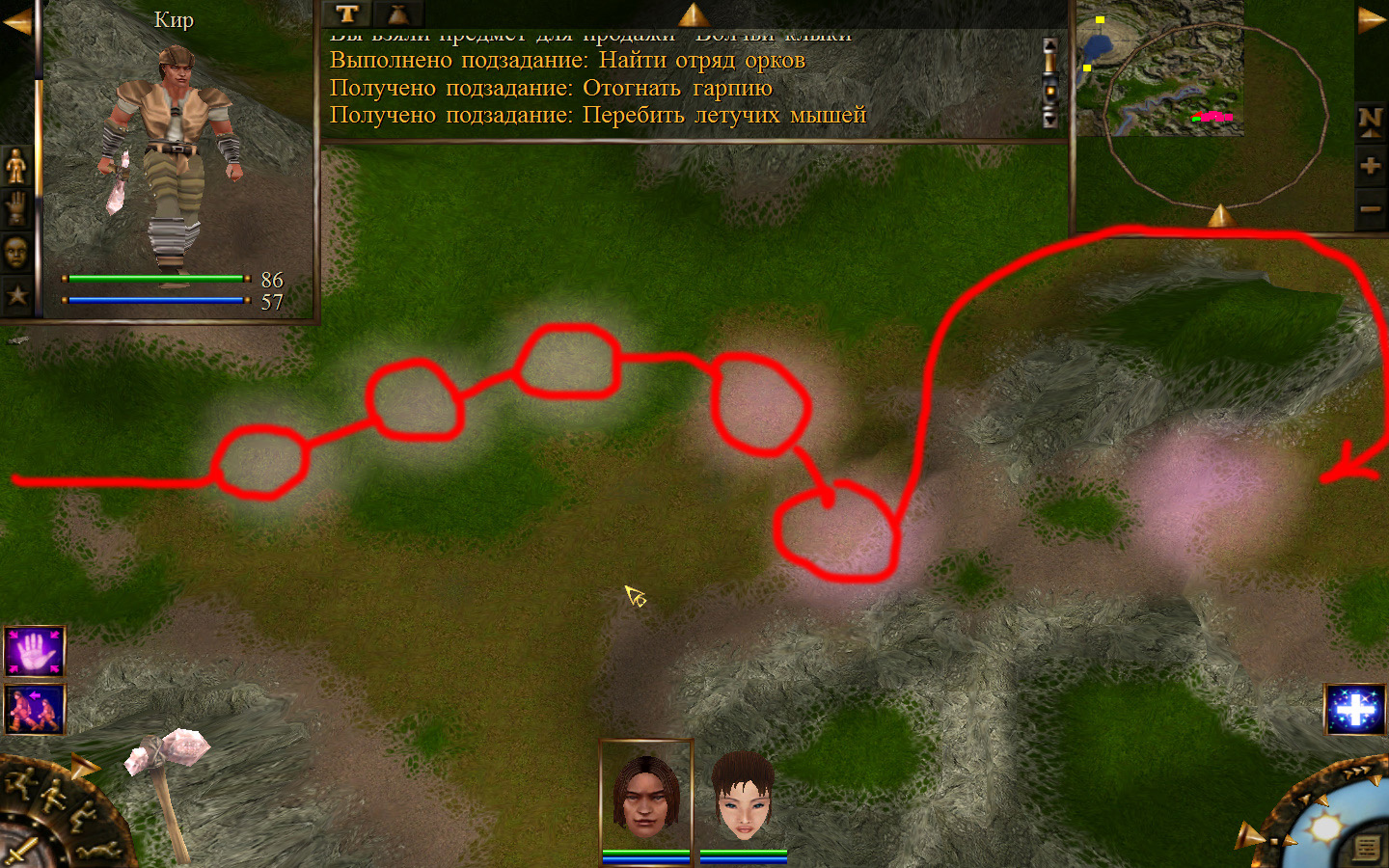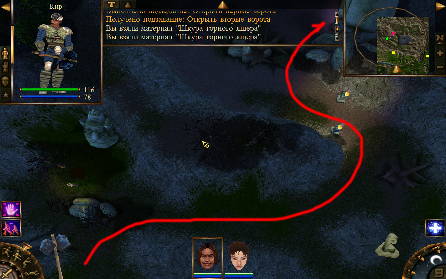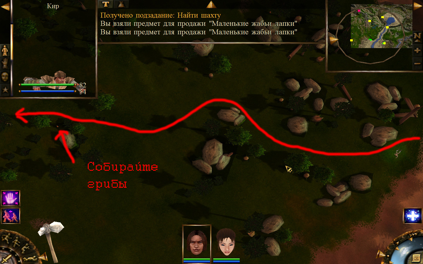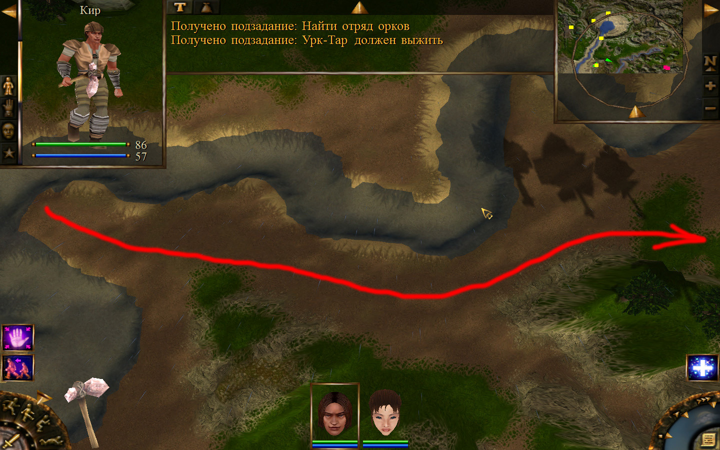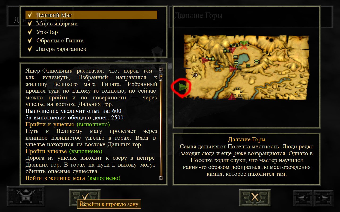 Выходим из магазина, дальше выходим из поселения орков в локацию Дальние горы. Двигаемся прямо от выхода из стойбища орков. Переходим через реку, на пути будут встречаться лягушки, убиваем по одной, не собираем всех вместе. Так же вдоль реки будут ходить речные ящеры, конечно же, пытаемся не сталкиваться с ними. Лучше всего пробираться ползком. Ползем дальше к розовому квадратику на карте. Убиваем диких животных. Добираемся до шахты и берем оттуда образцы. После чего возвращаемся в стойбище орков.
