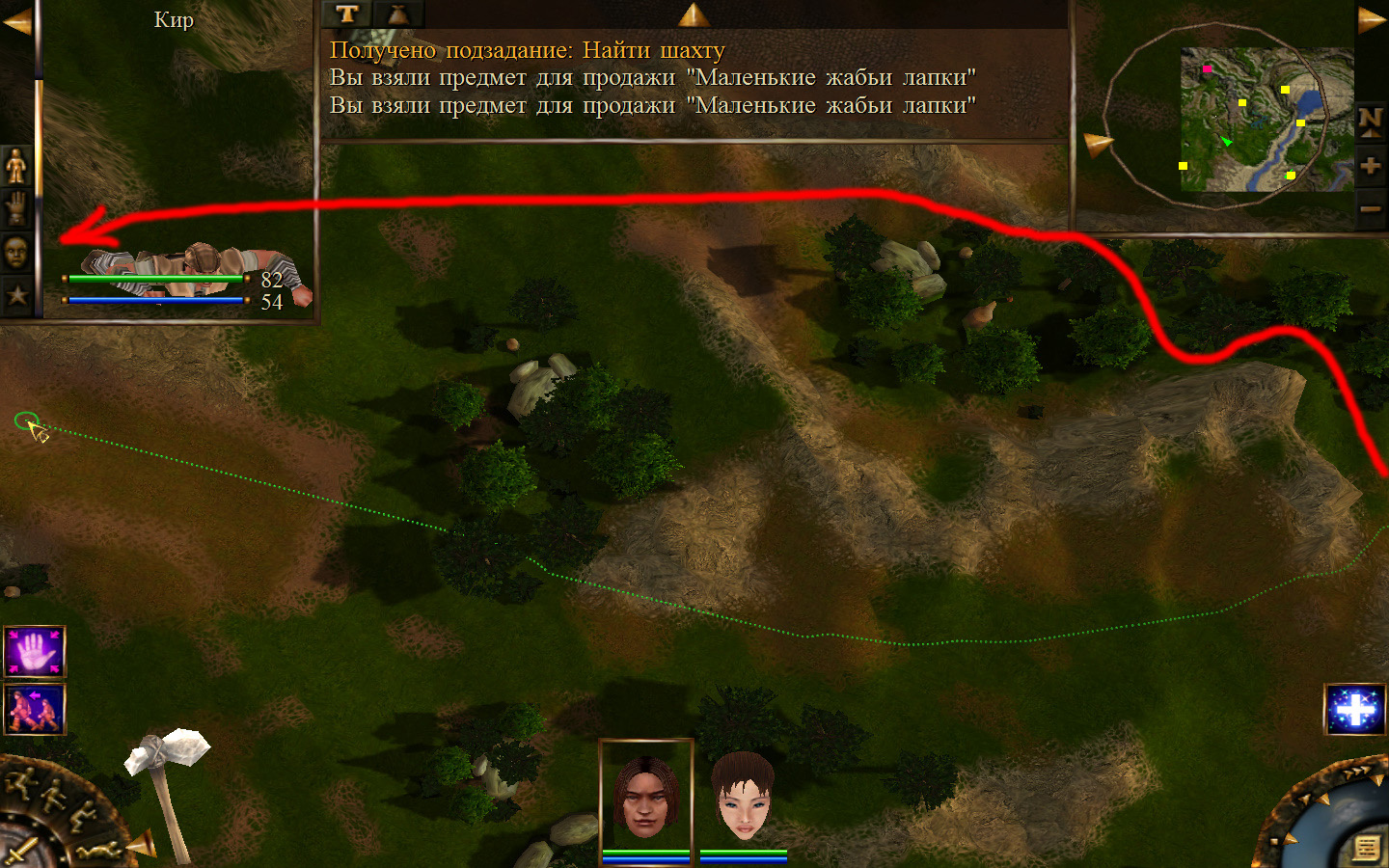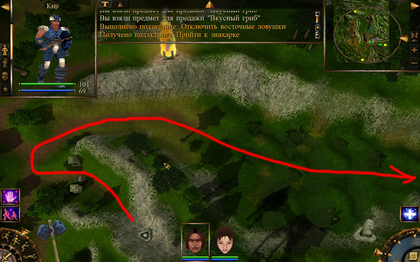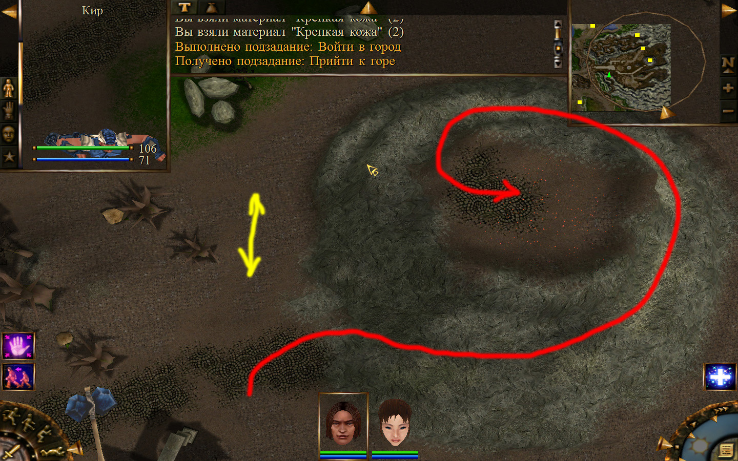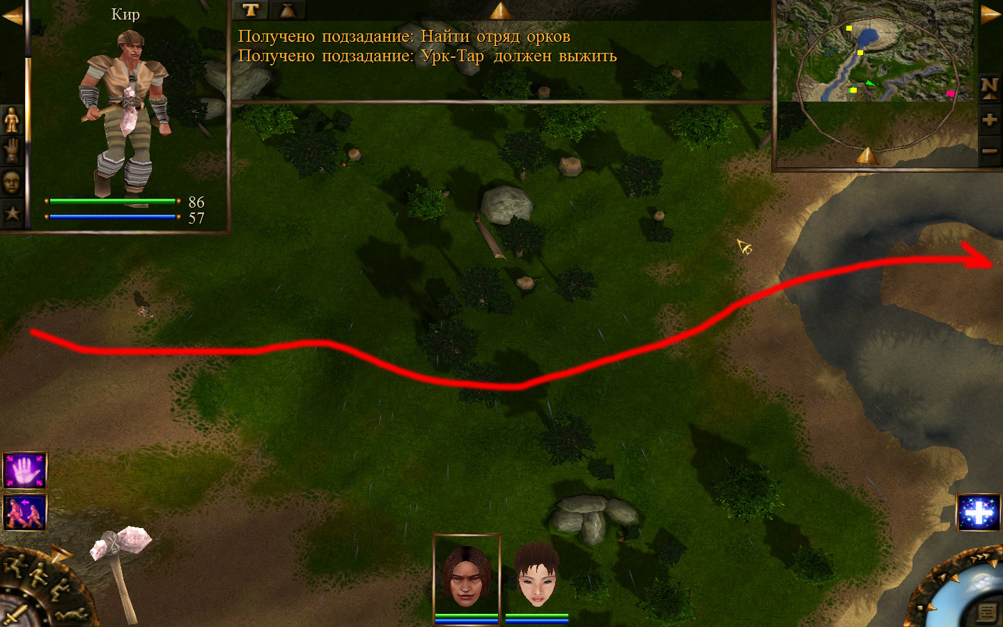 Выходим из магазина, дальше выходим из поселения орков в локацию Дальние горы. Двигаемся прямо от выхода из стойбища орков. Переходим через реку, на пути будут встречаться лягушки, убиваем по одной, не собираем всех вместе. Так же вдоль реки будут ходить речные ящеры, конечно же, пытаемся не сталкиваться с ними. Лучше всего пробираться ползком. Ползем дальше к розовому квадратику на карте. Убиваем диких животных. Добираемся до шахты и берем оттуда образцы. После чего возвращаемся в стойбище орков.