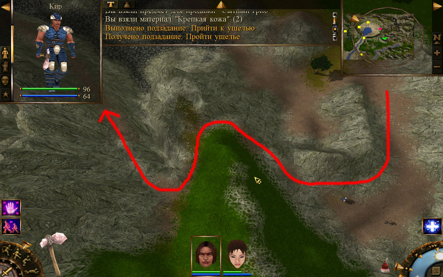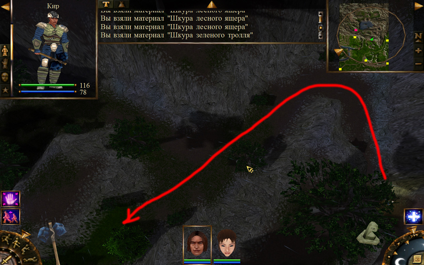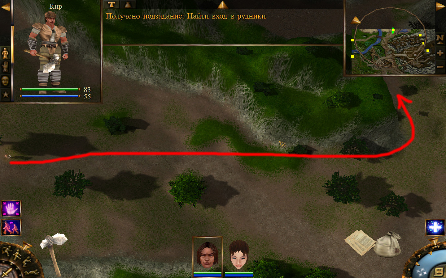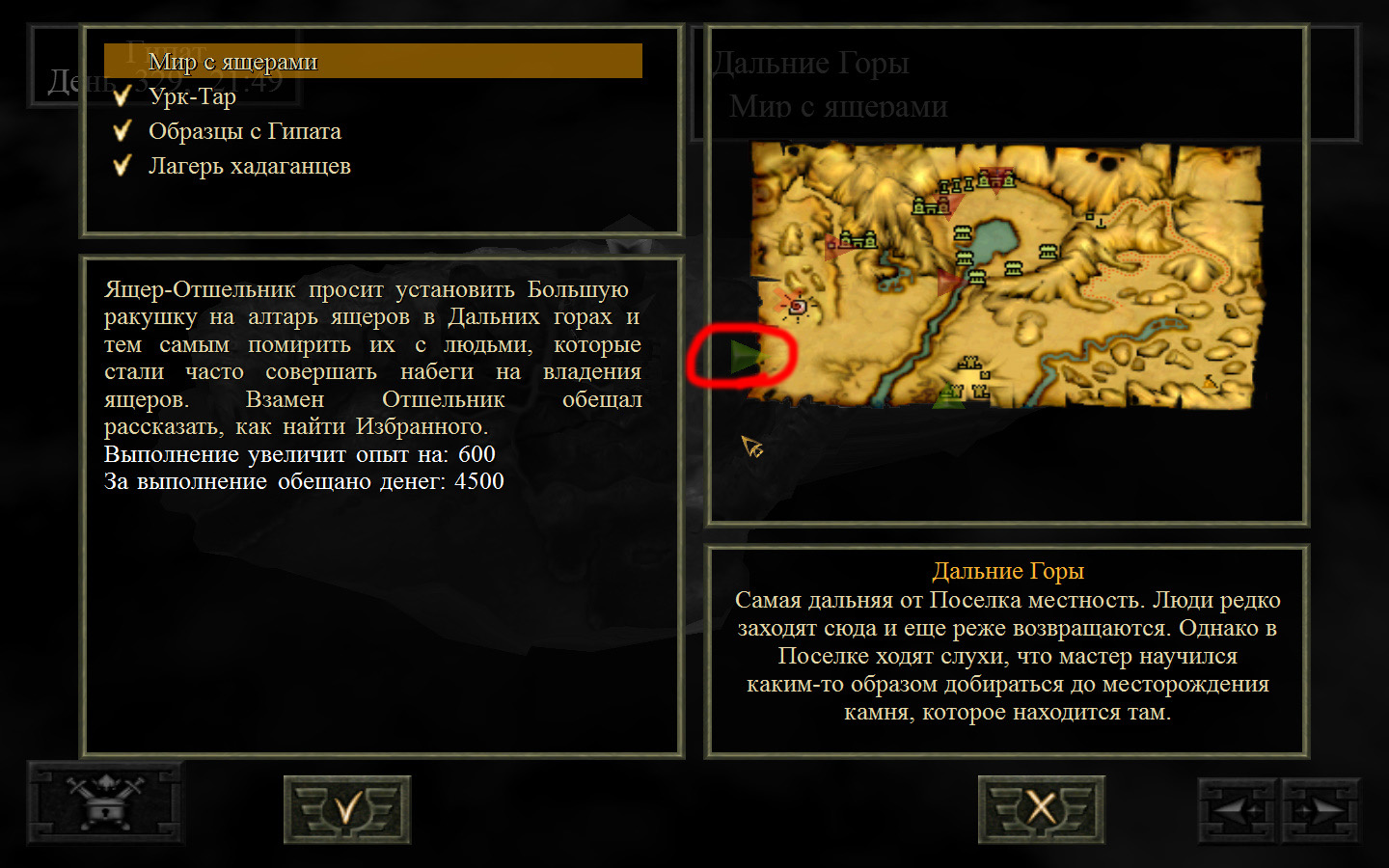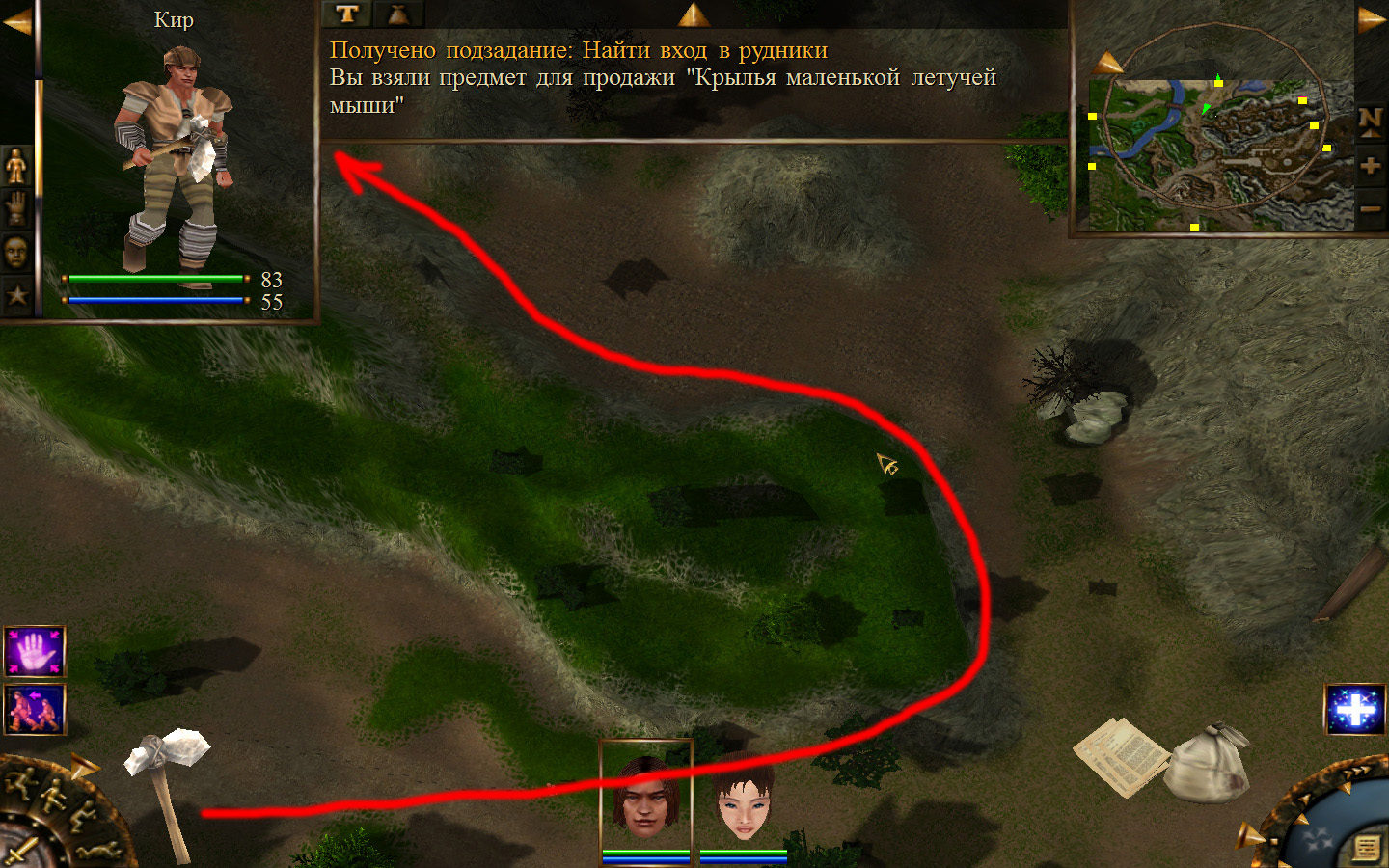 Выходим из магазина, дальше выходим из поселения орков в локацию Дальние горы. Двигаемся прямо от выхода из стойбища орков. Переходим через реку, на пути будут встречаться лягушки, убиваем по одной, не собираем всех вместе. Так же вдоль реки будут ходить речные ящеры, конечно же, пытаемся не сталкиваться с ними. Лучше всего пробираться ползком. Ползем дальше к розовому квадратику на карте. Убиваем диких животных. Добираемся до шахты и берем оттуда образцы. После чего возвращаемся в стойбище орков.