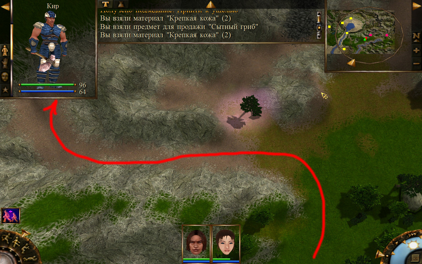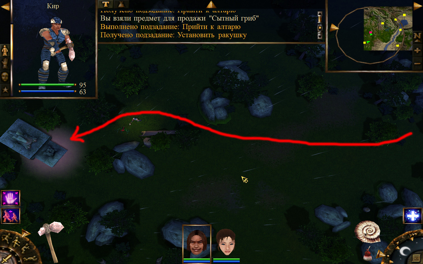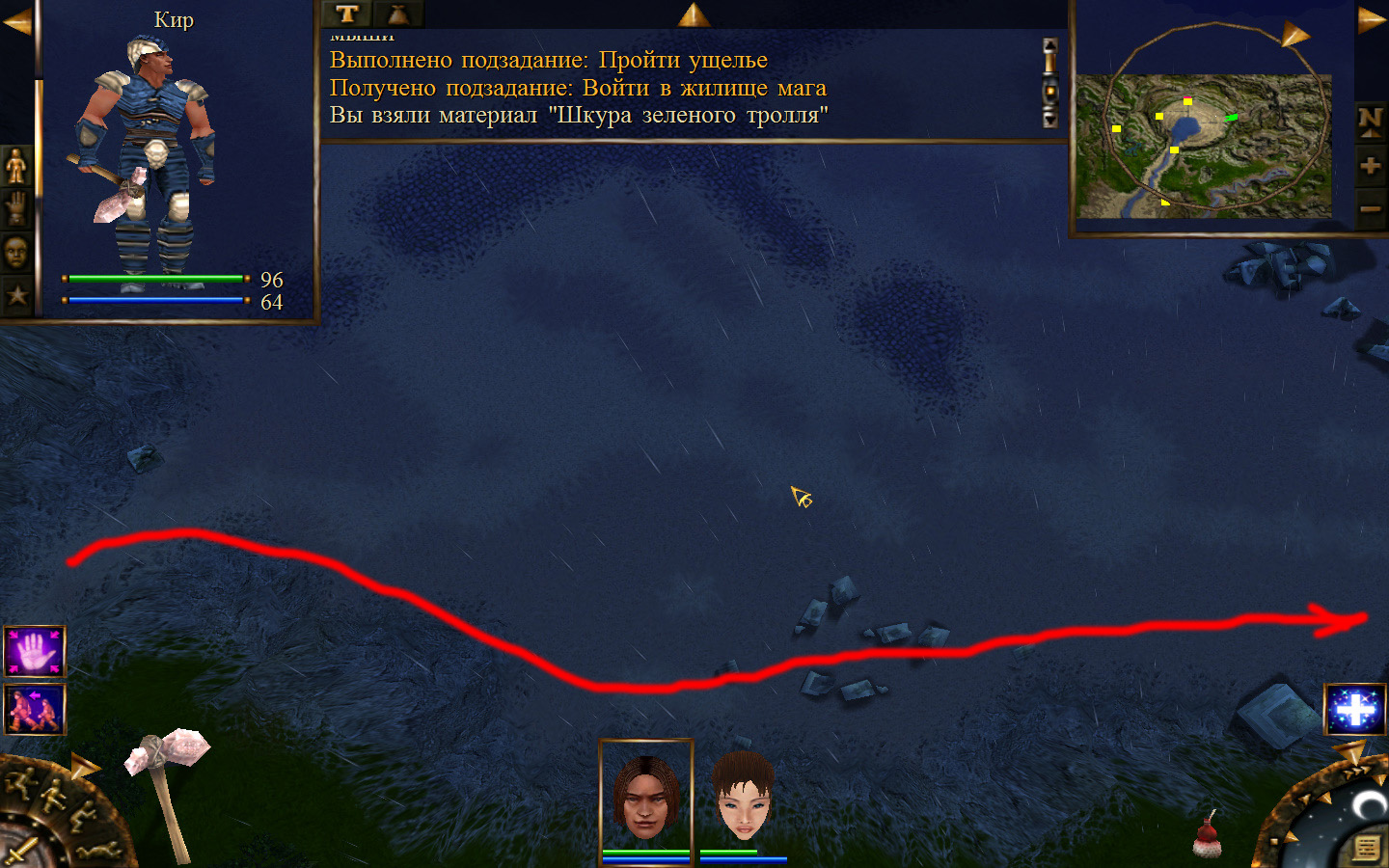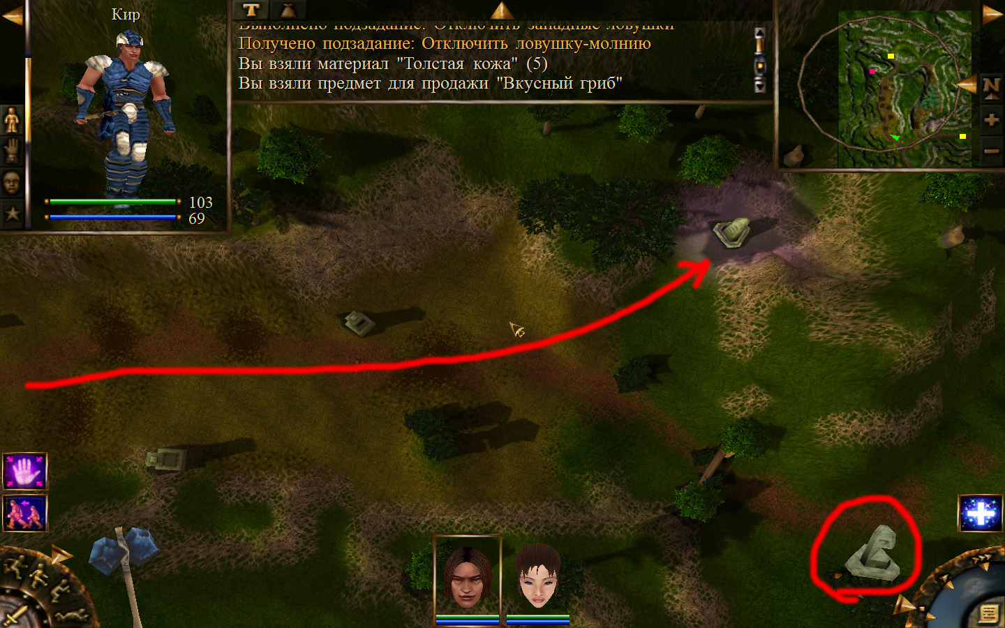 Выходим из магазина, дальше выходим из поселения орков в локацию Дальние горы. Двигаемся прямо от выхода из стойбища орков. Переходим через реку, на пути будут встречаться лягушки, убиваем по одной, не собираем всех вместе. Так же вдоль реки будут ходить речные ящеры, конечно же, пытаемся не сталкиваться с ними. Лучше всего пробираться ползком. Ползем дальше к розовому квадратику на карте. Убиваем диких животных. Добираемся до шахты и берем оттуда образцы. После чего возвращаемся в стойбище орков.