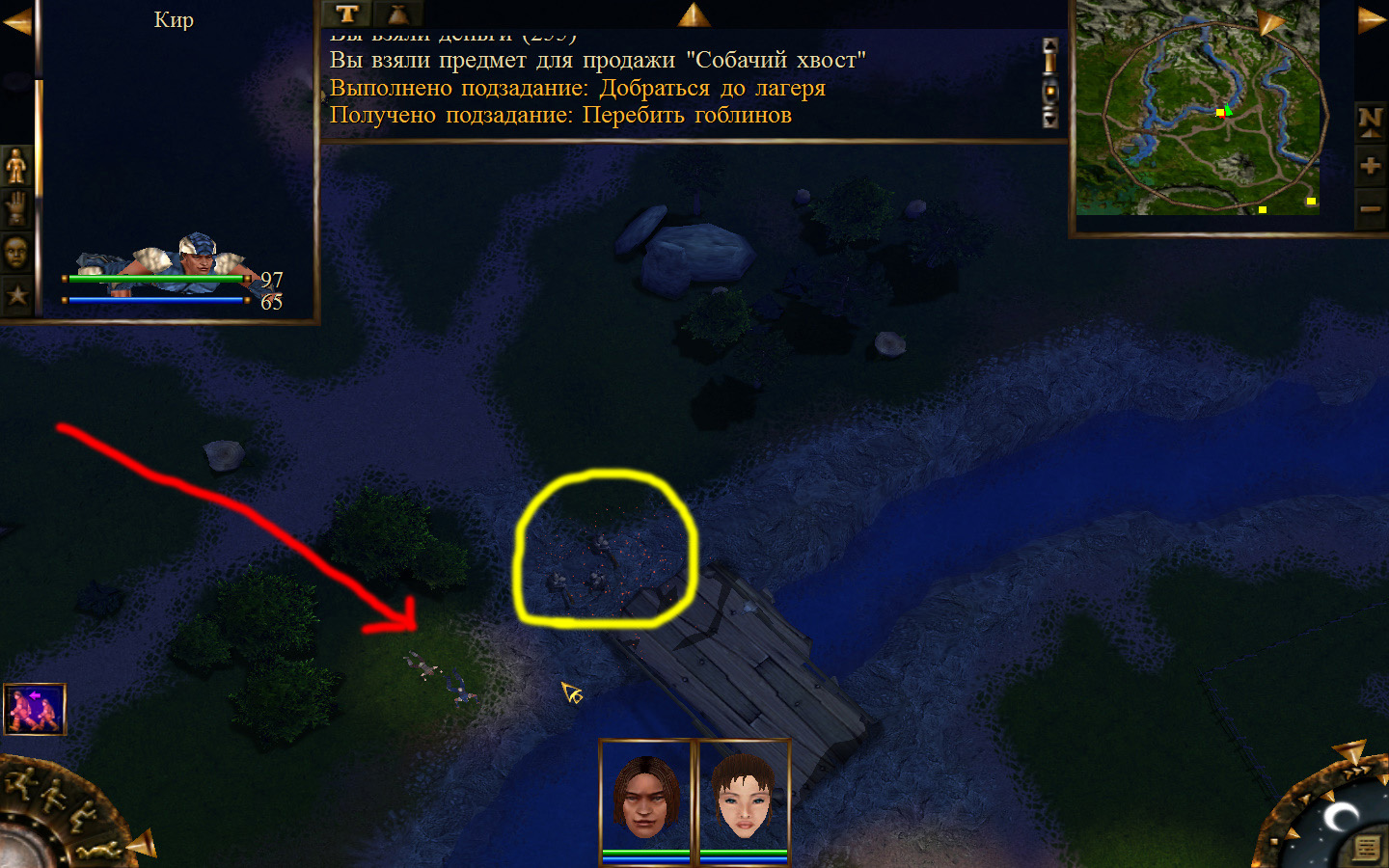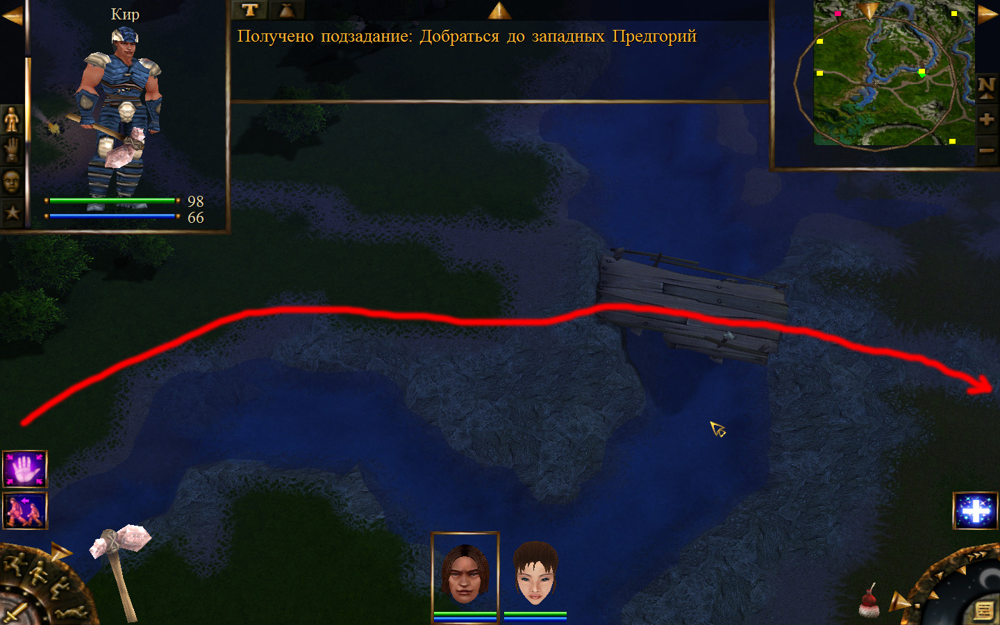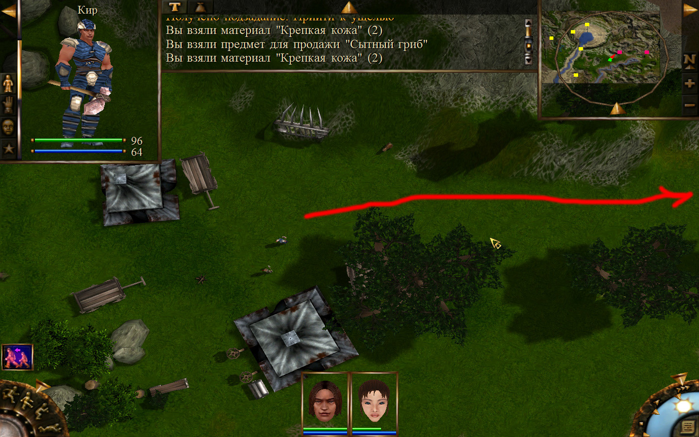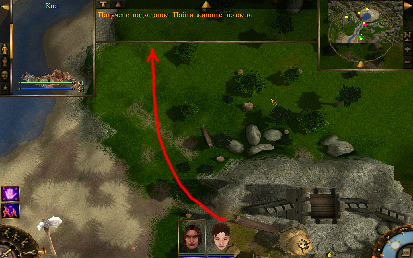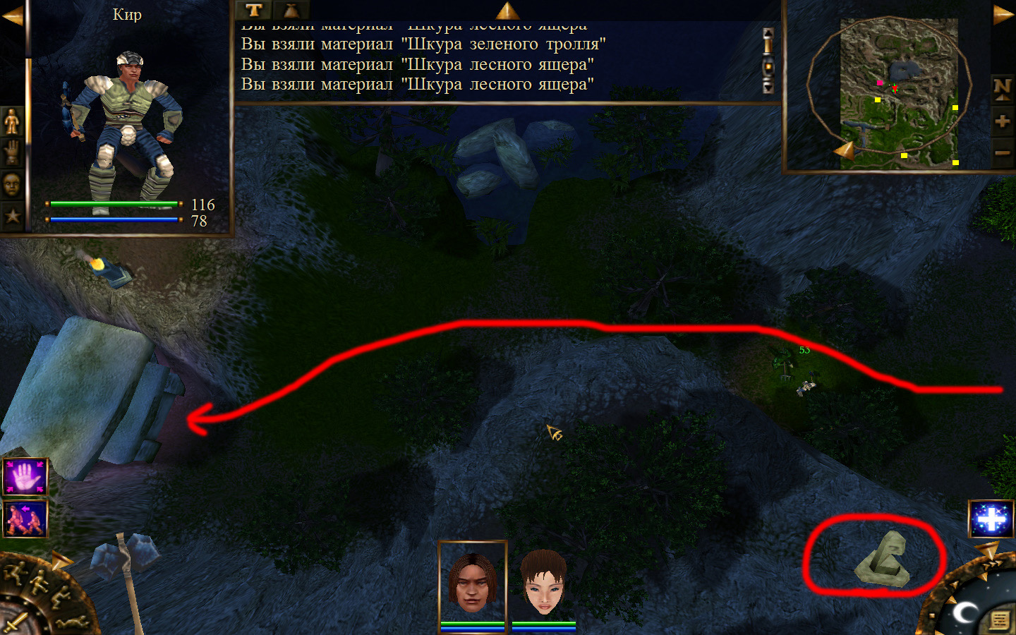 Выходим из магазина, дальше выходим из поселения орков в локацию Дальние горы. Двигаемся прямо от выхода из стойбища орков. Переходим через реку, на пути будут встречаться лягушки, убиваем по одной, не собираем всех вместе. Так же вдоль реки будут ходить речные ящеры, конечно же, пытаемся не сталкиваться с ними. Лучше всего пробираться ползком. Ползем дальше к розовому квадратику на карте. Убиваем диких животных. Добираемся до шахты и берем оттуда образцы. После чего возвращаемся в стойбище орков.