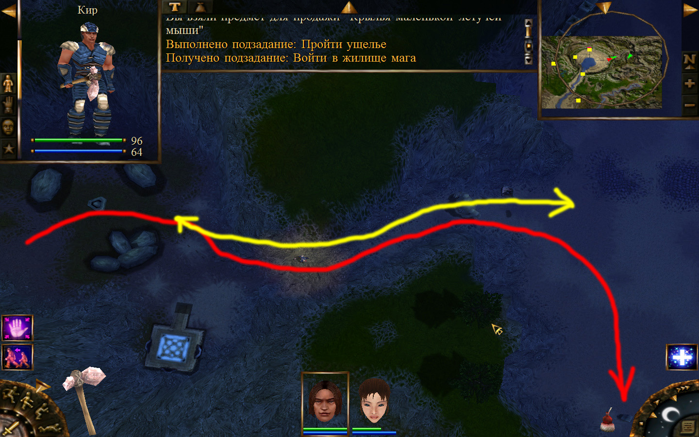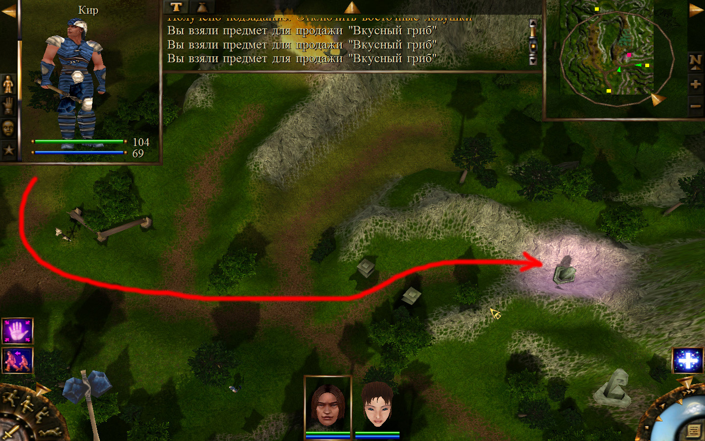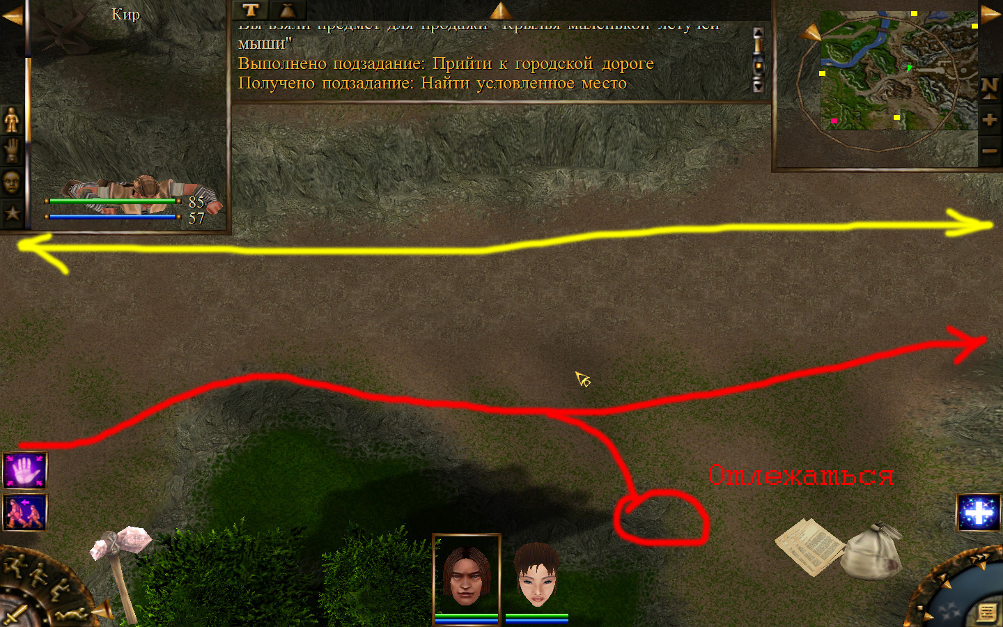 Выходим из орковского поселения в локацию Дальние горы, и идем направо (относительно выхода). Лучше находиться в режиме лежа, потому что наш персонаж снова не готов к обитателям данного аллода. Ползем вдоль обрыва, то есть вдоль реки, к розовому квадратику на карте там будет людоед. Необходимо заползти ему за спину и ждать, пока он не отвернется в сторону своего сундука, тогда подползти и украсть у него ключ. Далее, следуйте траектории на изображениях. Необходимо доползти до сундука, убивая при этом встречающихся диких животных. Лучше всего атакой со спины убивать врагов, но если не получилось, то не цеплять лучше нескольких врагов одновременно, а убивать по-одному. И вот, открыв сундук ключом и забрав оттуда документы, отправляемся обратно к оркам.