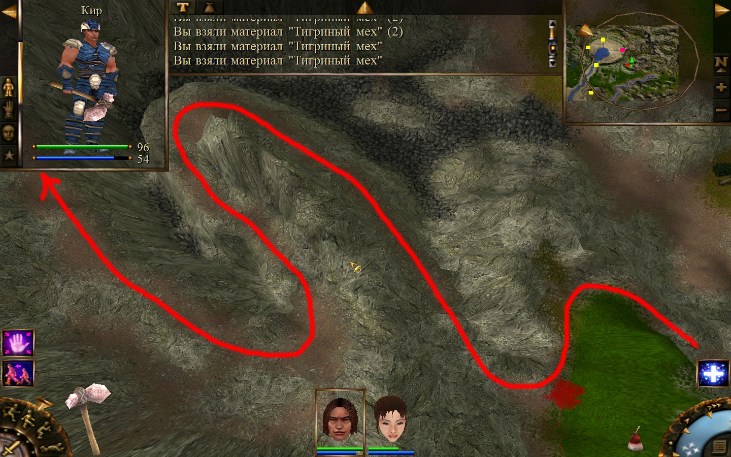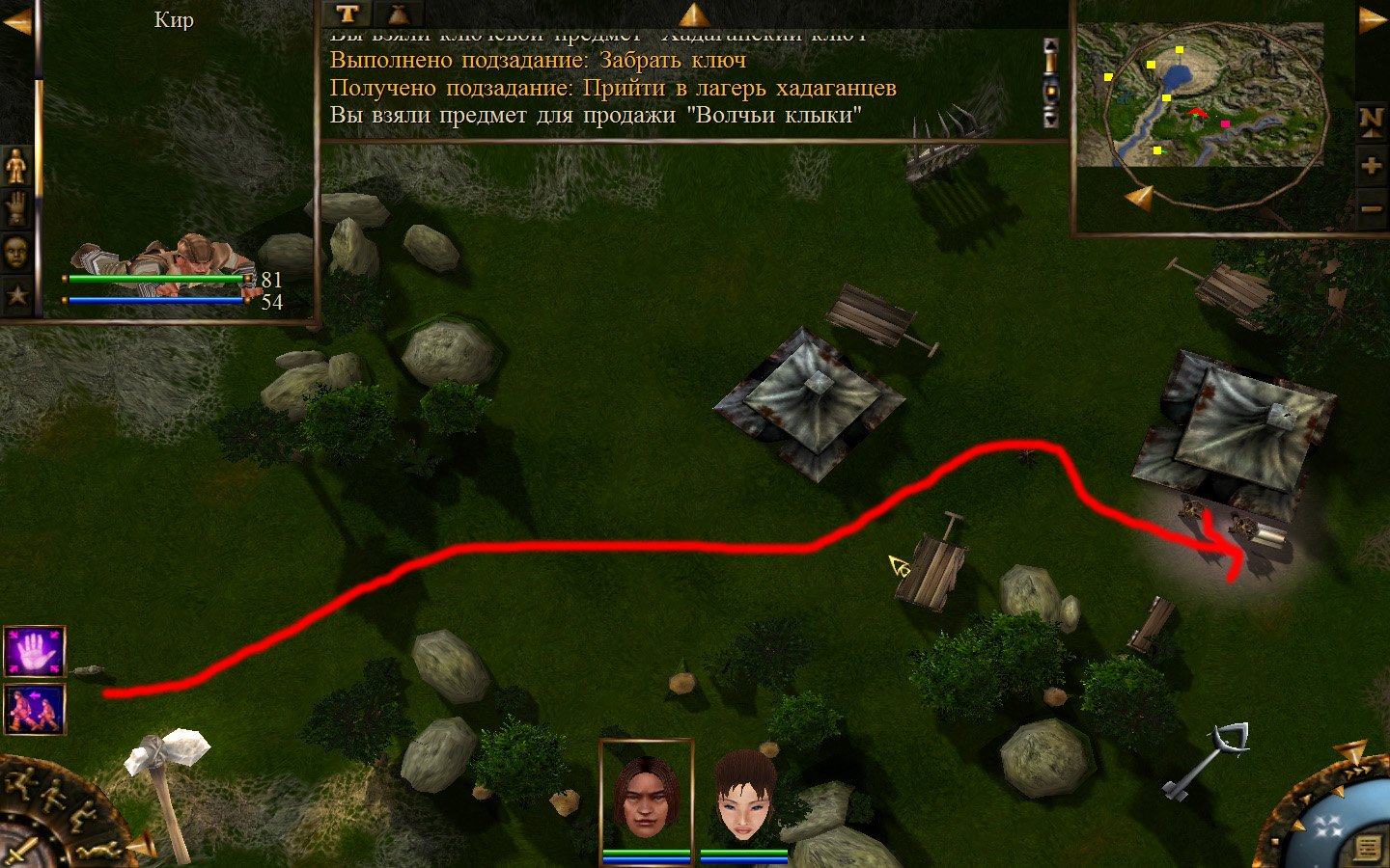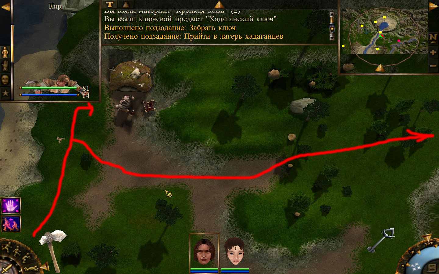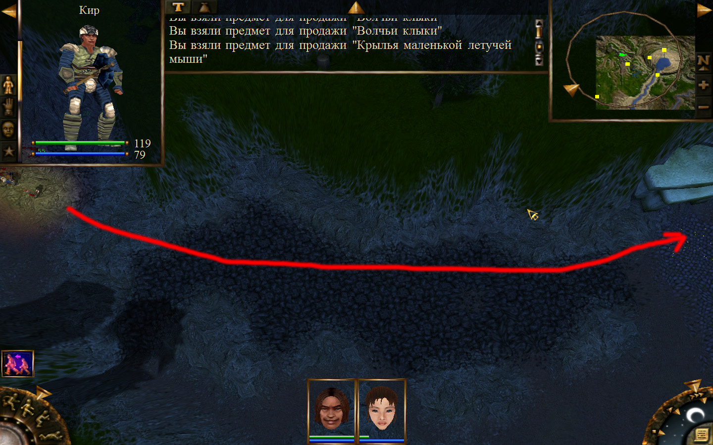 Выходим из орковского поселения в локацию Дальние горы, и идем направо (относительно выхода). Лучше находиться в режиме лежа, потому что наш персонаж снова не готов к обитателям данного аллода. Ползем вдоль обрыва, то есть вдоль реки, к розовому квадратику на карте там будет людоед. Необходимо заползти ему за спину и ждать, пока он не отвернется в сторону своего сундука, тогда подползти и украсть у него ключ. Далее, следуйте траектории на изображениях. Необходимо доползти до сундука, убивая при этом встречающихся диких животных. Лучше всего атакой со спины убивать врагов, но если не получилось, то не цеплять лучше нескольких врагов одновременно, а убивать по-одному. И вот, открыв сундук ключом и забрав оттуда документы, отправляемся обратно к оркам.