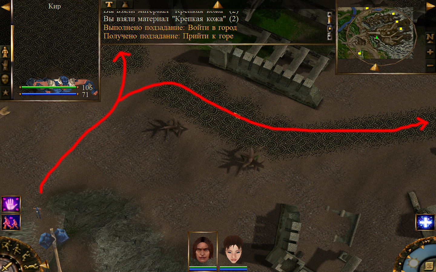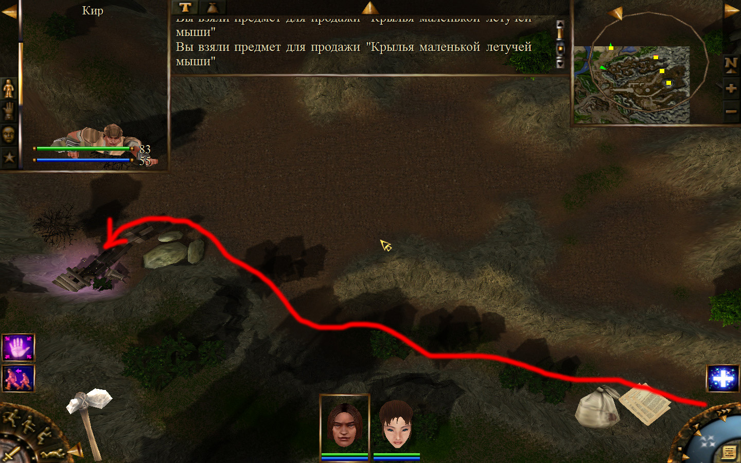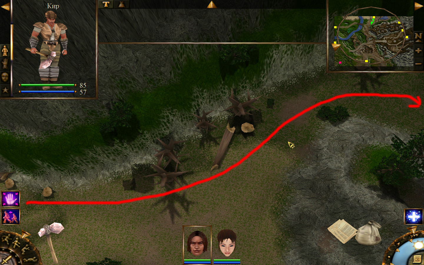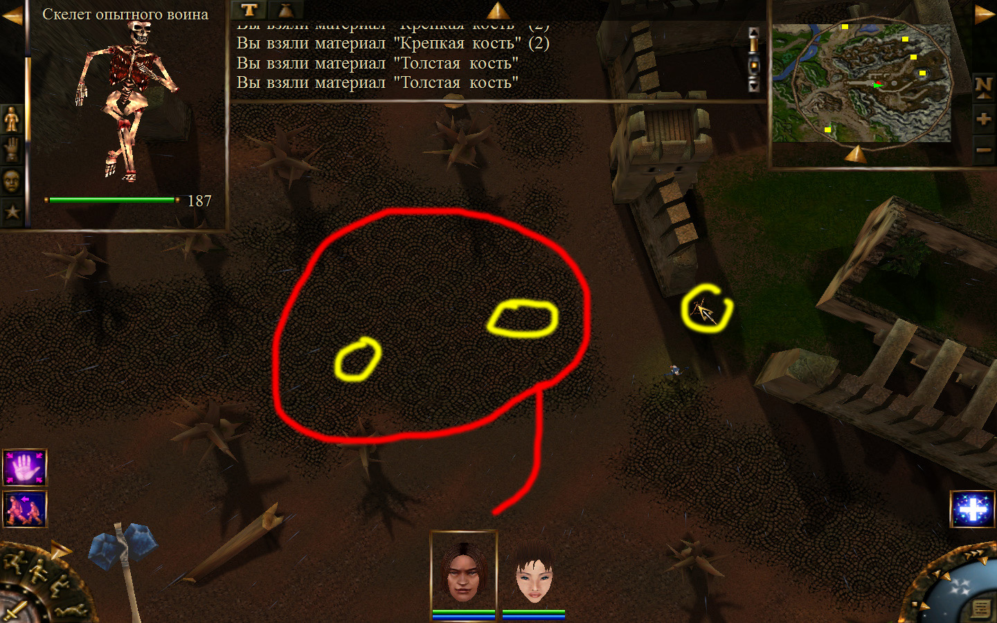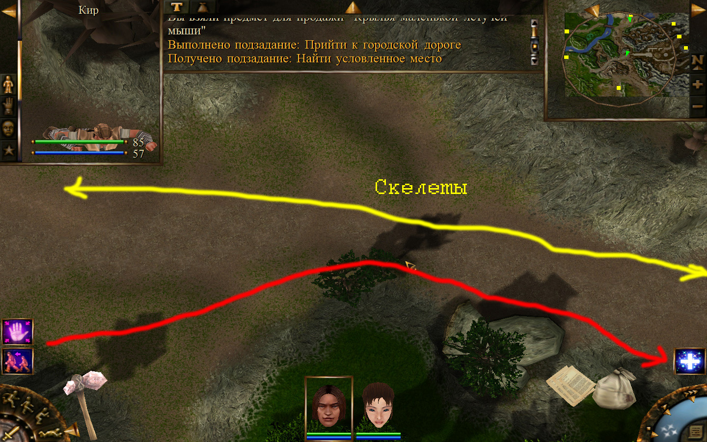 И снова выходим из стойбища, но уже в локацию Мертвый город. Кель оставляем у перехода между локациями, Кира ведем к шахте, указанной на карте розовым квадратом. На самом деле, нужно проползти вдоль хребта, обогнуть его и ползти так же вдоль того же хребта в сторону шахты. И вот тут-то самое интересное. Там обитают Скелеты простолюдинов. Тактика такова – необходимо бить скелету по ногам, потом в тело. Если удар, нанесенный скелетом, оказался успешным (как правило, так бывает редко, а если и бывает, то удар приходится главному персонажу по голове – это очень опасно), то необходимо отбежать и вылечиться, пока скелет, хромая, будет идти за Киром. Лучше всего не сталкиваться с группами, а убивать врагов по одному. (Максимальное количество, с которым я столкнулся, было 2 (все та же тактика, только по отношению к обоим врагам)).