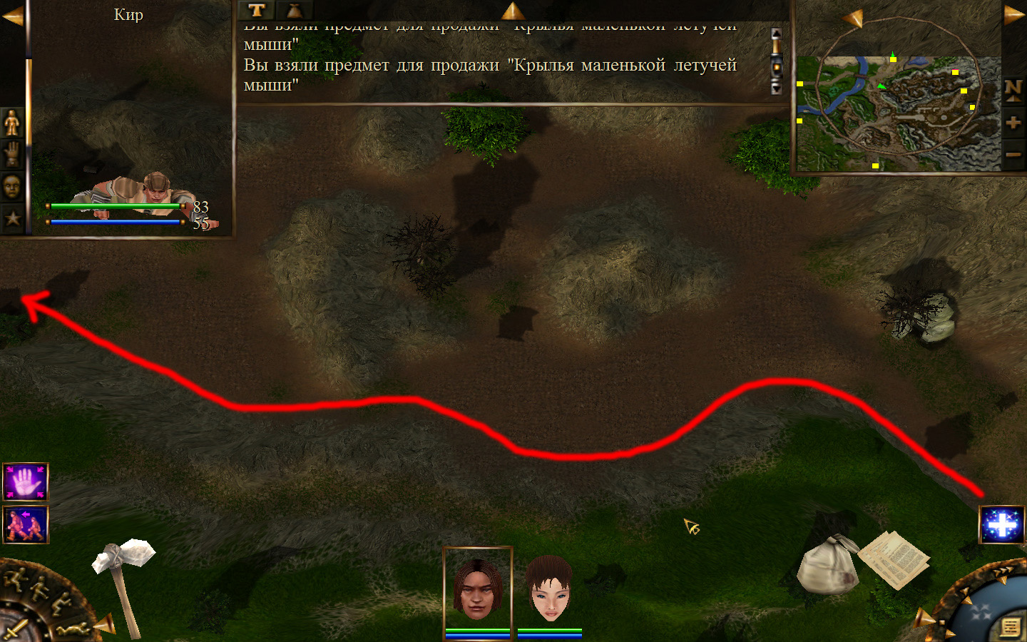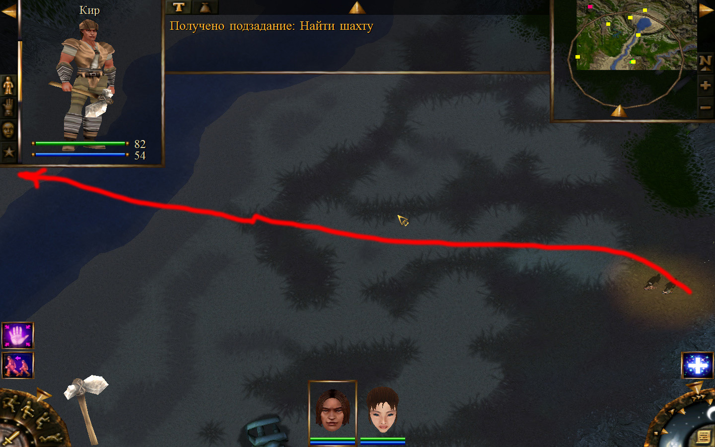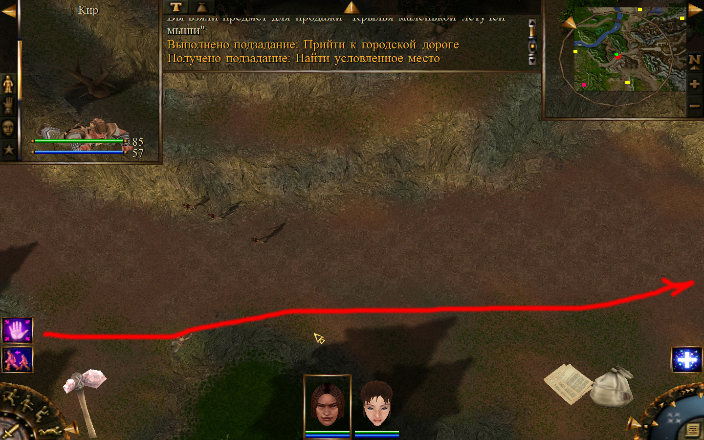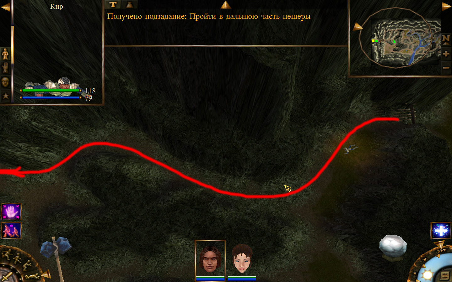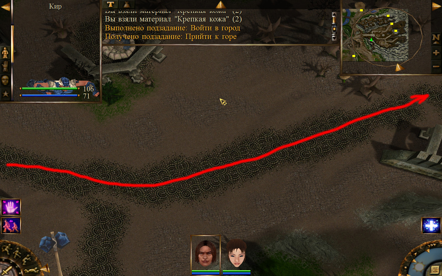 И снова выходим из стойбища, но уже в локацию Мертвый город. Кель оставляем у перехода между локациями, Кира ведем к шахте, указанной на карте розовым квадратом. На самом деле, нужно проползти вдоль хребта, обогнуть его и ползти так же вдоль того же хребта в сторону шахты. И вот тут-то самое интересное. Там обитают Скелеты простолюдинов. Тактика такова – необходимо бить скелету по ногам, потом в тело. Если удар, нанесенный скелетом, оказался успешным (как правило, так бывает редко, а если и бывает, то удар приходится главному персонажу по голове – это очень опасно), то необходимо отбежать и вылечиться, пока скелет, хромая, будет идти за Киром. Лучше всего не сталкиваться с группами, а убивать врагов по одному. (Максимальное количество, с которым я столкнулся, было 2 (все та же тактика, только по отношению к обоим врагам)).
