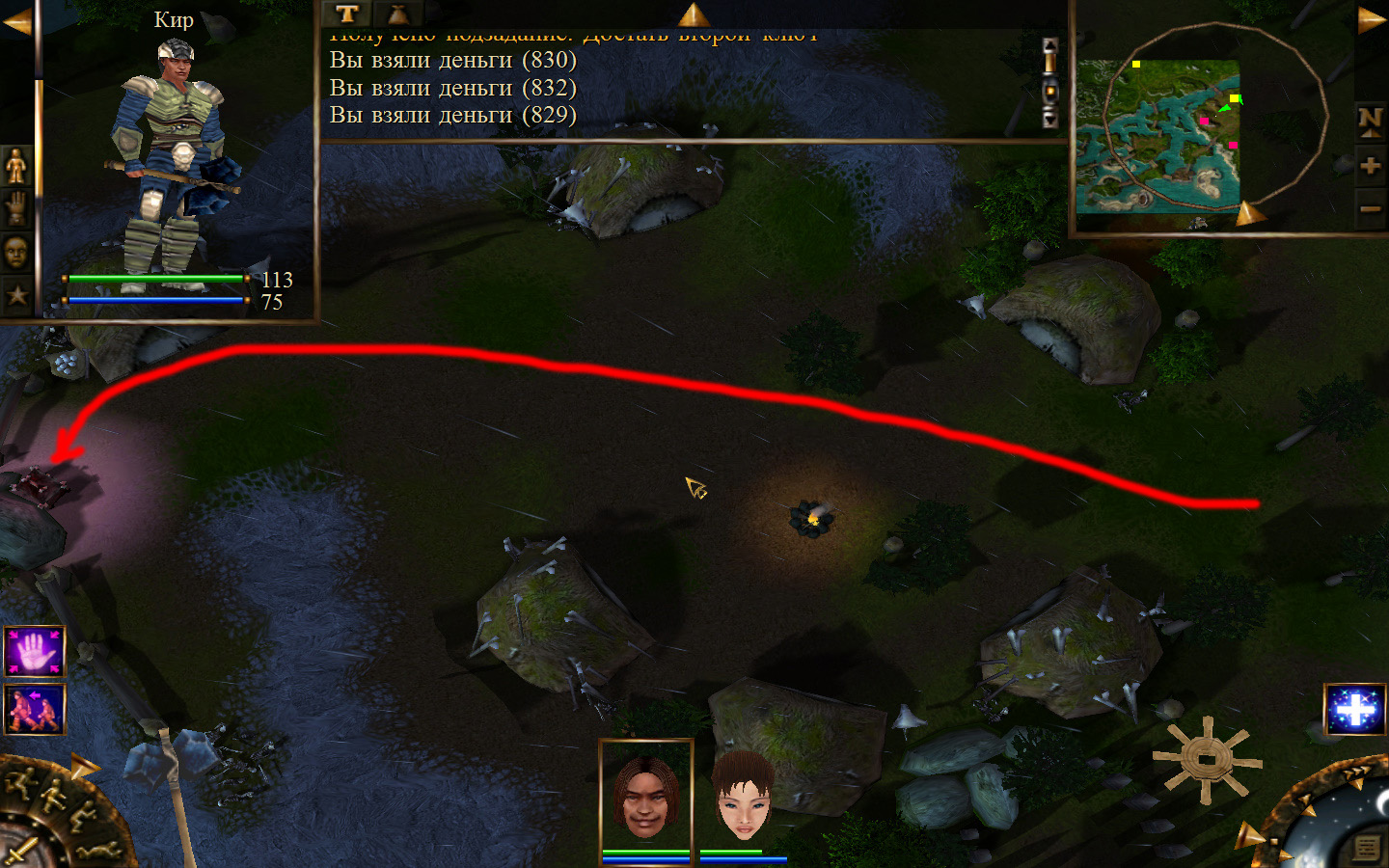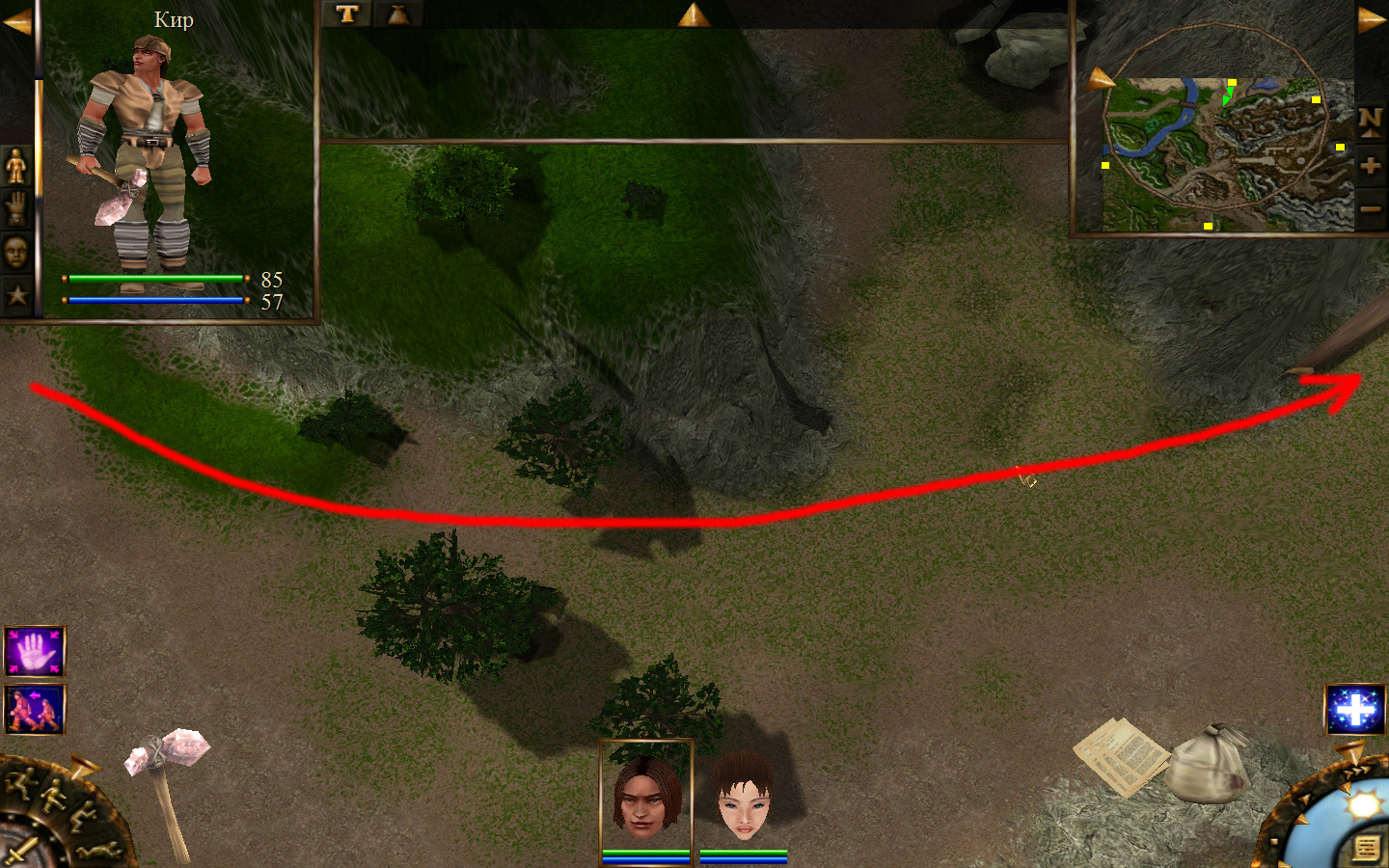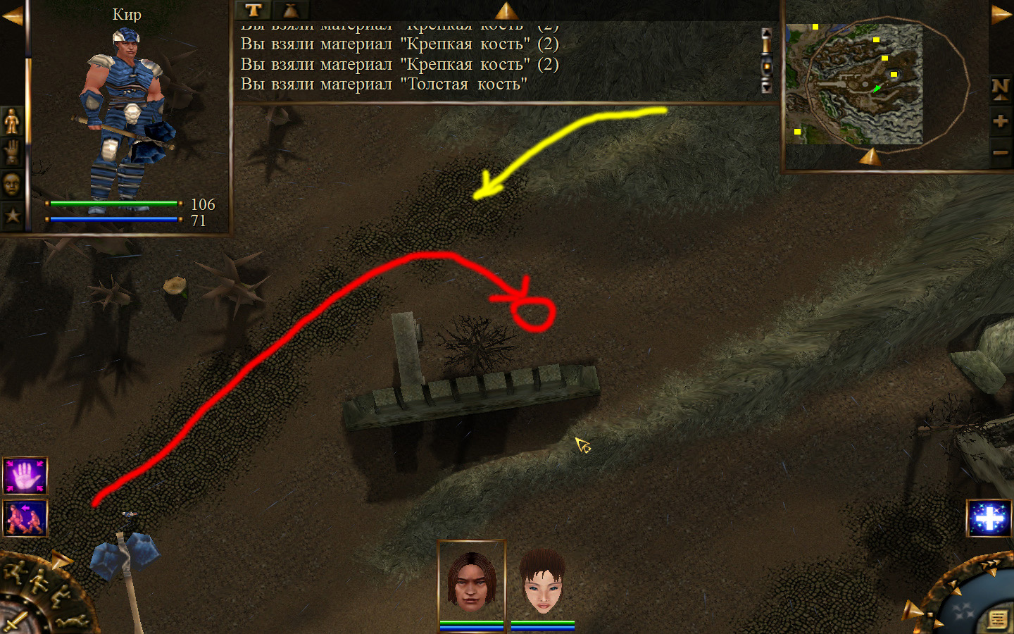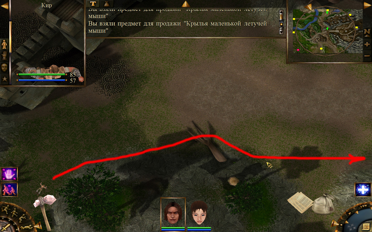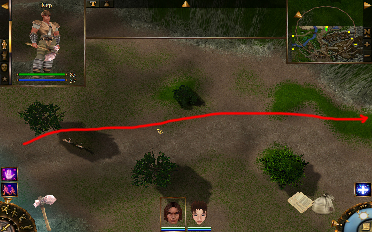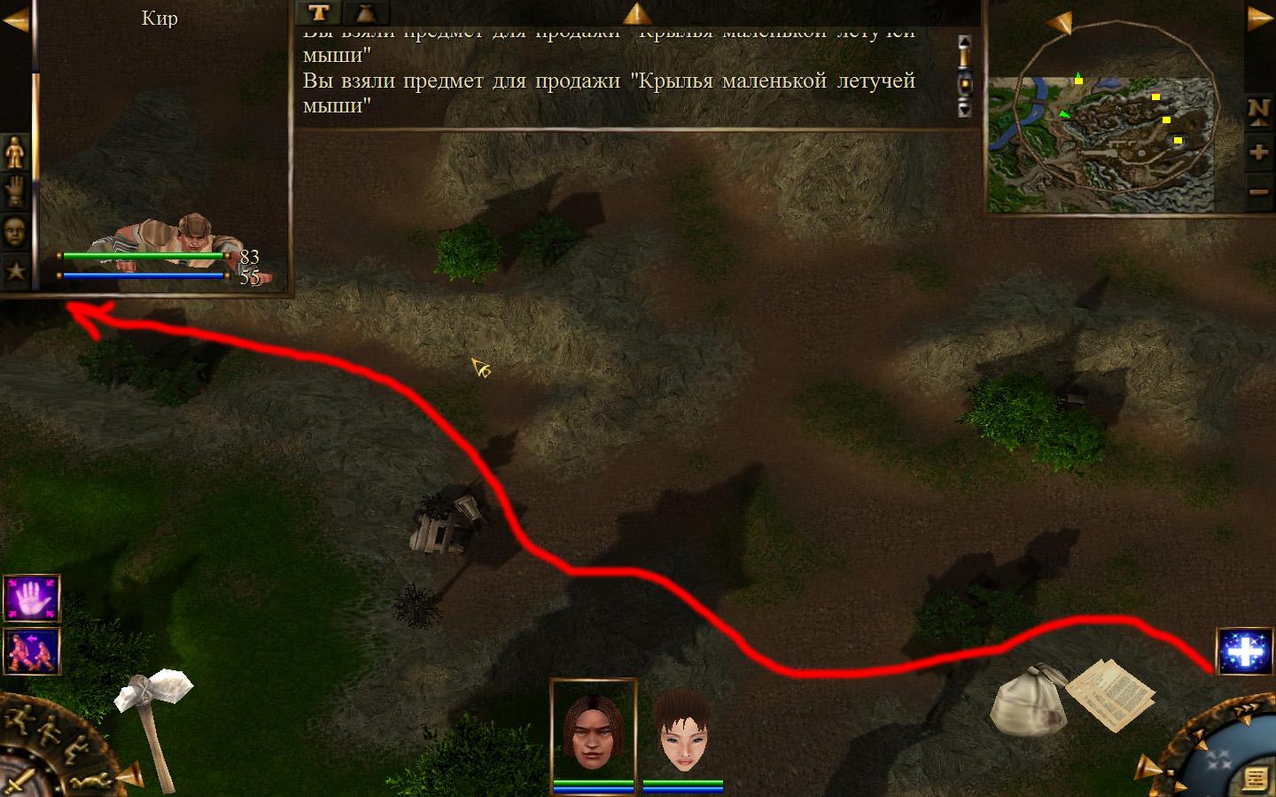 И снова выходим из стойбища, но уже в локацию Мертвый город. Кель оставляем у перехода между локациями, Кира ведем к шахте, указанной на карте розовым квадратом. На самом деле, нужно проползти вдоль хребта, обогнуть его и ползти так же вдоль того же хребта в сторону шахты. И вот тут-то самое интересное. Там обитают Скелеты простолюдинов. Тактика такова – необходимо бить скелету по ногам, потом в тело. Если удар, нанесенный скелетом, оказался успешным (как правило, так бывает редко, а если и бывает, то удар приходится главному персонажу по голове – это очень опасно), то необходимо отбежать и вылечиться, пока скелет, хромая, будет идти за Киром. Лучше всего не сталкиваться с группами, а убивать врагов по одному. (Максимальное количество, с которым я столкнулся, было 2 (все та же тактика, только по отношению к обоим врагам)).