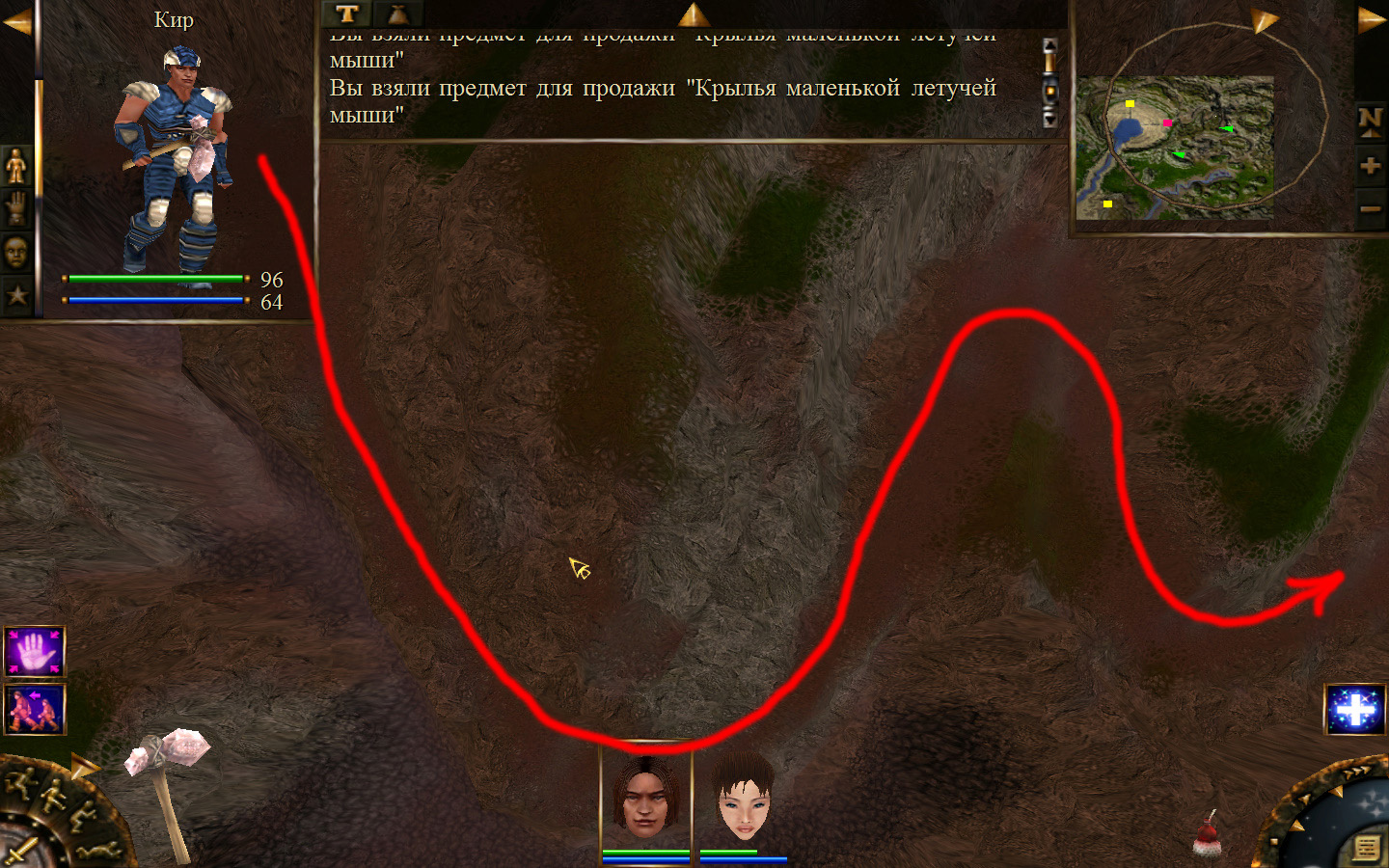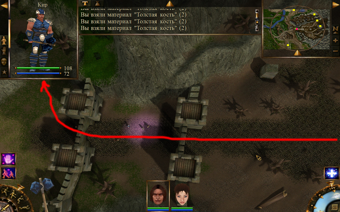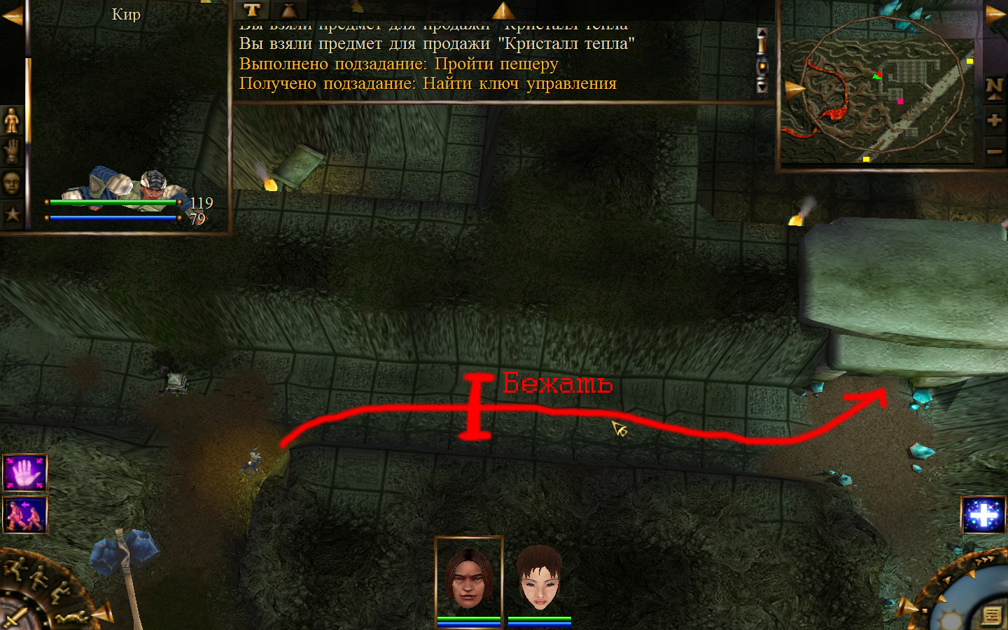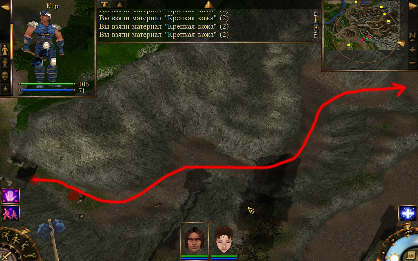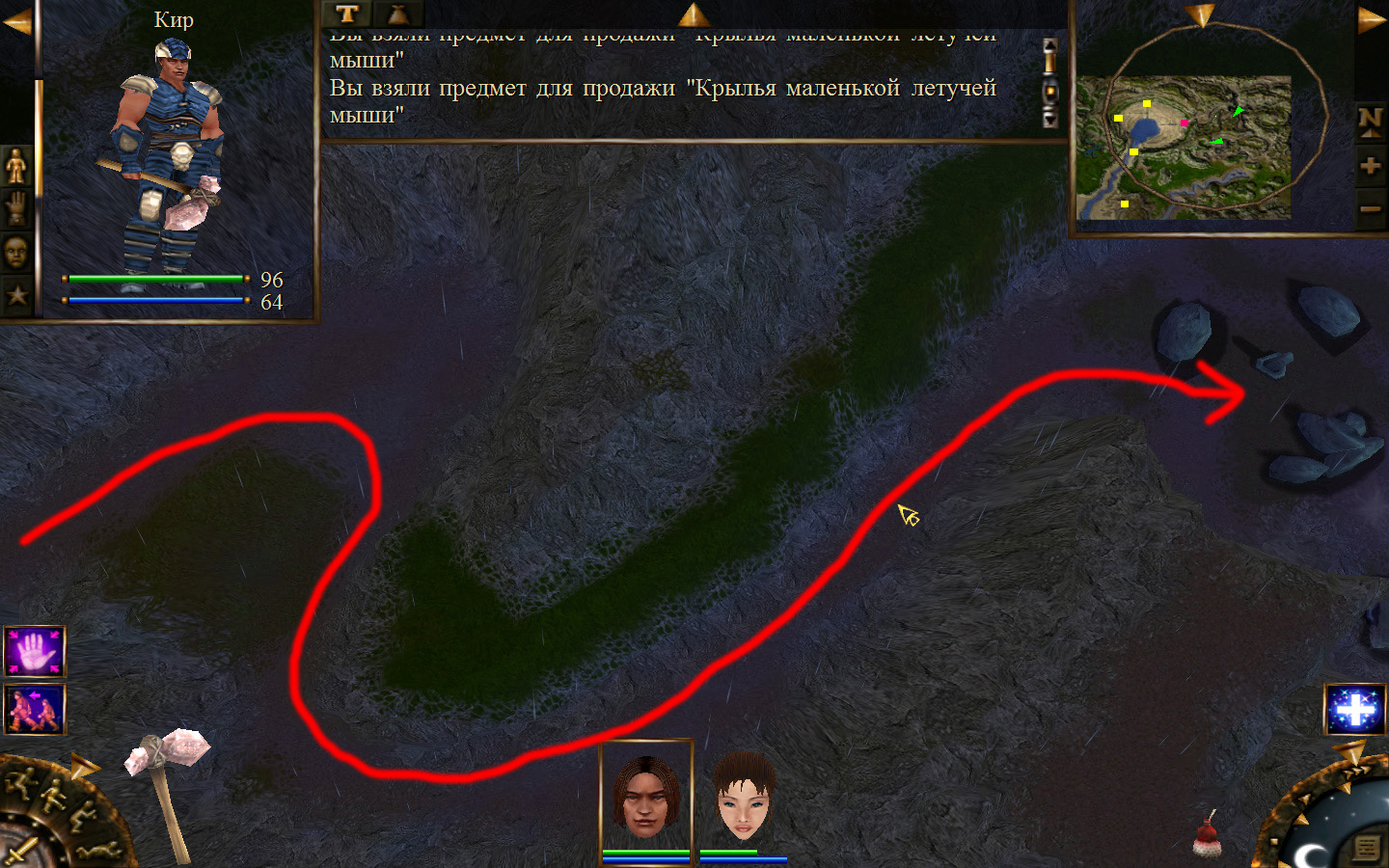 И снова выходим из стойбища, но уже в локацию Мертвый город. Кель оставляем у перехода между локациями, Кира ведем к шахте, указанной на карте розовым квадратом. На самом деле, нужно проползти вдоль хребта, обогнуть его и ползти так же вдоль того же хребта в сторону шахты. И вот тут-то самое интересное. Там обитают Скелеты простолюдинов. Тактика такова – необходимо бить скелету по ногам, потом в тело. Если удар, нанесенный скелетом, оказался успешным (как правило, так бывает редко, а если и бывает, то удар приходится главному персонажу по голове – это очень опасно), то необходимо отбежать и вылечиться, пока скелет, хромая, будет идти за Киром. Лучше всего не сталкиваться с группами, а убивать врагов по одному. (Максимальное количество, с которым я столкнулся, было 2 (все та же тактика, только по отношению к обоим врагам)).