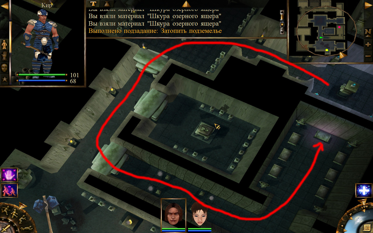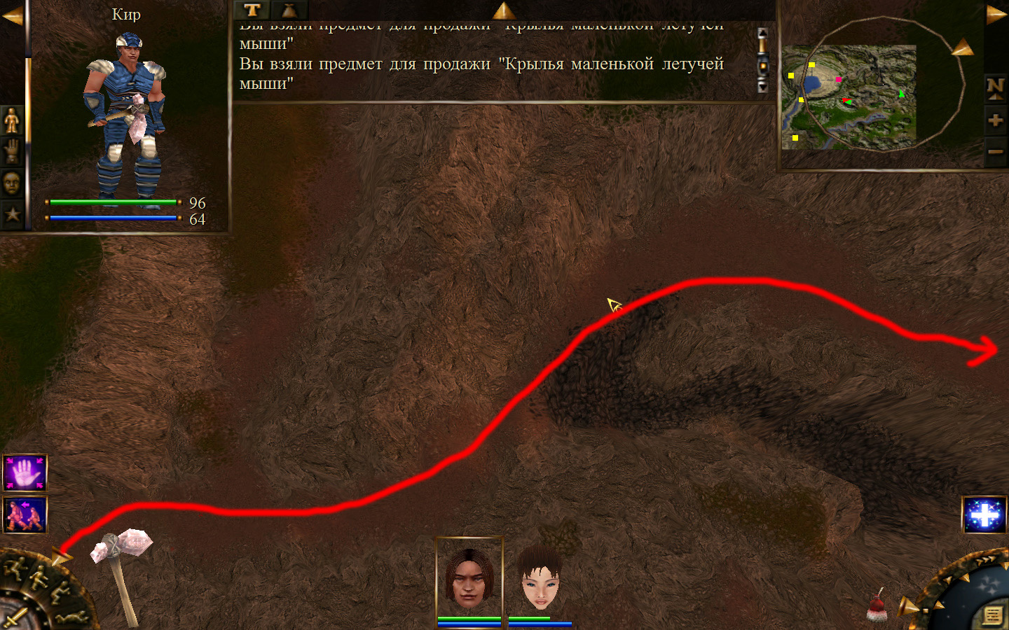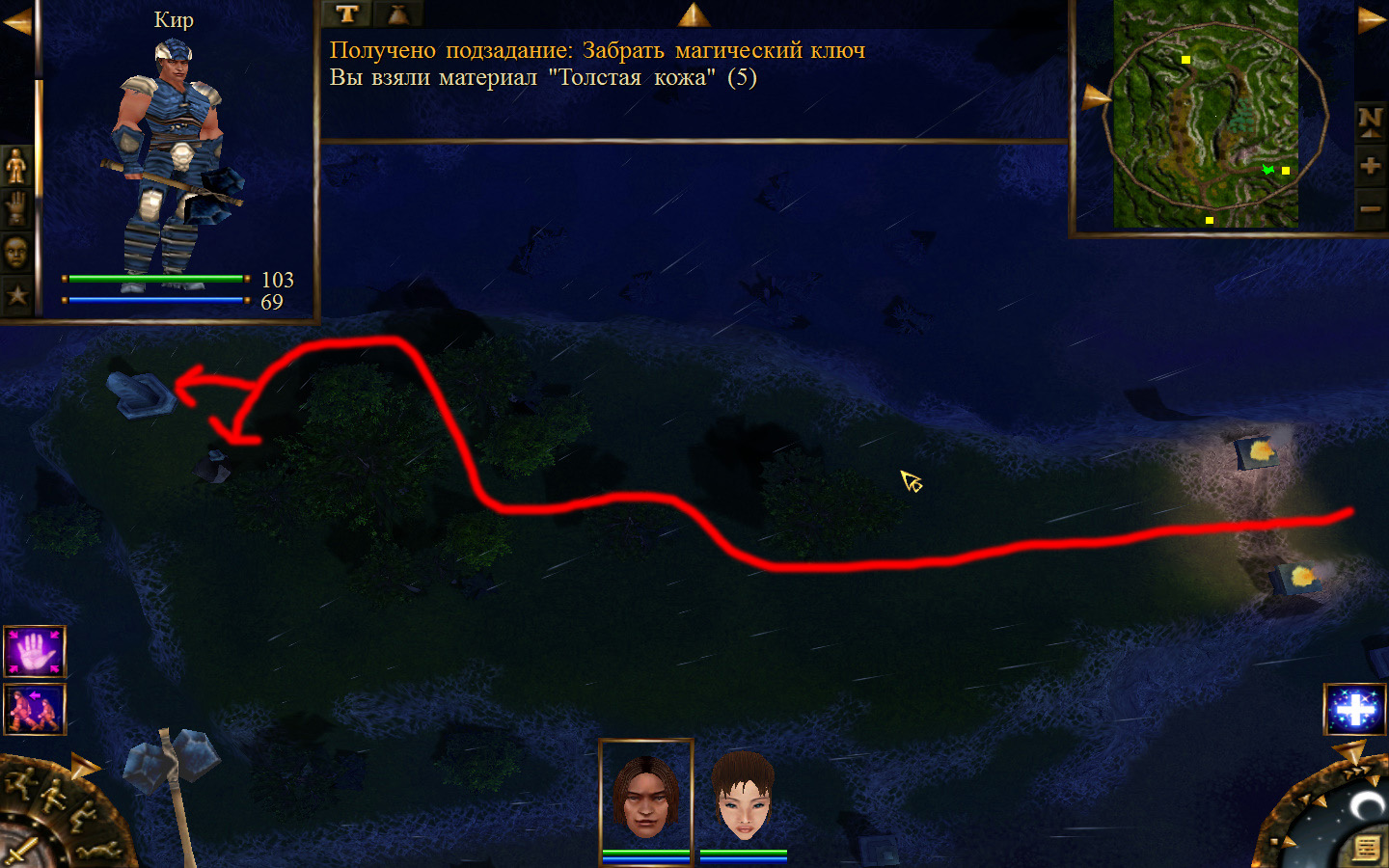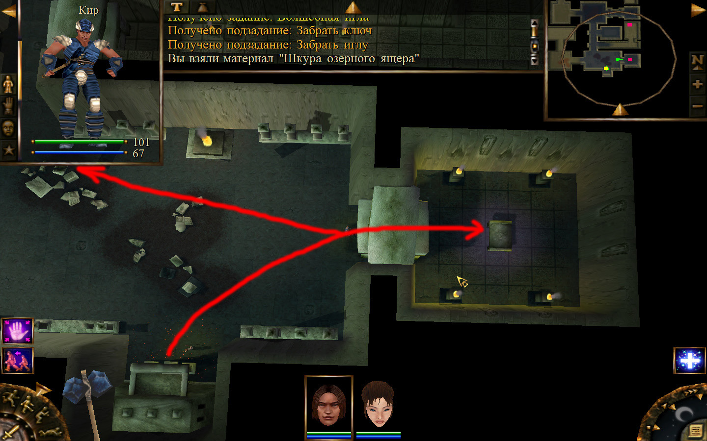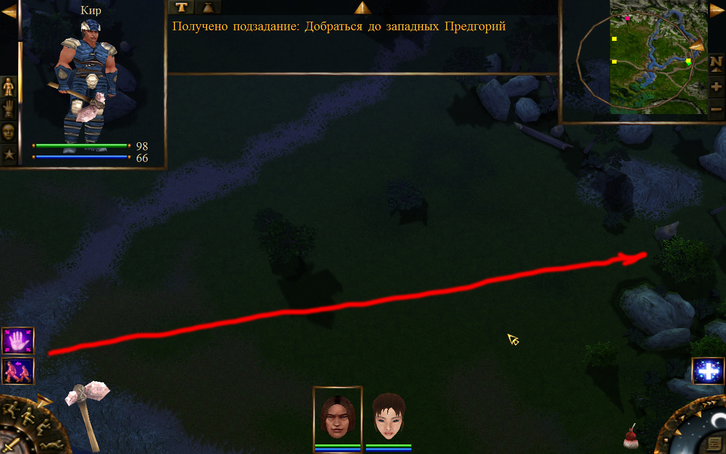 И снова выходим из стойбища, но уже в локацию Мертвый город. Кель оставляем у перехода между локациями, Кира ведем к шахте, указанной на карте розовым квадратом. На самом деле, нужно проползти вдоль хребта, обогнуть его и ползти так же вдоль того же хребта в сторону шахты. И вот тут-то самое интересное. Там обитают Скелеты простолюдинов. Тактика такова – необходимо бить скелету по ногам, потом в тело. Если удар, нанесенный скелетом, оказался успешным (как правило, так бывает редко, а если и бывает, то удар приходится главному персонажу по голове – это очень опасно), то необходимо отбежать и вылечиться, пока скелет, хромая, будет идти за Киром. Лучше всего не сталкиваться с группами, а убивать врагов по одному. (Максимальное количество, с которым я столкнулся, было 2 (все та же тактика, только по отношению к обоим врагам)).