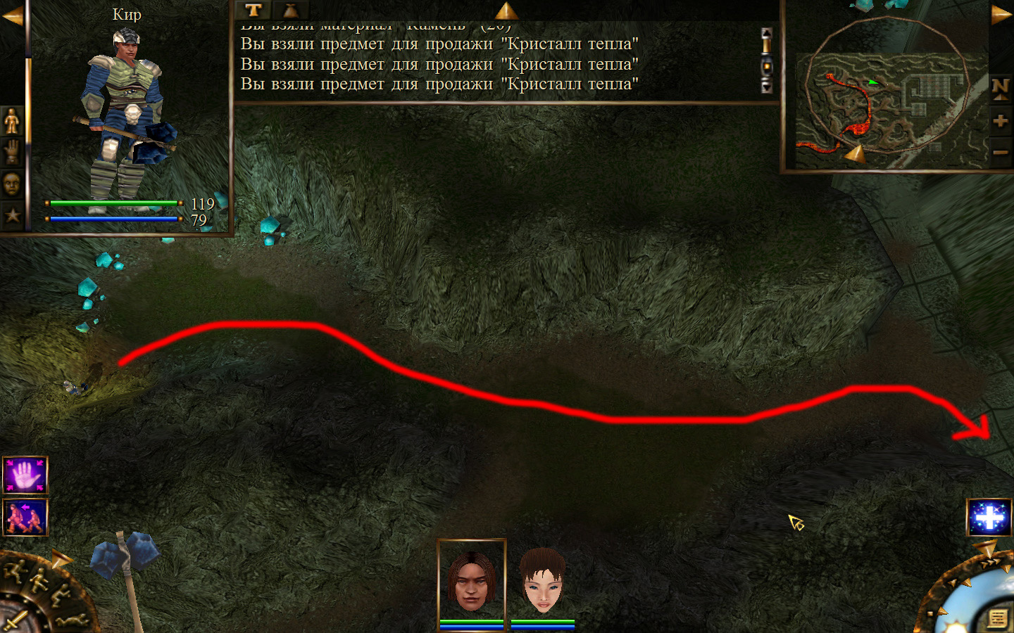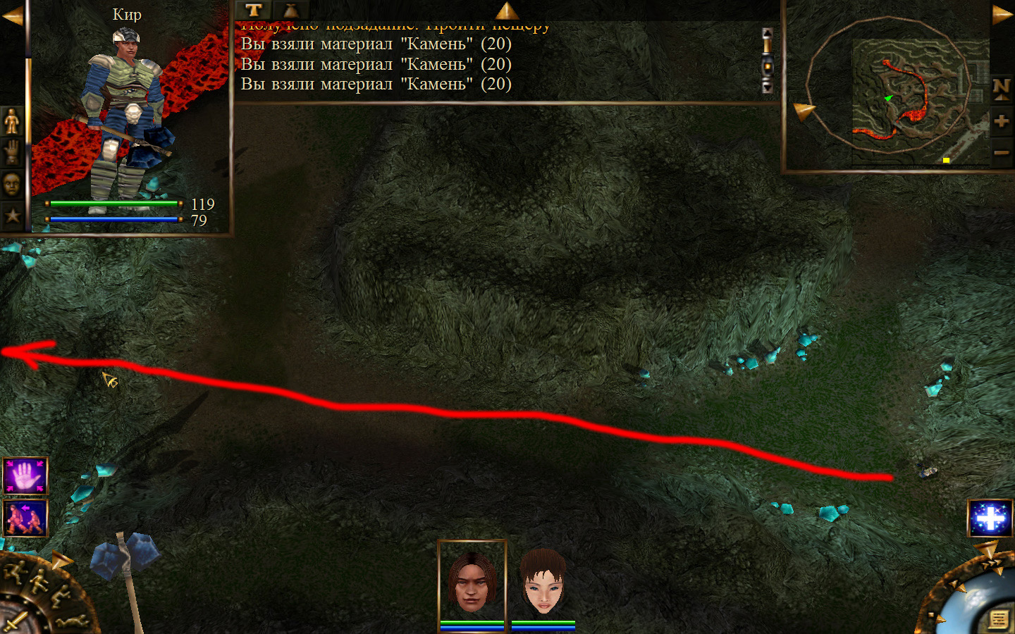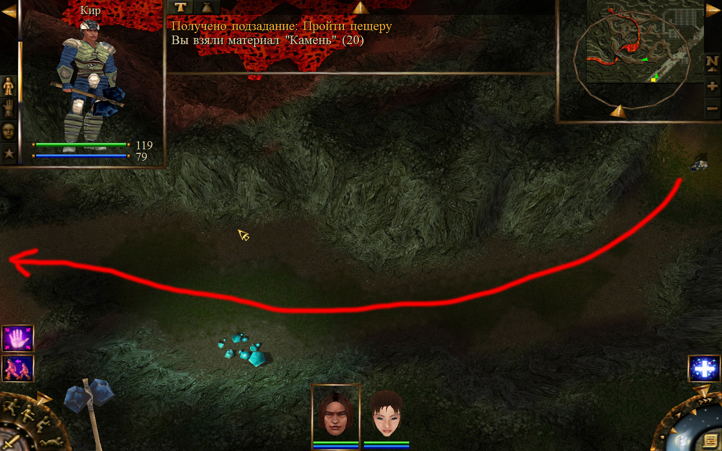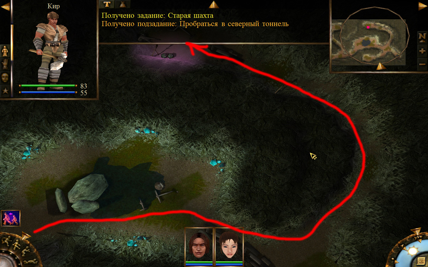 Еще в ущелье встретятся блуждающие огоньки. С ними справиться не сложно, если не нападать на группу (у них магическая атака). Когда расчистили путь до шахты отправляем по тому же пути Кель и заходим в шахту. Необходимо добраться до противоположного конца шахты и забрать породу там, где указан розовый квадратик на карте. Но я бы посоветовал пройти всю шахту и убить всех скелетов (я так сделал). А самое главное необходимо собирать камни из тачек (я их так называю, увидите на скрине, что это значит).