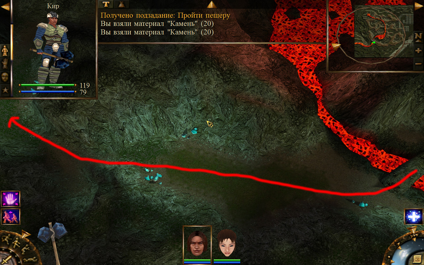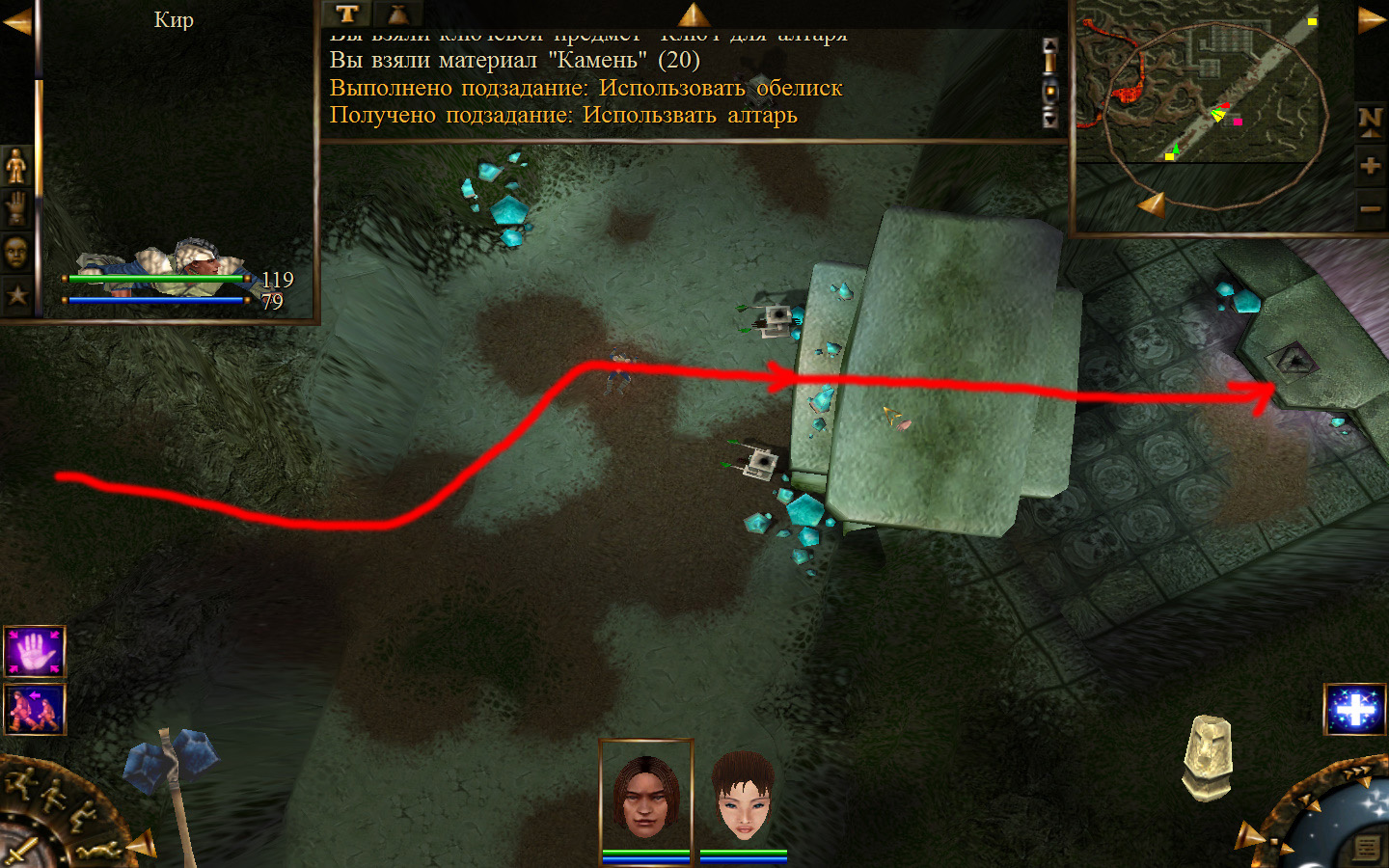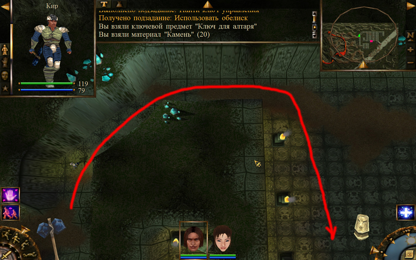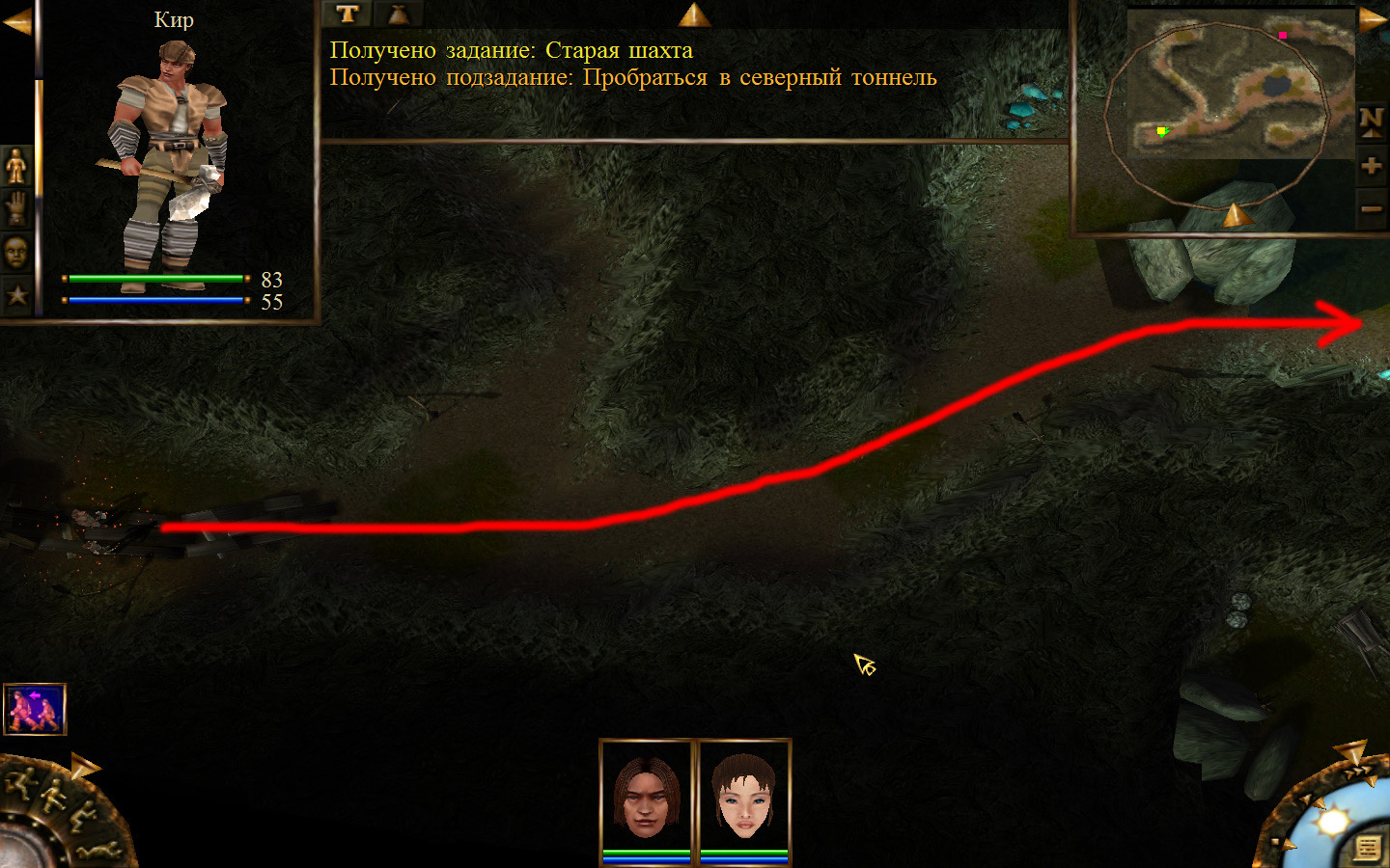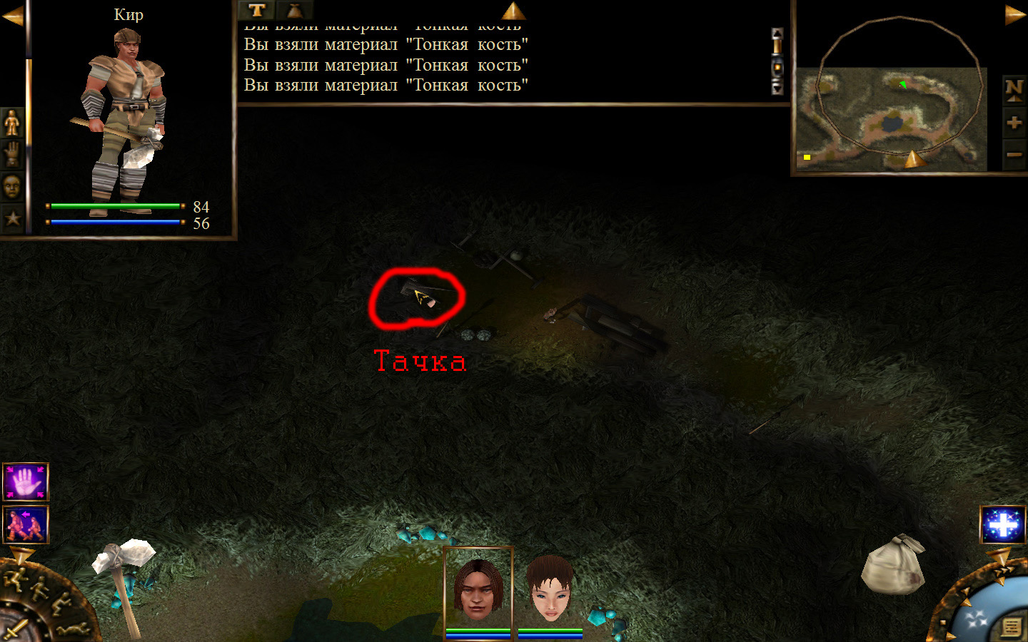 Еще в ущелье встретятся блуждающие огоньки. С ними справиться не сложно, если не нападать на группу (у них магическая атака). Когда расчистили путь до шахты отправляем по тому же пути Кель и заходим в шахту. Необходимо добраться до противоположного конца шахты и забрать породу там, где указан розовый квадратик на карте. Но я бы посоветовал пройти всю шахту и убить всех скелетов (я так сделал). А самое главное необходимо собирать камни из тачек (я их так называю, увидите на скрине, что это значит).