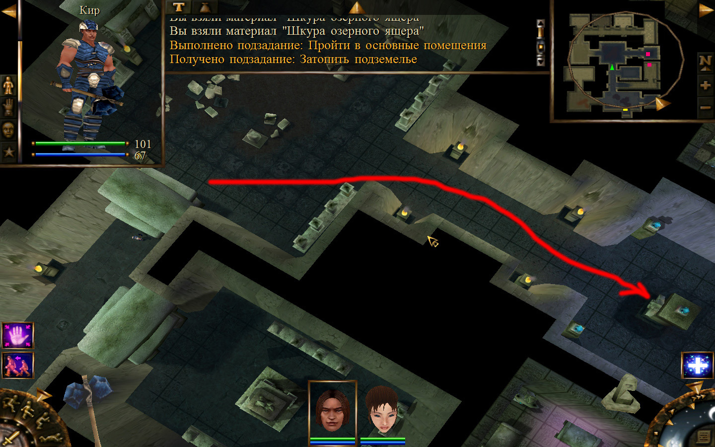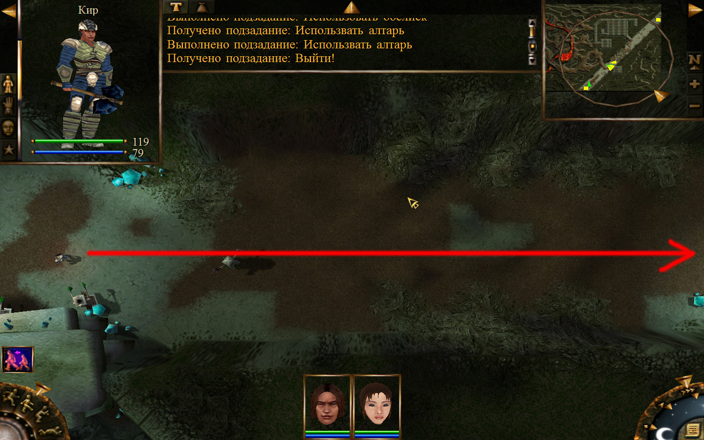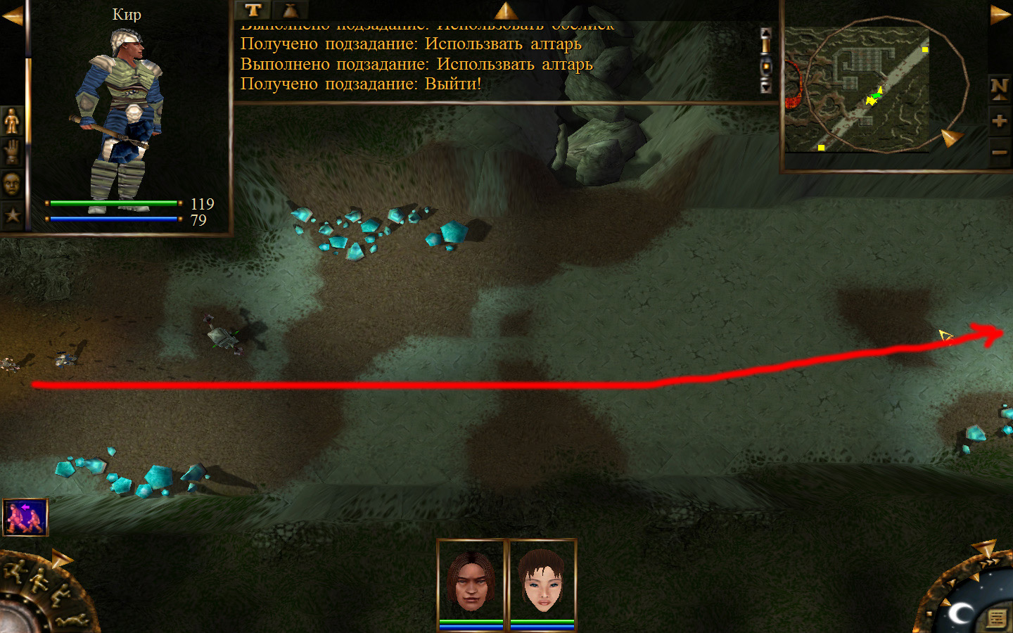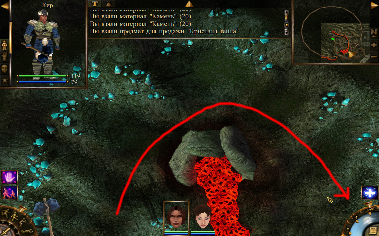 Еще в ущелье встретятся блуждающие огоньки. С ними справиться не сложно, если не нападать на группу (у них магическая атака). Когда расчистили путь до шахты отправляем по тому же пути Кель и заходим в шахту. Необходимо добраться до противоположного конца шахты и забрать породу там, где указан розовый квадратик на карте. Но я бы посоветовал пройти всю шахту и убить всех скелетов (я так сделал). А самое главное необходимо собирать камни из тачек (я их так называю, увидите на скрине, что это значит).