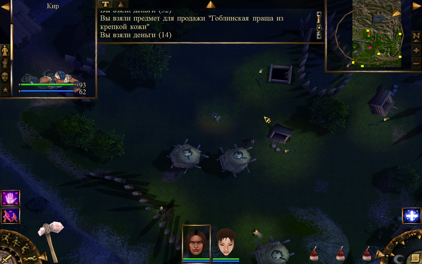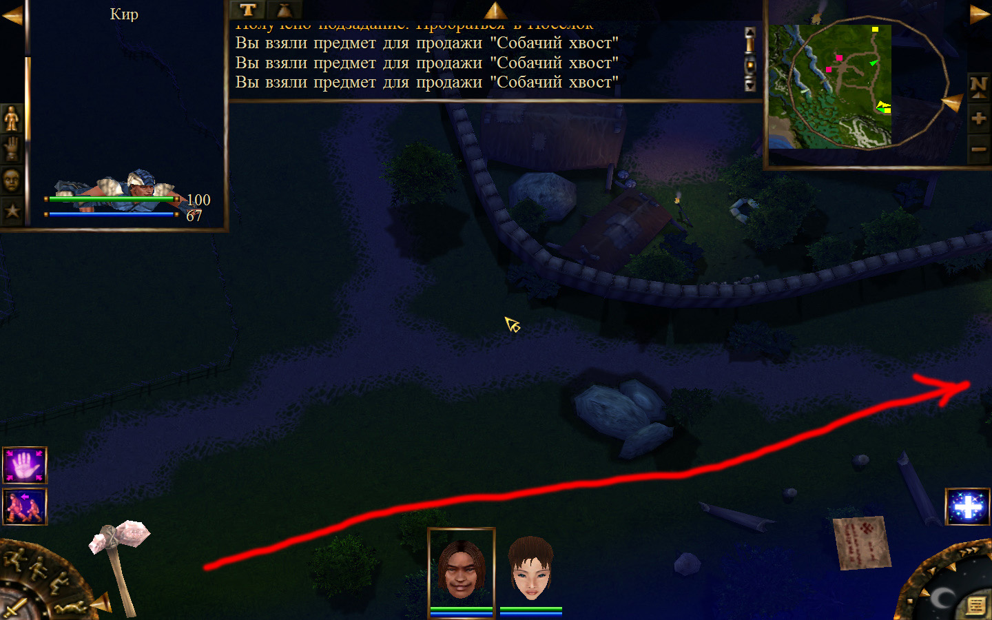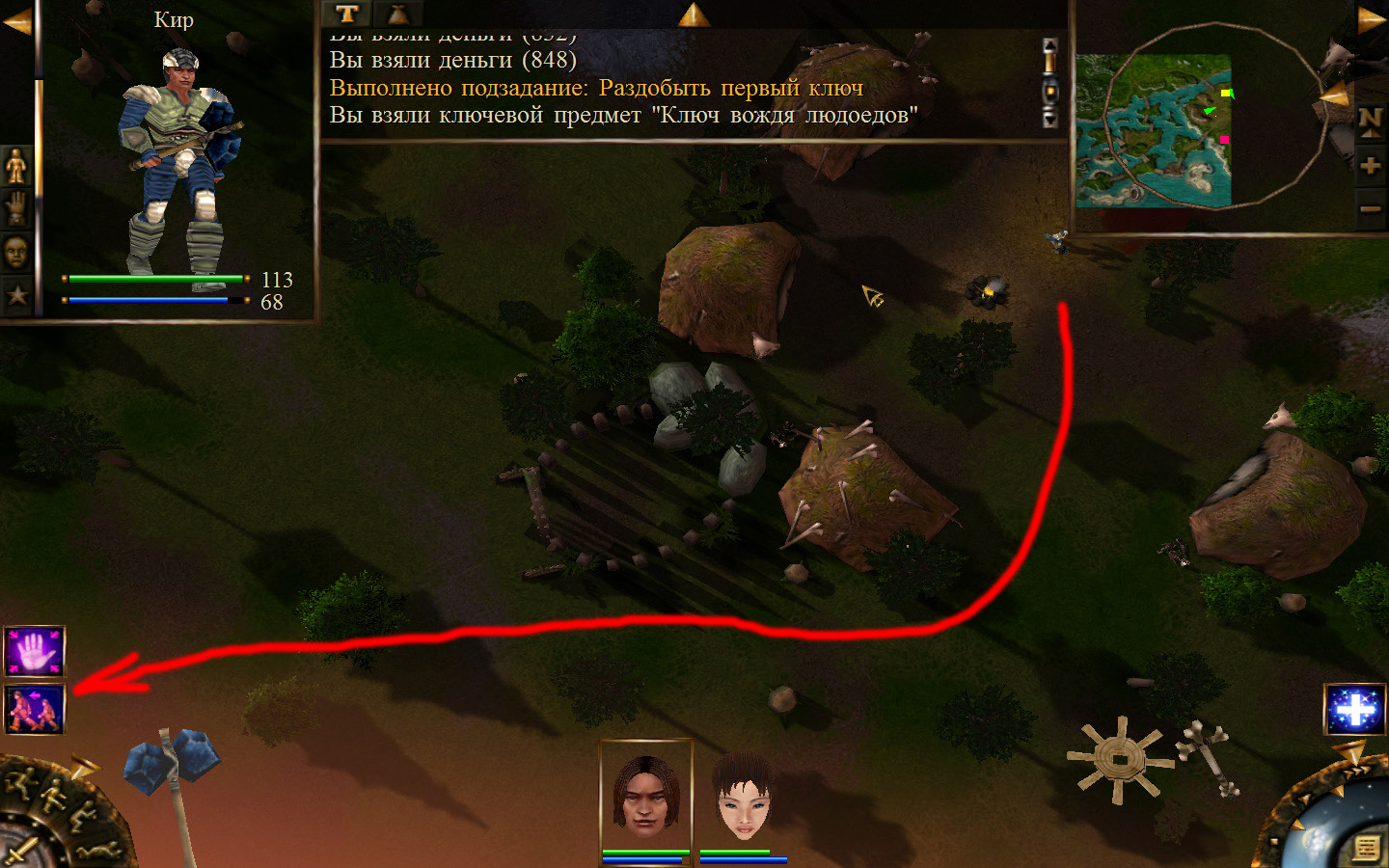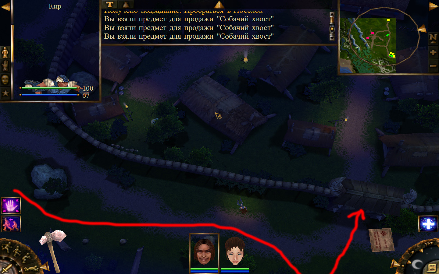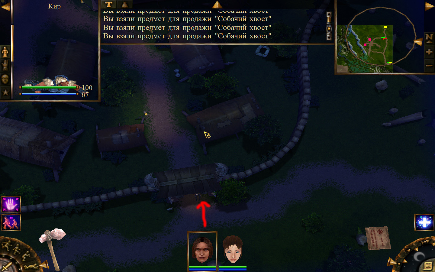 Дальше заходим в магазин к вождю, продаем все, что нам не нужно. Покупаем каменный топор, то есть делаем через конструктор. Надеваем каменный топор Киру. Выходим из магазина вождя, идем к шаману, покупаем у него самое простое заклинание восстановления здоровья – восстанавливает всего 10 единиц здоровья, но это лучше, чем ничего.