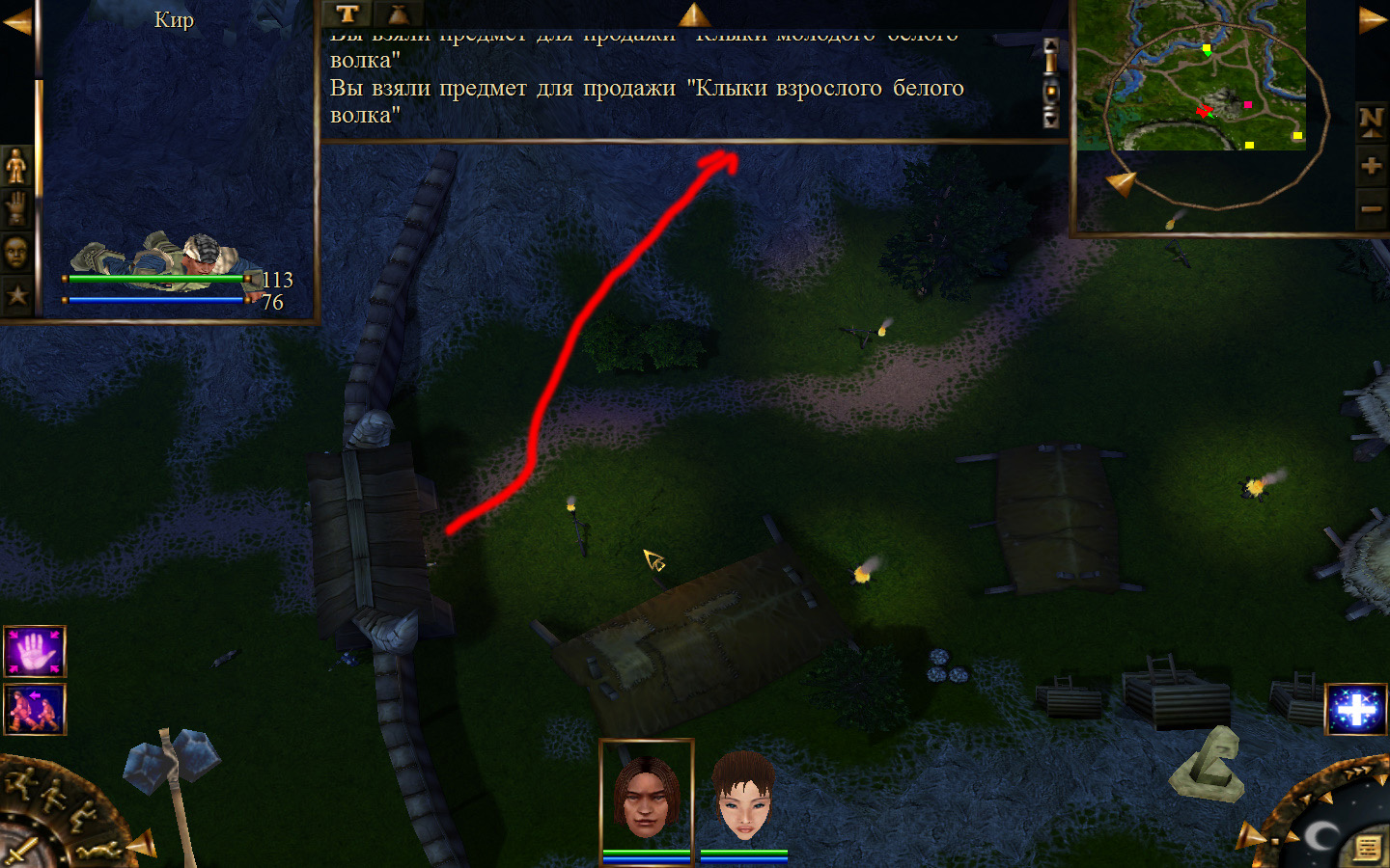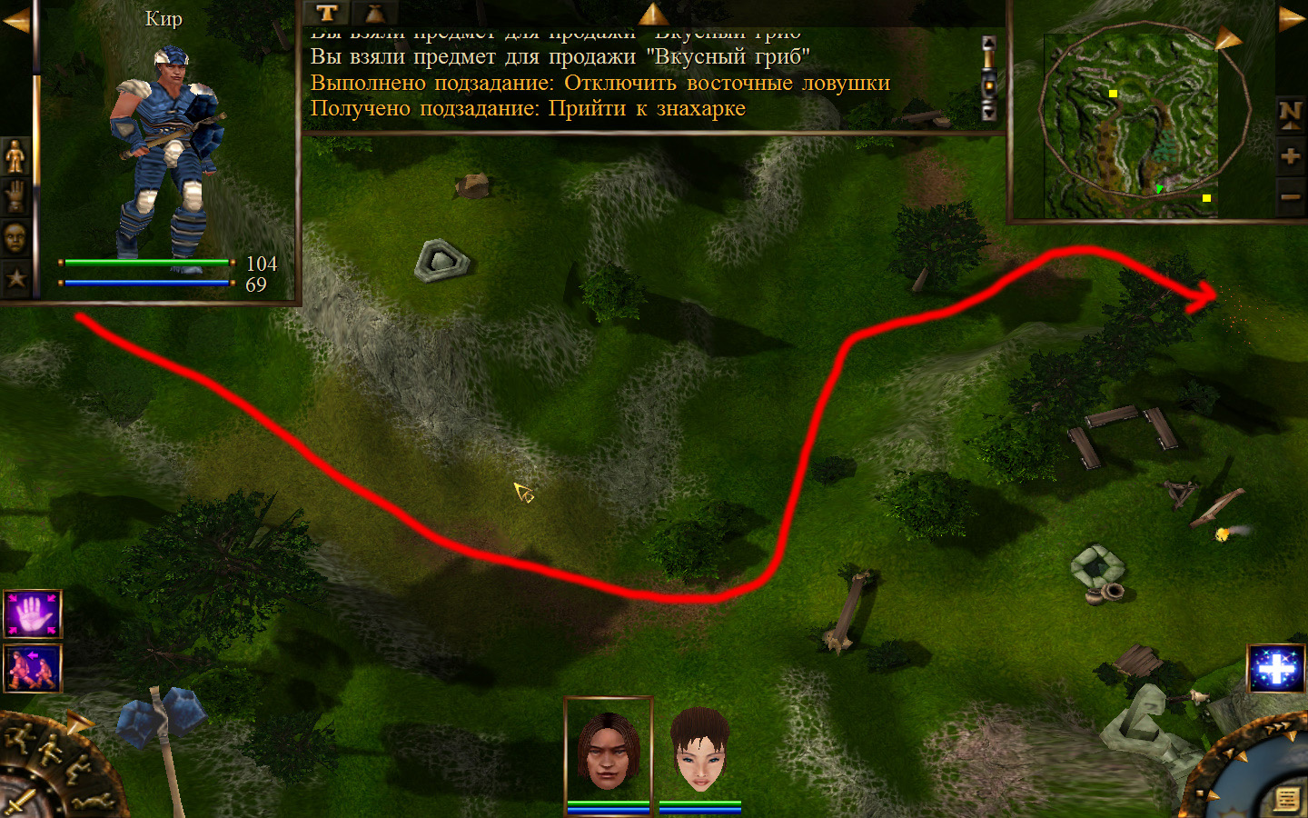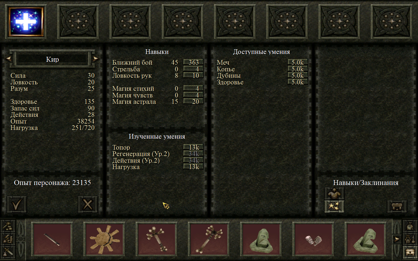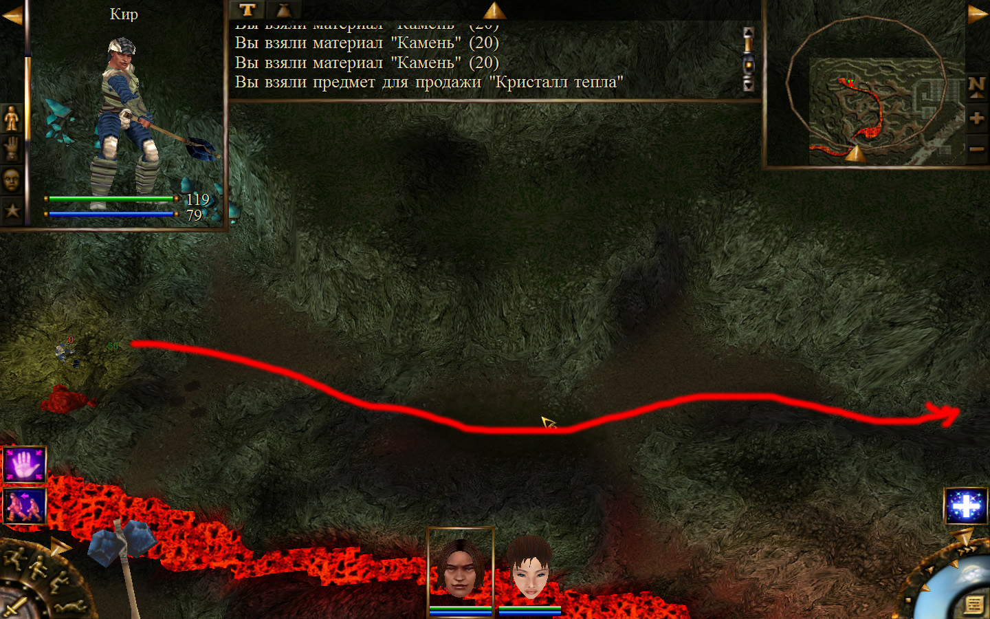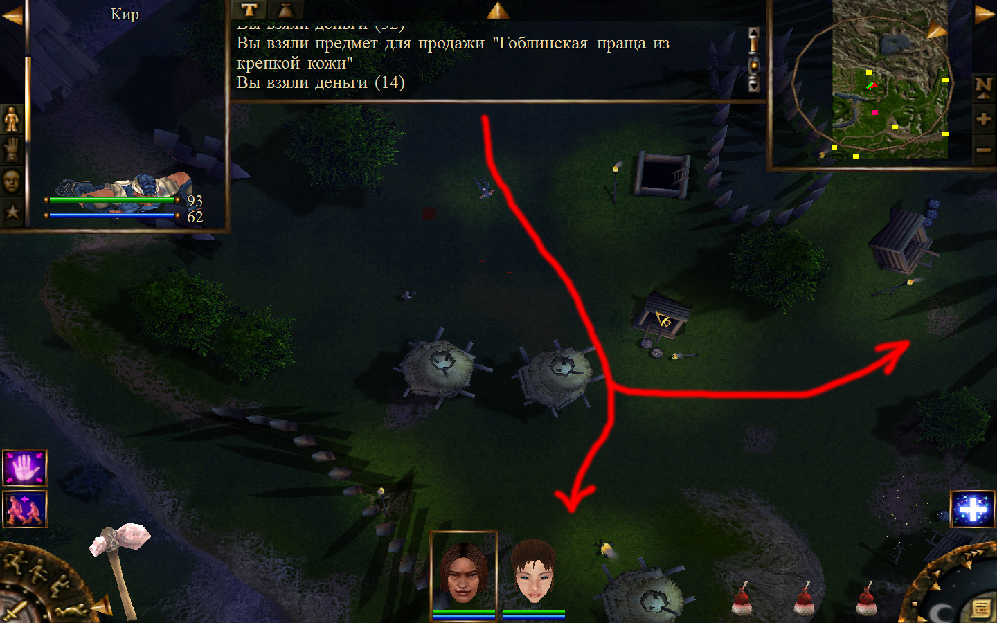 Дальше заходим в магазин к вождю, продаем все, что нам не нужно. Покупаем каменный топор, то есть делаем через конструктор. Надеваем каменный топор Киру. Выходим из магазина вождя, идем к шаману, покупаем у него самое простое заклинание восстановления здоровья – восстанавливает всего 10 единиц здоровья, но это лучше, чем ничего.
