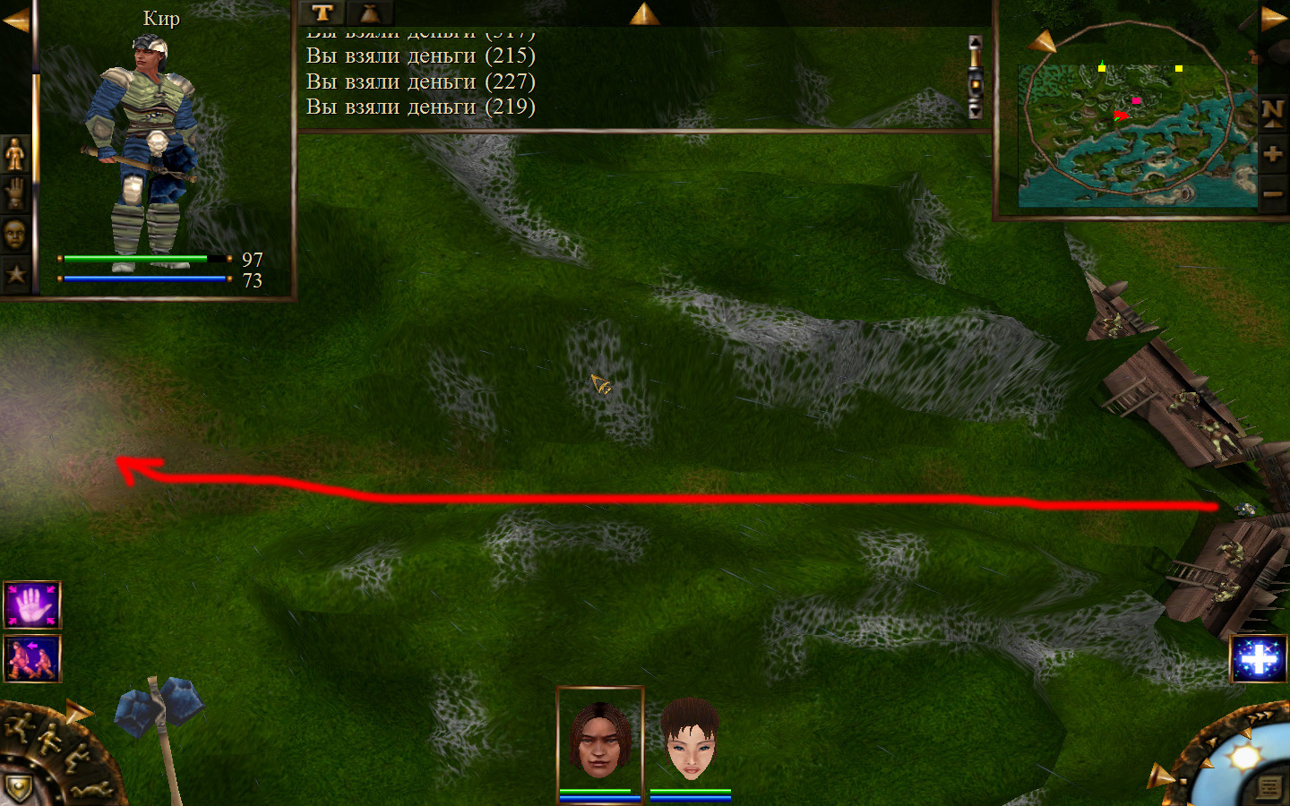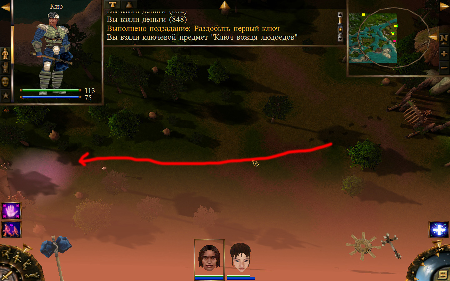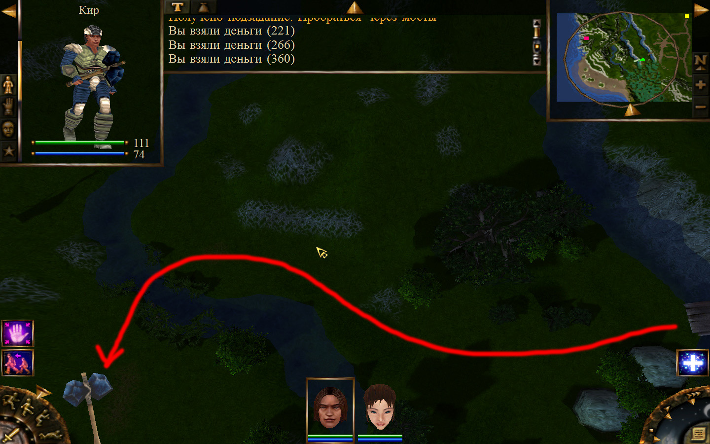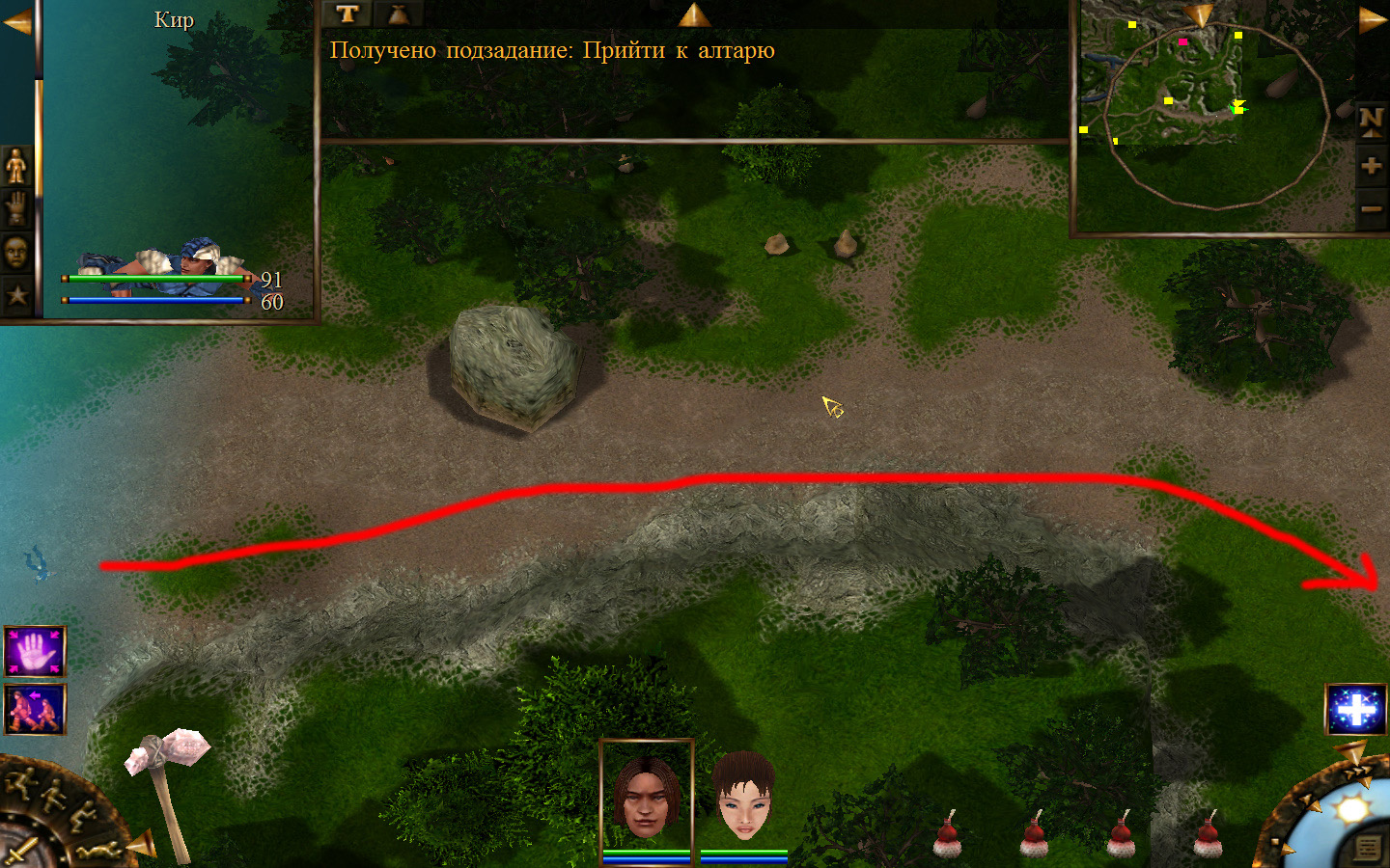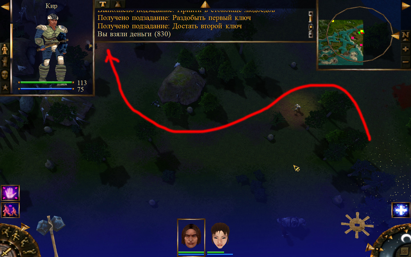 Дальше заходим в магазин к вождю, продаем все, что нам не нужно. Покупаем каменный топор, то есть делаем через конструктор. Надеваем каменный топор Киру. Выходим из магазина вождя, идем к шаману, покупаем у него самое простое заклинание восстановления здоровья – восстанавливает всего 10 единиц здоровья, но это лучше, чем ничего.