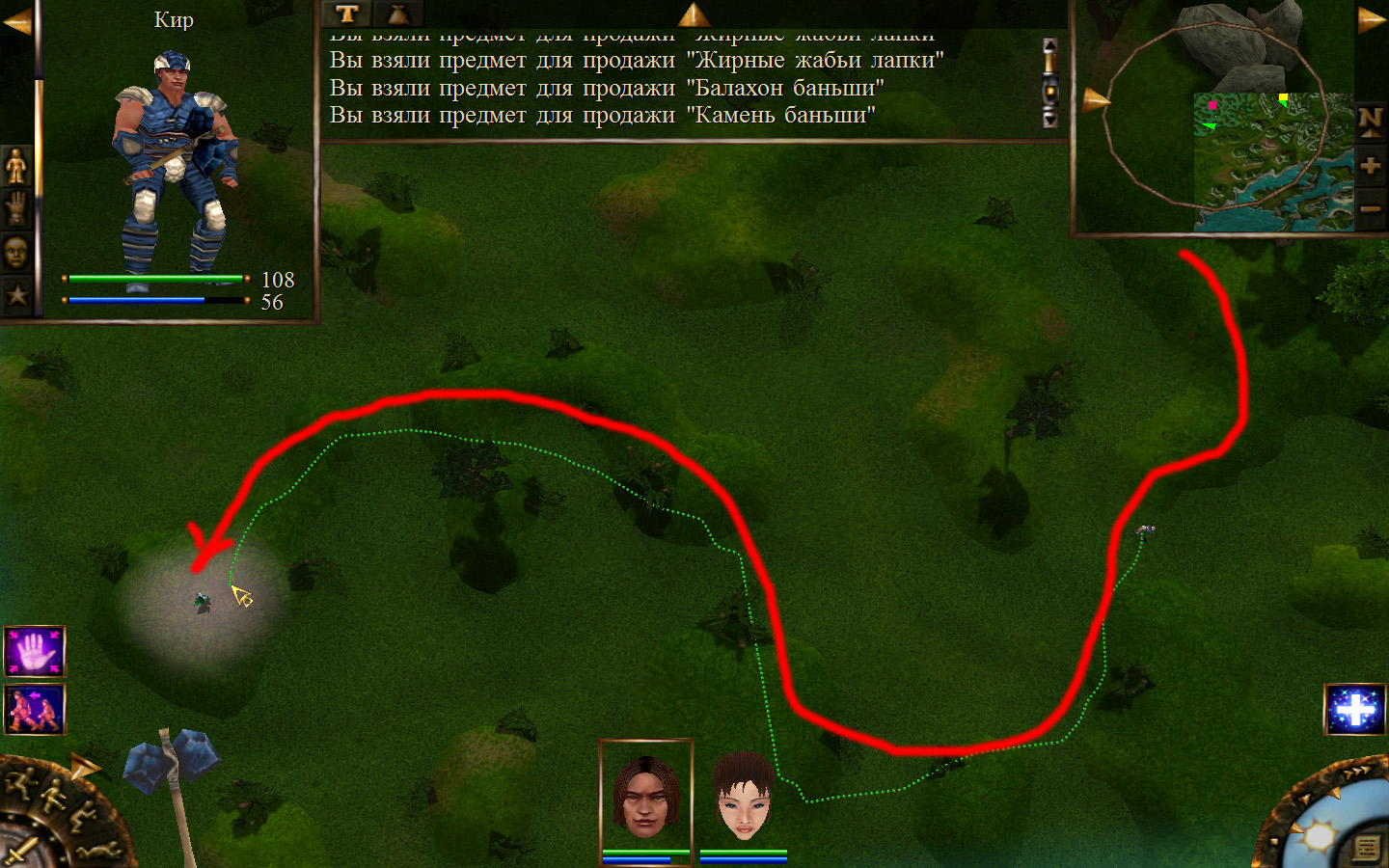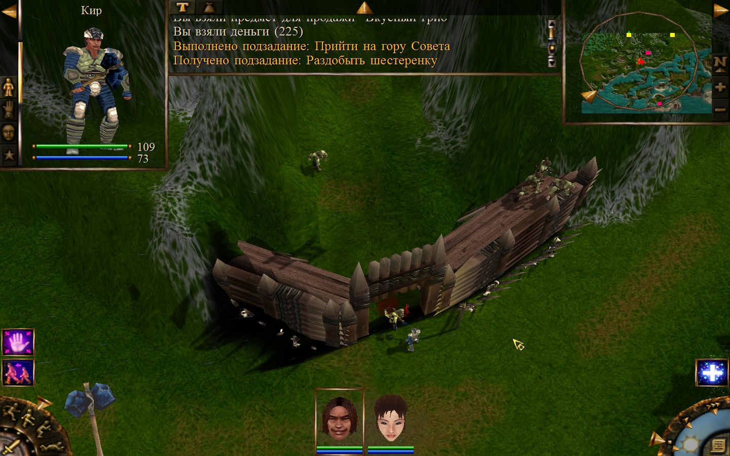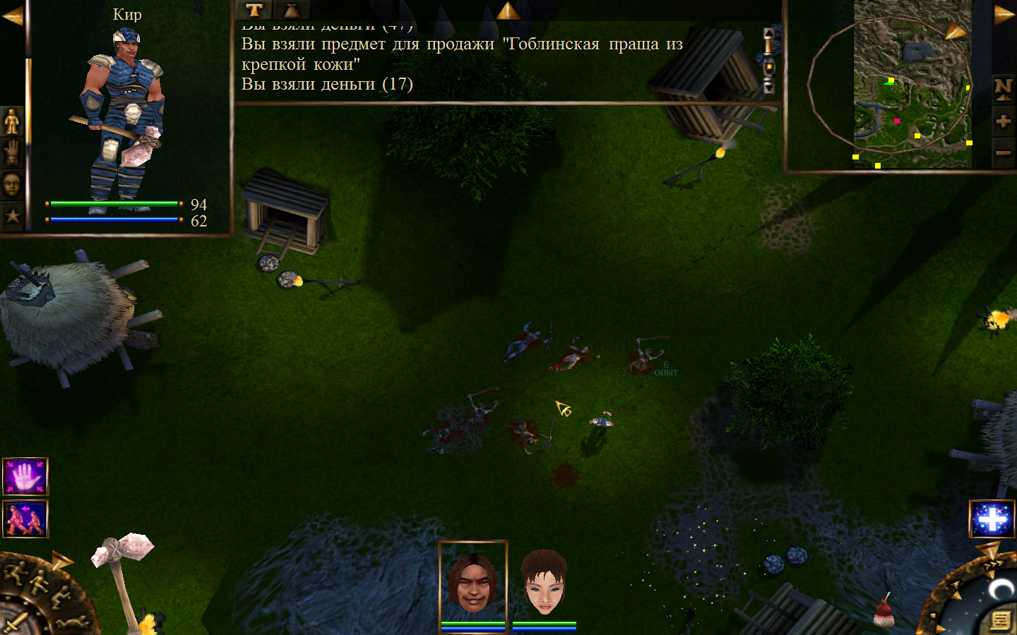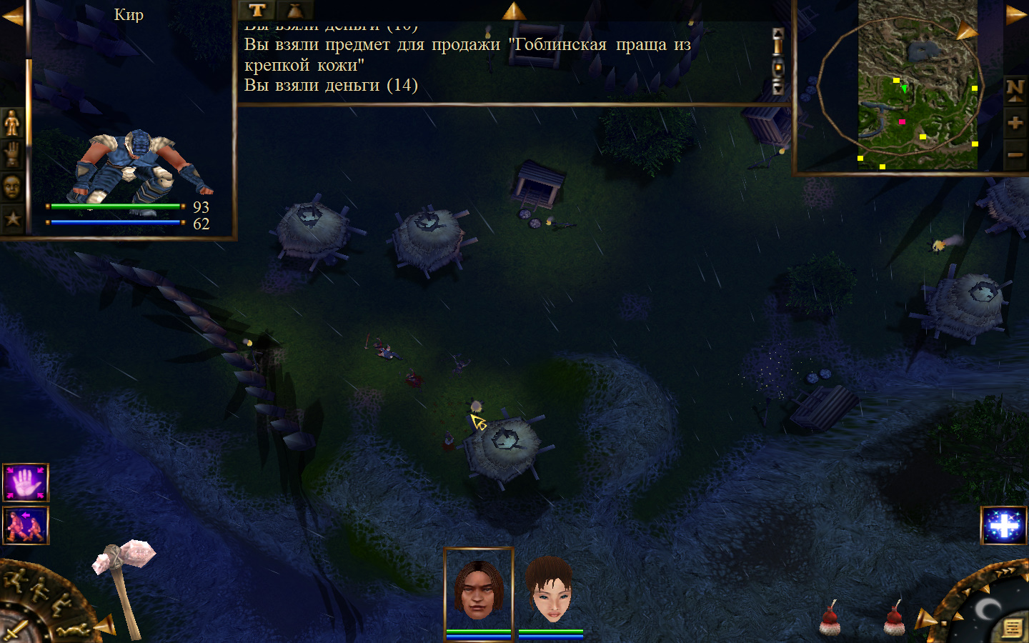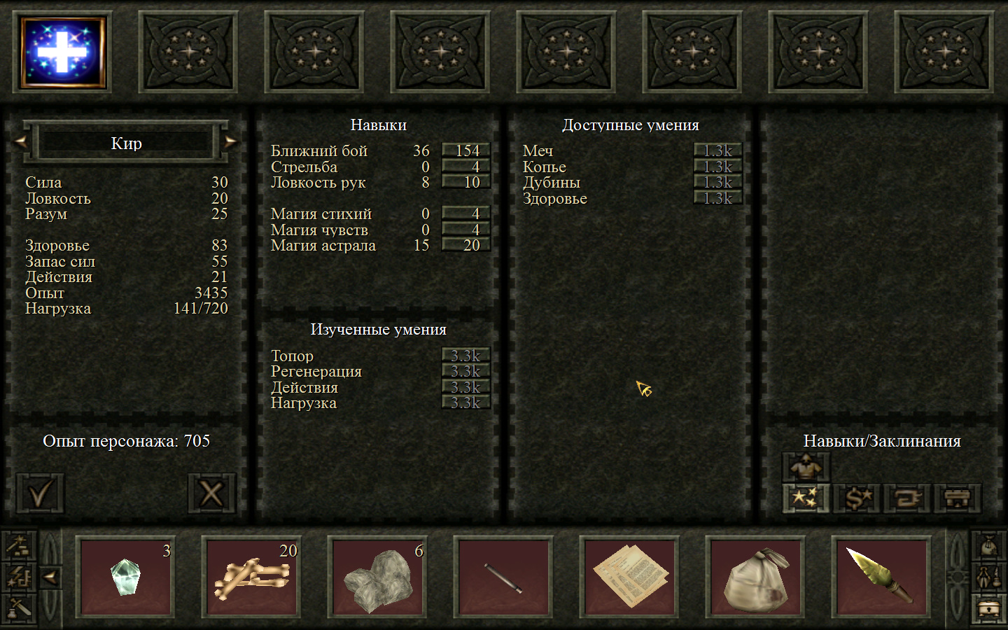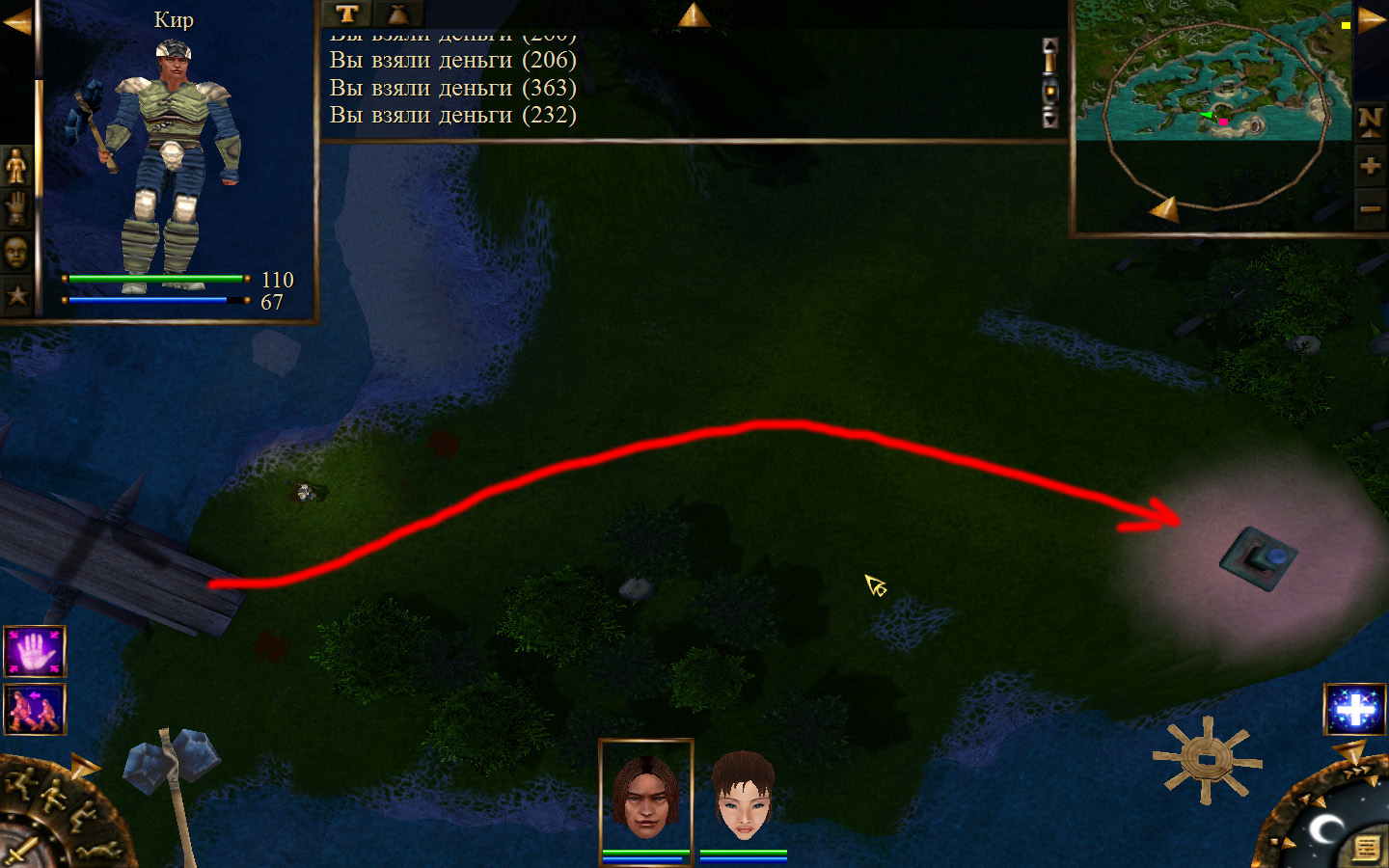 Дальше заходим в магазин к вождю, продаем все, что нам не нужно. Покупаем каменный топор, то есть делаем через конструктор. Надеваем каменный топор Киру. Выходим из магазина вождя, идем к шаману, покупаем у него самое простое заклинание восстановления здоровья – восстанавливает всего 10 единиц здоровья, но это лучше, чем ничего.