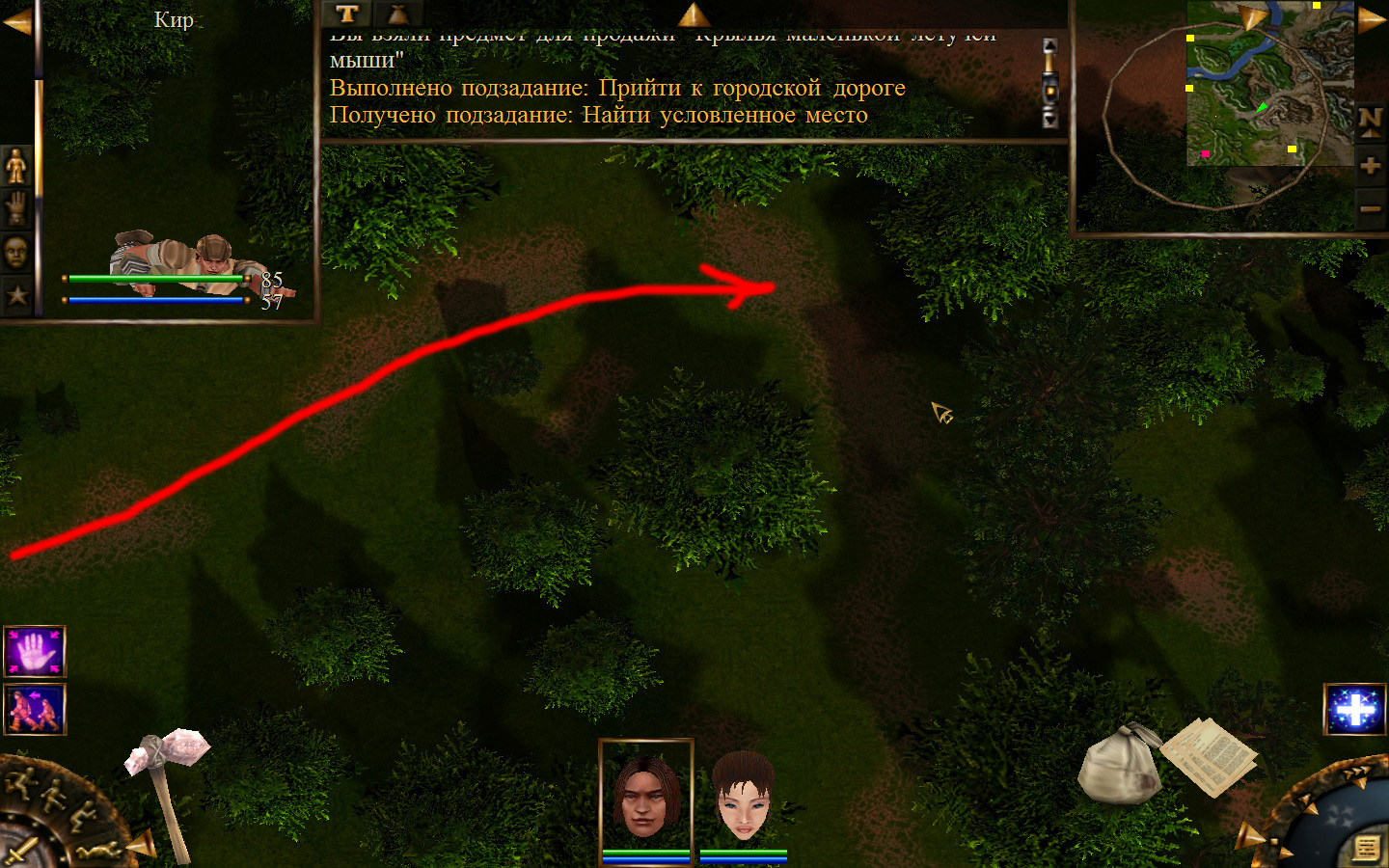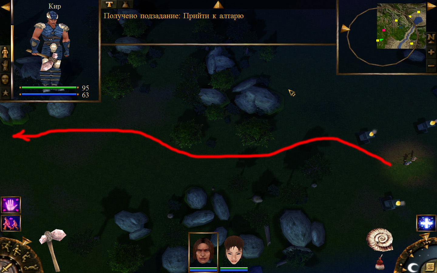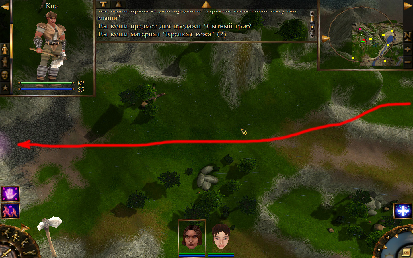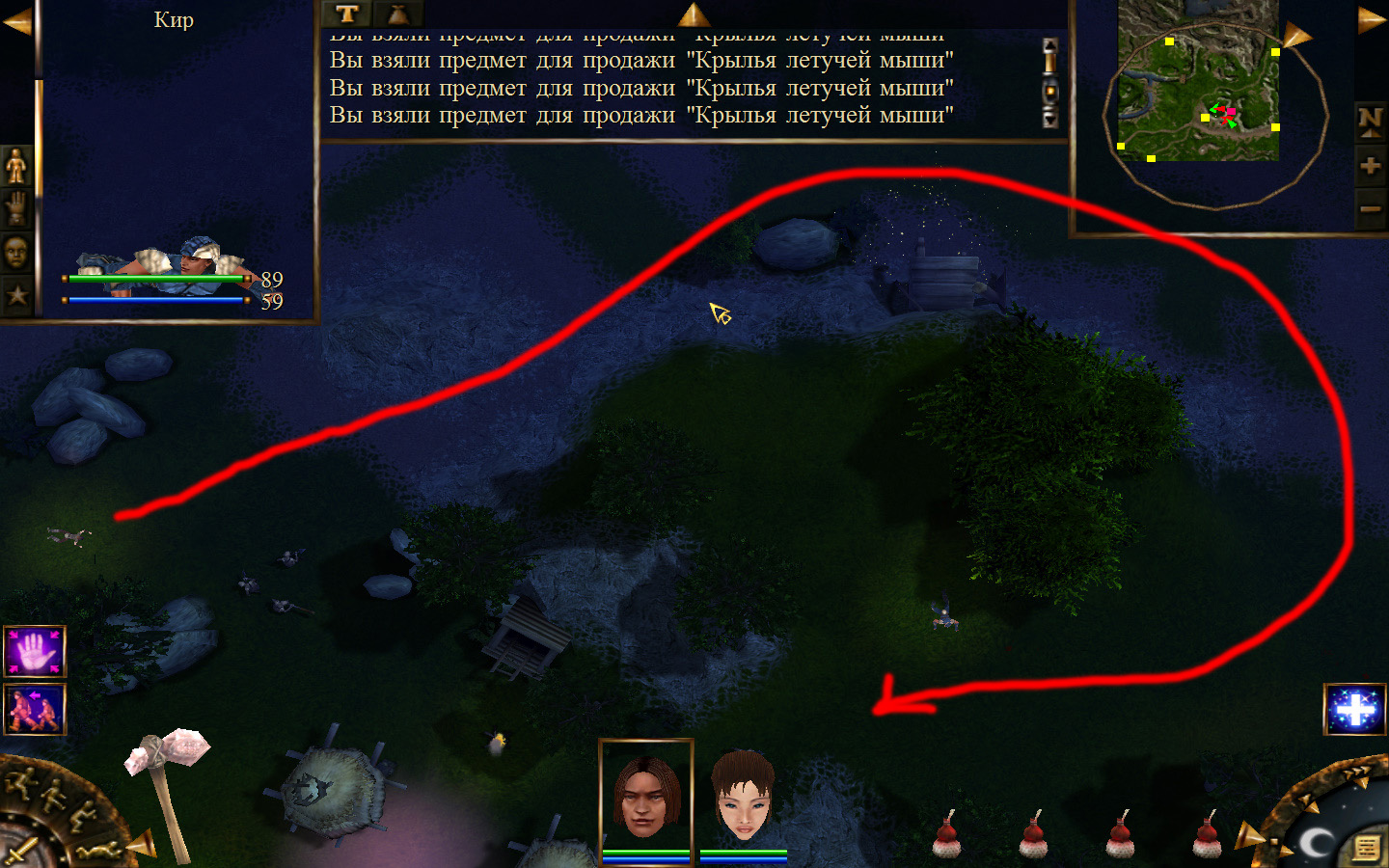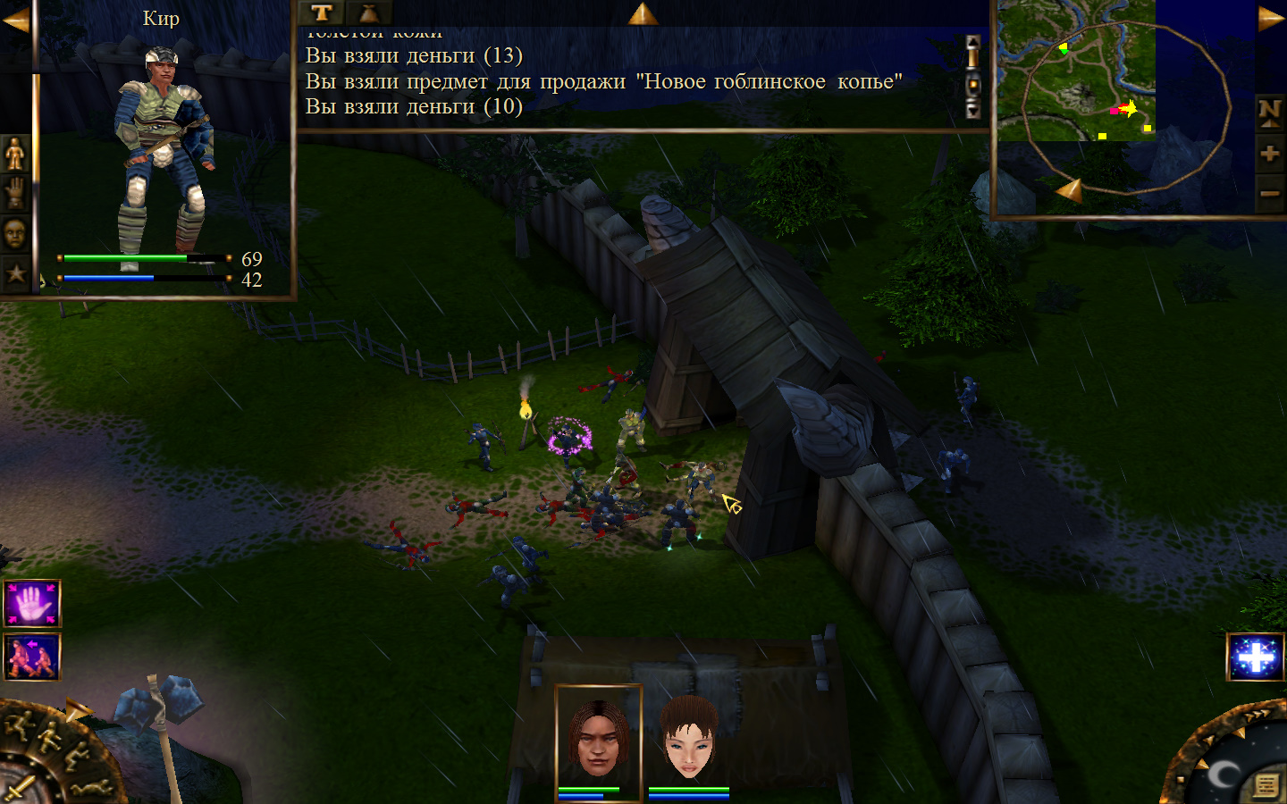 Дальше заходим в магазин к вождю, продаем все, что нам не нужно. Покупаем каменный топор, то есть делаем через конструктор. Надеваем каменный топор Киру. Выходим из магазина вождя, идем к шаману, покупаем у него самое простое заклинание восстановления здоровья – восстанавливает всего 10 единиц здоровья, но это лучше, чем ничего.