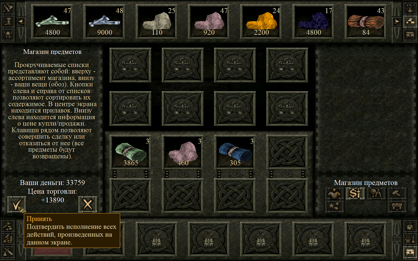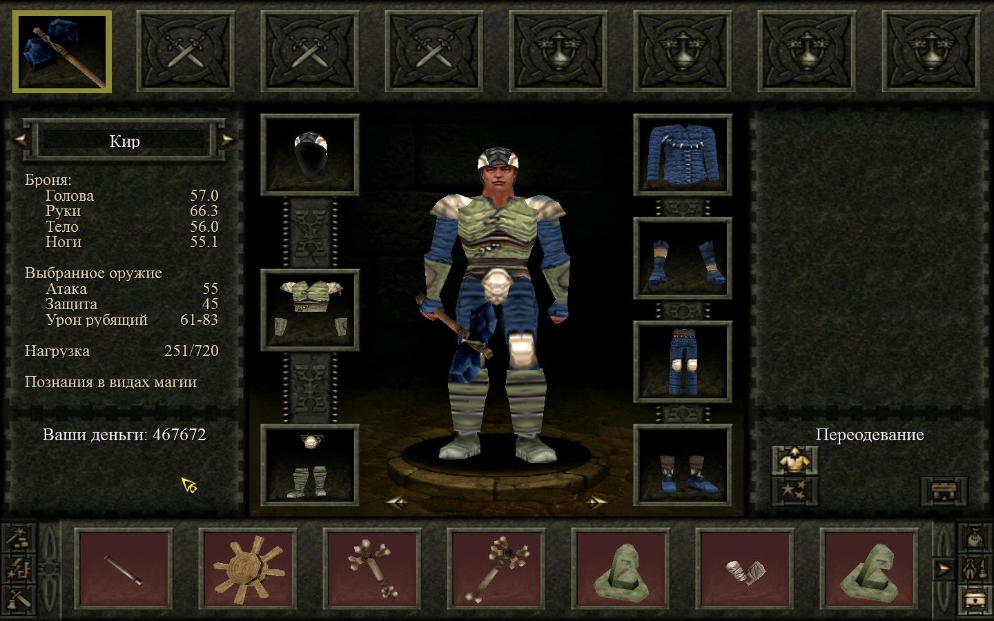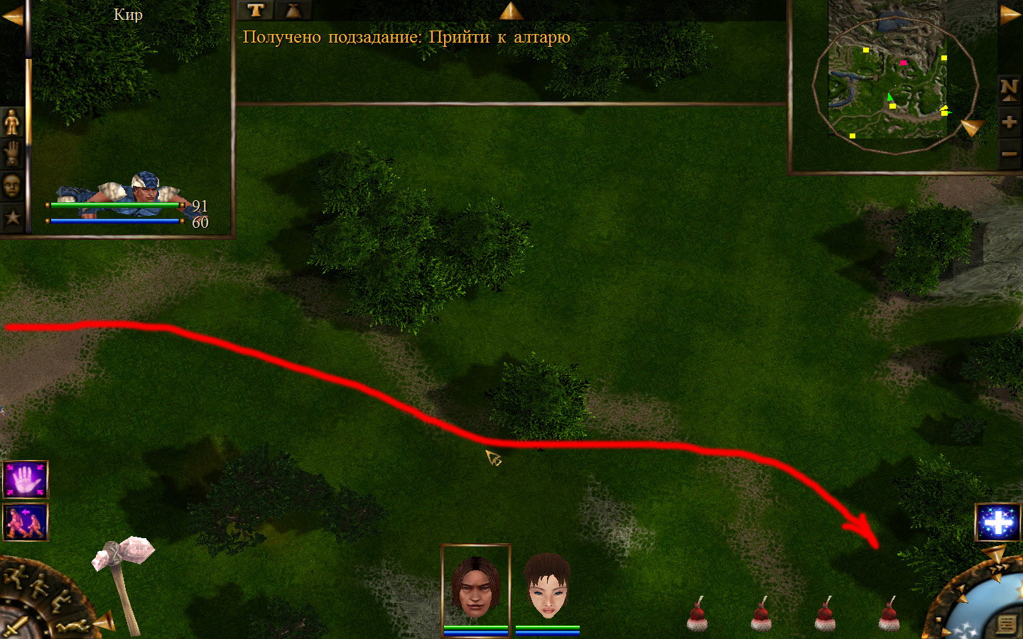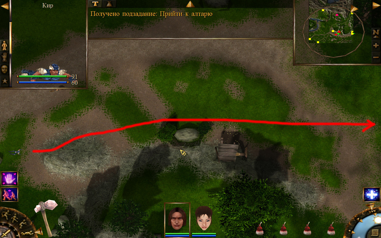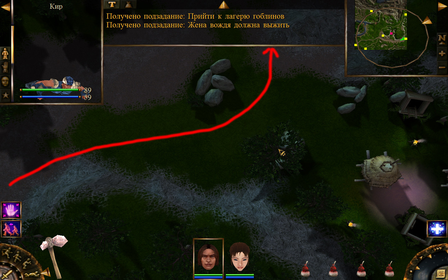 Дальше заходим в магазин к вождю, продаем все, что нам не нужно. Покупаем каменный топор, то есть делаем через конструктор. Надеваем каменный топор Киру. Выходим из магазина вождя, идем к шаману, покупаем у него самое простое заклинание восстановления здоровья – восстанавливает всего 10 единиц здоровья, но это лучше, чем ничего.