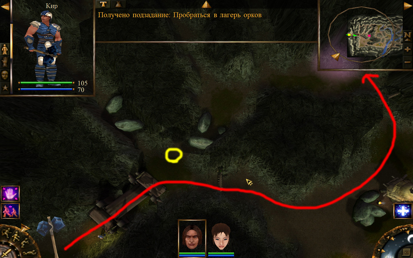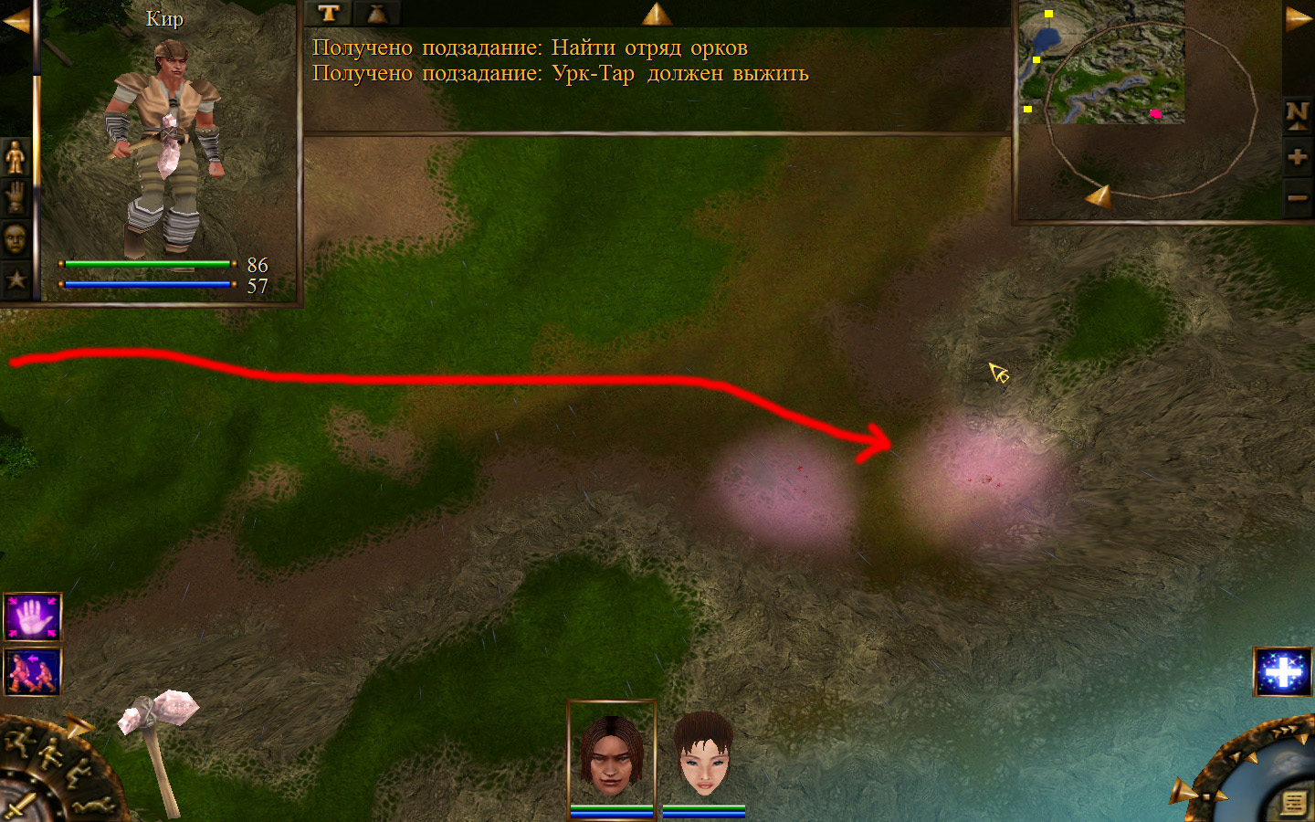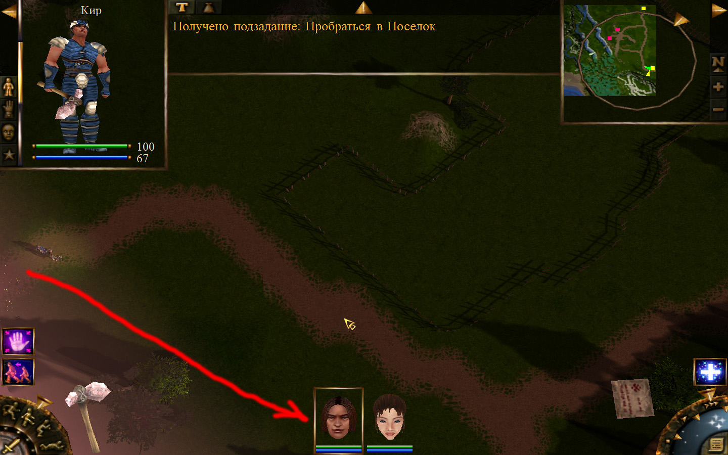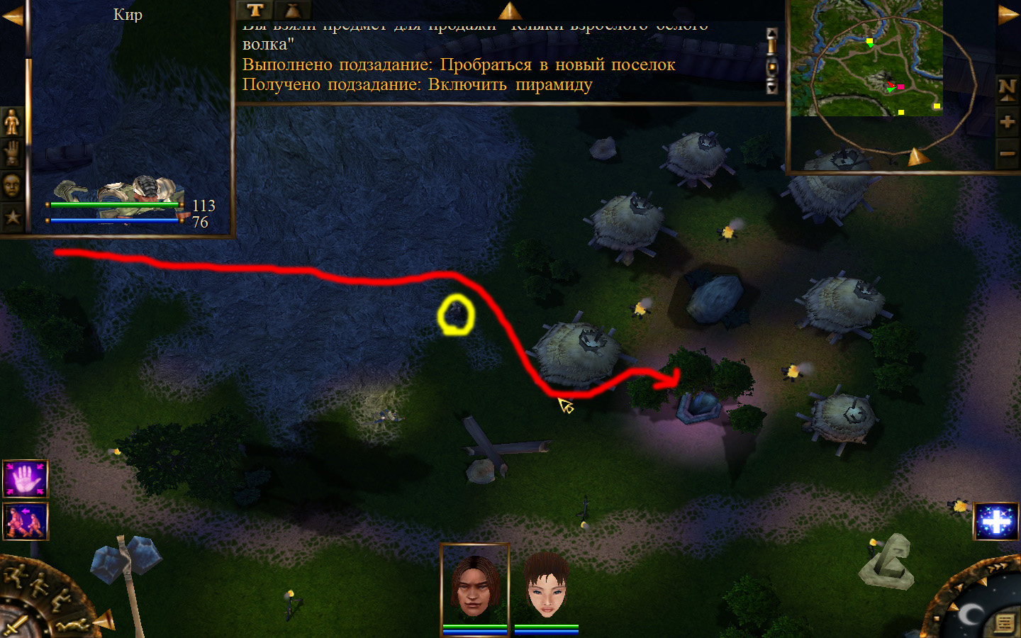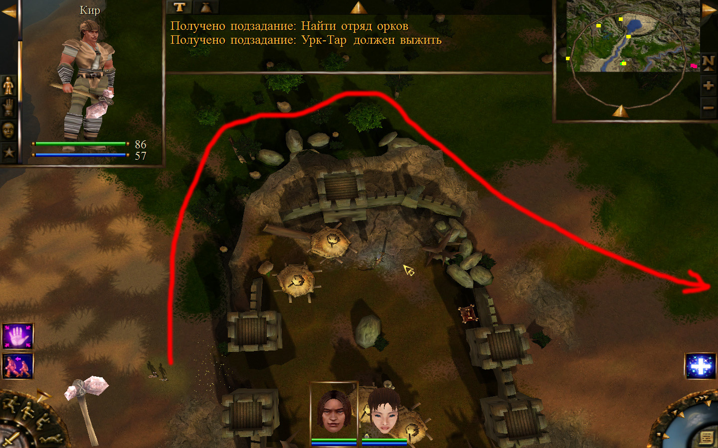 Ползем вдоль тропинки к поселку, как указанно на изображениях. Пробираемся через ворота в поселок. Если собаки у входа будут препятствовать и их необходимо будет убить, нужно нападать со спины, чтобы из поселка на шум битвы не выбежали охранники. Попав в поселок, уходим влево и ползем под горой к указанному розовым светом месту. По пути нужно будет убить одного гоблина, что бы он не мешал. А дальше активировать пирамиду. После чего выбраться из поселка. Молния от древней пирамиды убьет небольшой процент охраны в поселке, после чего нужно снова зайти в поселок и убить оставшуюся там охрану. На помощь придут вольные охотники с орками. Необходимо в первую очередь убивать магов, стражу бить обычными ударами, а лучников бить по ногам.