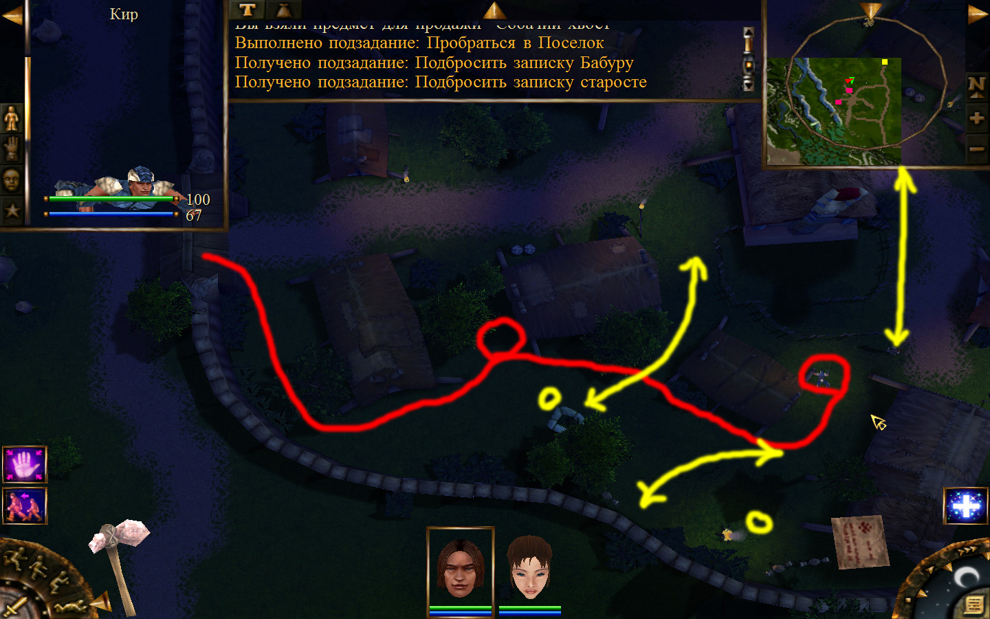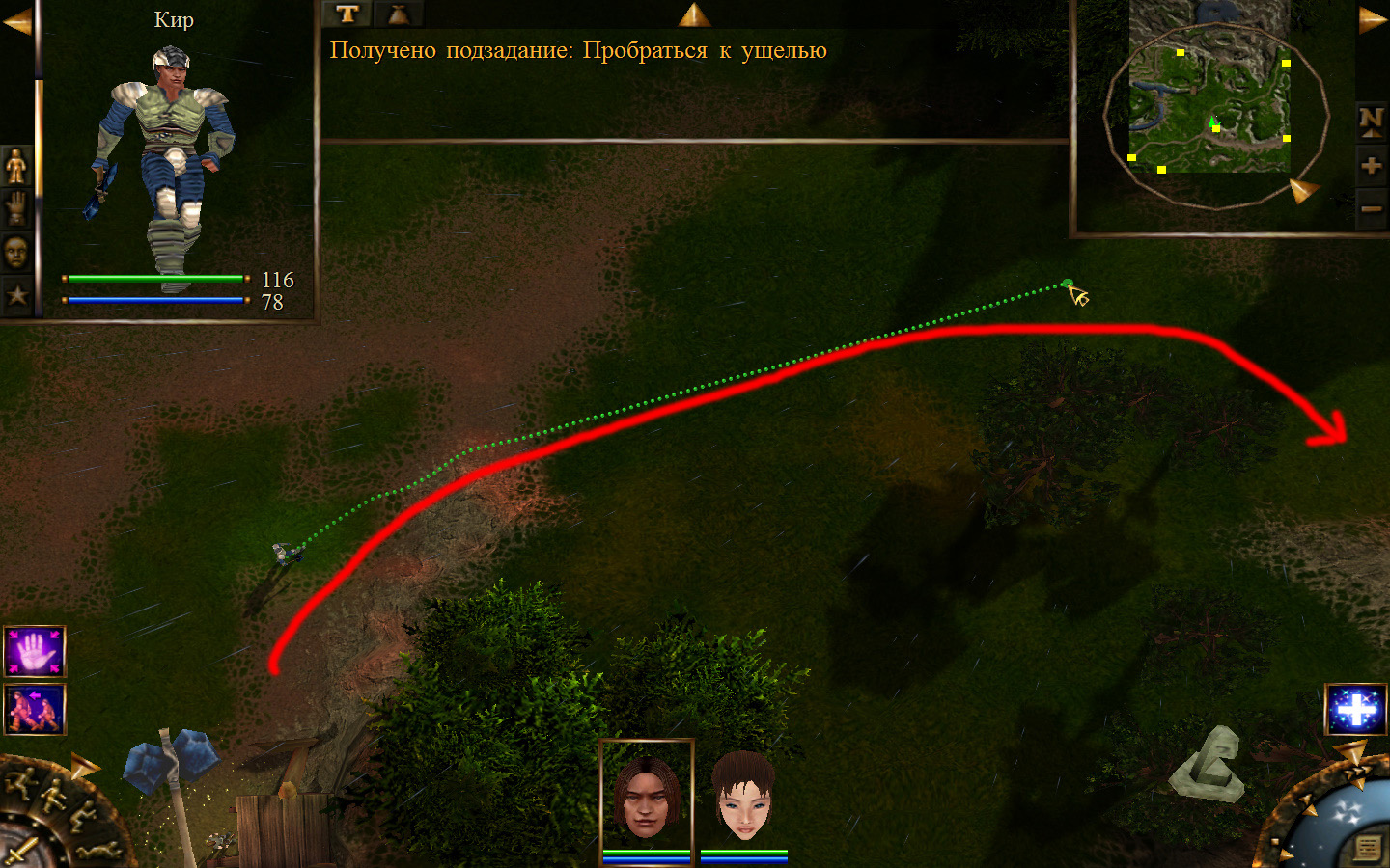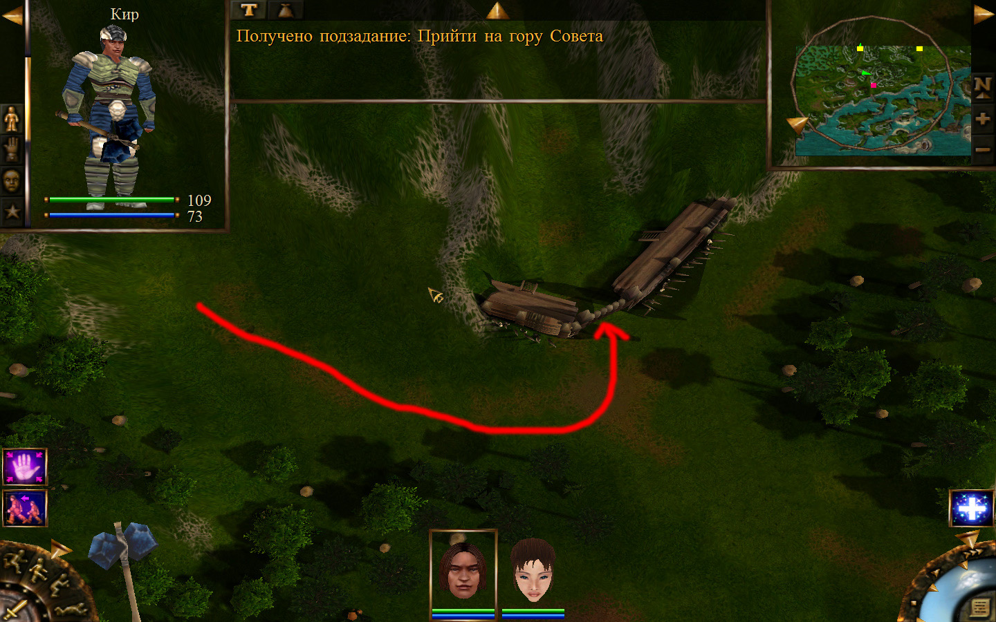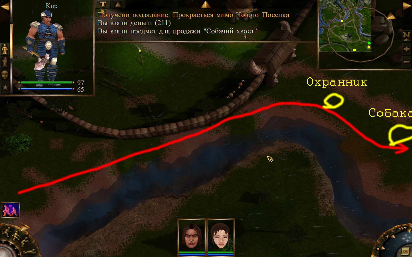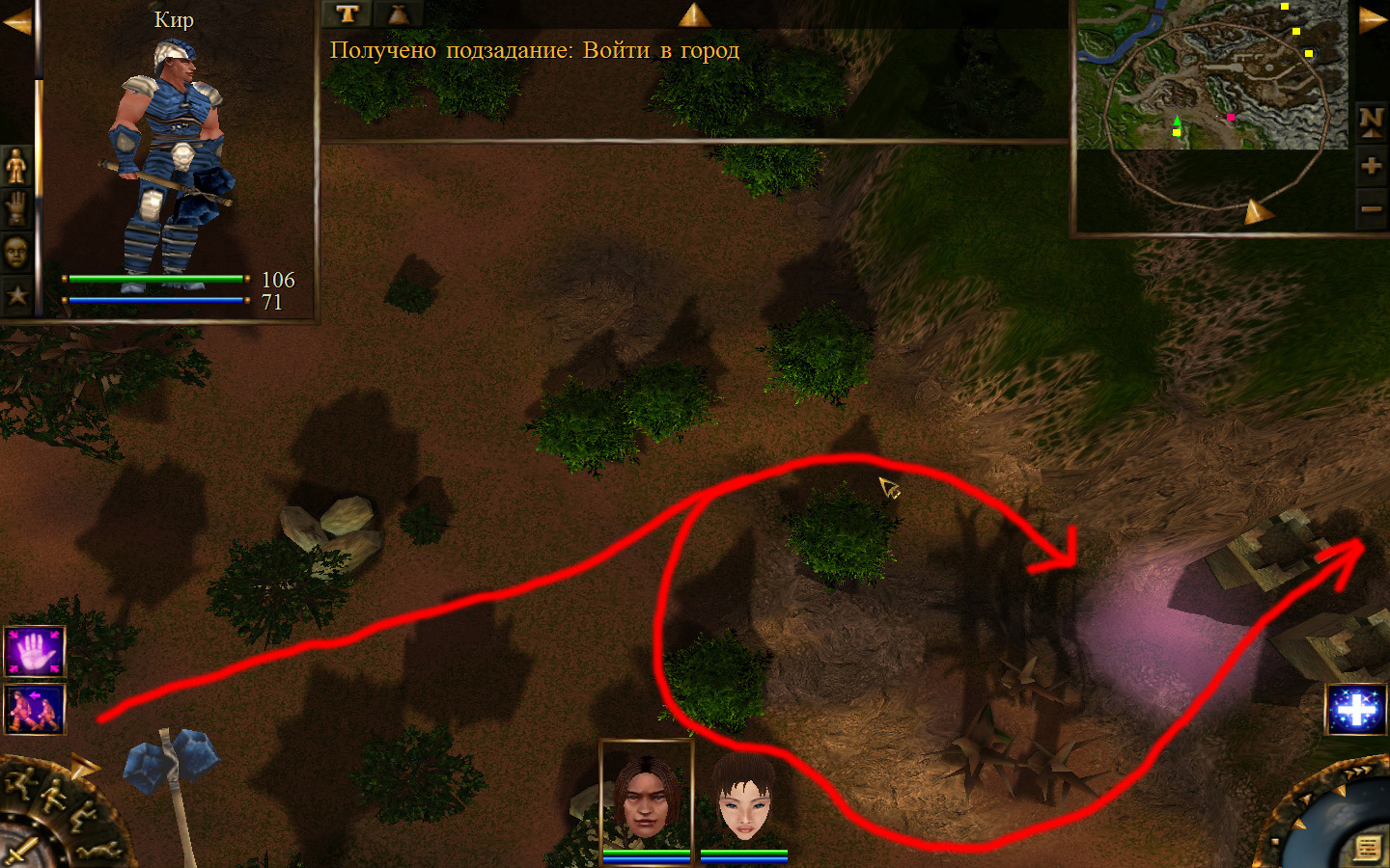 Ползем вдоль тропинки к поселку, как указанно на изображениях. Пробираемся через ворота в поселок. Если собаки у входа будут препятствовать и их необходимо будет убить, нужно нападать со спины, чтобы из поселка на шум битвы не выбежали охранники. Попав в поселок, уходим влево и ползем под горой к указанному розовым светом месту. По пути нужно будет убить одного гоблина, что бы он не мешал. А дальше активировать пирамиду. После чего выбраться из поселка. Молния от древней пирамиды убьет небольшой процент охраны в поселке, после чего нужно снова зайти в поселок и убить оставшуюся там охрану. На помощь придут вольные охотники с орками. Необходимо в первую очередь убивать магов, стражу бить обычными ударами, а лучников бить по ногам.