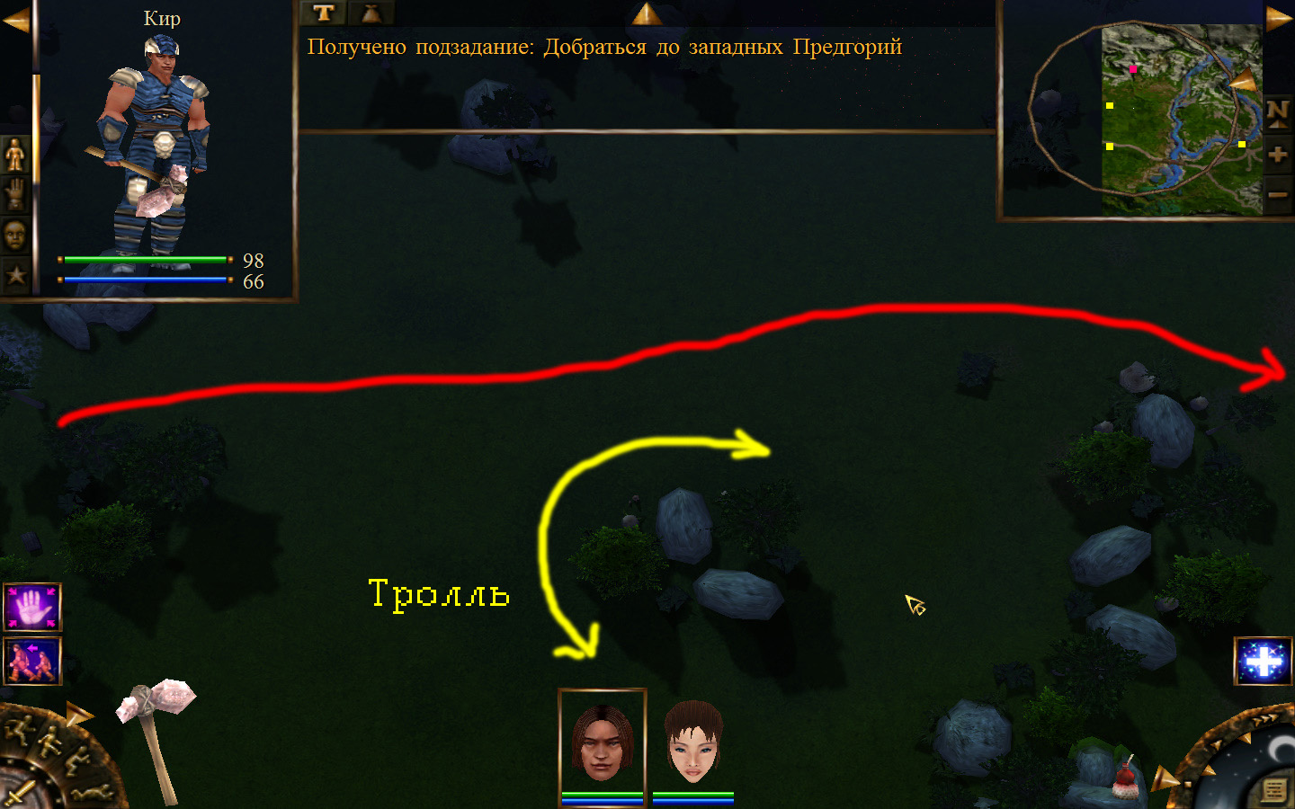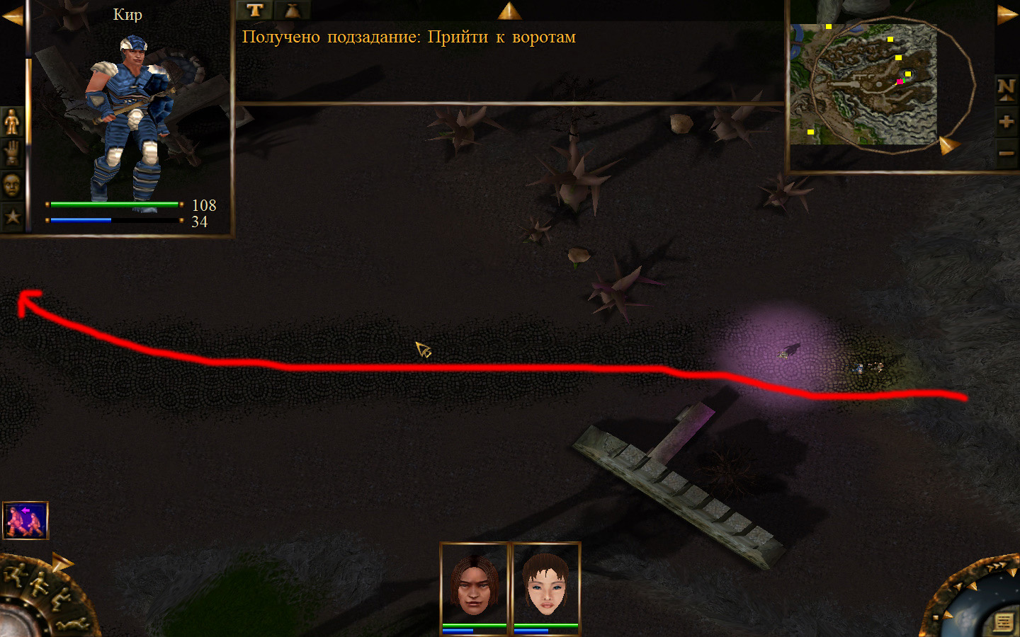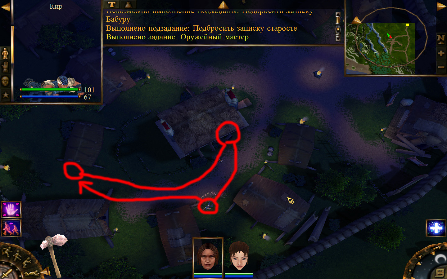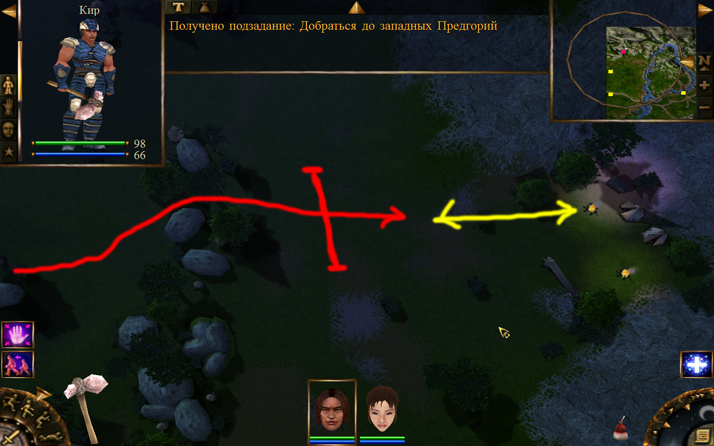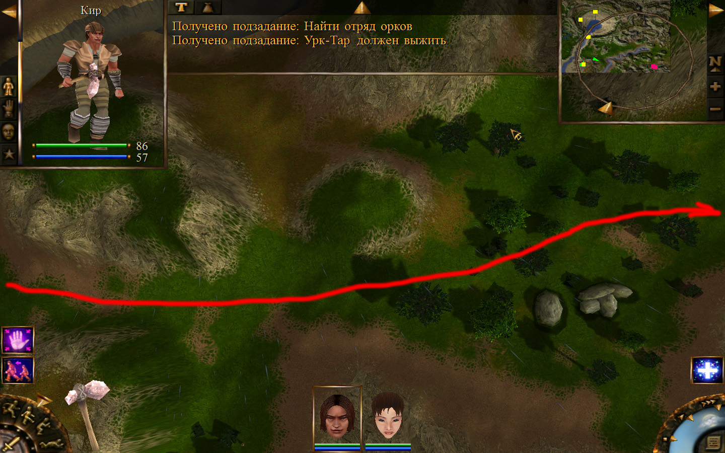 Ползем вдоль тропинки к поселку, как указанно на изображениях. Пробираемся через ворота в поселок. Если собаки у входа будут препятствовать и их необходимо будет убить, нужно нападать со спины, чтобы из поселка на шум битвы не выбежали охранники. Попав в поселок, уходим влево и ползем под горой к указанному розовым светом месту. По пути нужно будет убить одного гоблина, что бы он не мешал. А дальше активировать пирамиду. После чего выбраться из поселка. Молния от древней пирамиды убьет небольшой процент охраны в поселке, после чего нужно снова зайти в поселок и убить оставшуюся там охрану. На помощь придут вольные охотники с орками. Необходимо в первую очередь убивать магов, стражу бить обычными ударами, а лучников бить по ногам.