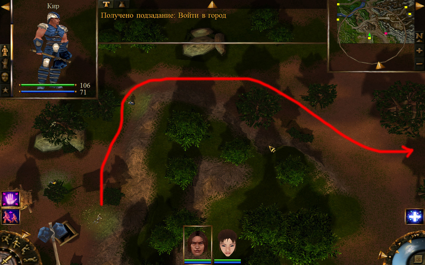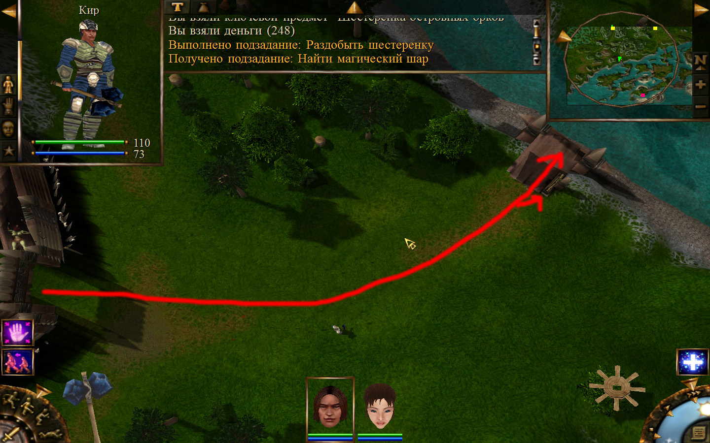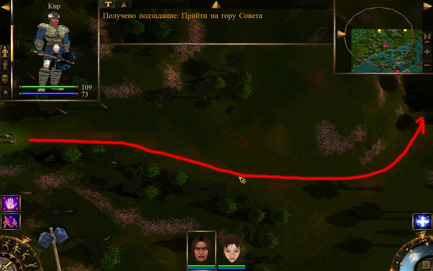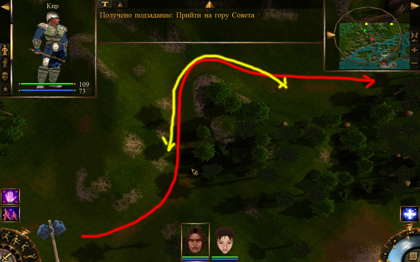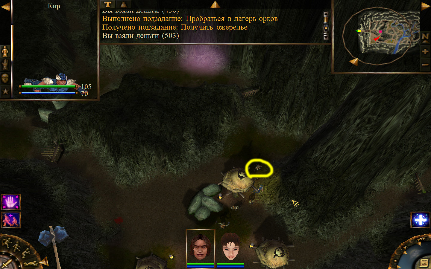 Ползем вдоль тропинки к поселку, как указанно на изображениях. Пробираемся через ворота в поселок. Если собаки у входа будут препятствовать и их необходимо будет убить, нужно нападать со спины, чтобы из поселка на шум битвы не выбежали охранники. Попав в поселок, уходим влево и ползем под горой к указанному розовым светом месту. По пути нужно будет убить одного гоблина, что бы он не мешал. А дальше активировать пирамиду. После чего выбраться из поселка. Молния от древней пирамиды убьет небольшой процент охраны в поселке, после чего нужно снова зайти в поселок и убить оставшуюся там охрану. На помощь придут вольные охотники с орками. Необходимо в первую очередь убивать магов, стражу бить обычными ударами, а лучников бить по ногам.