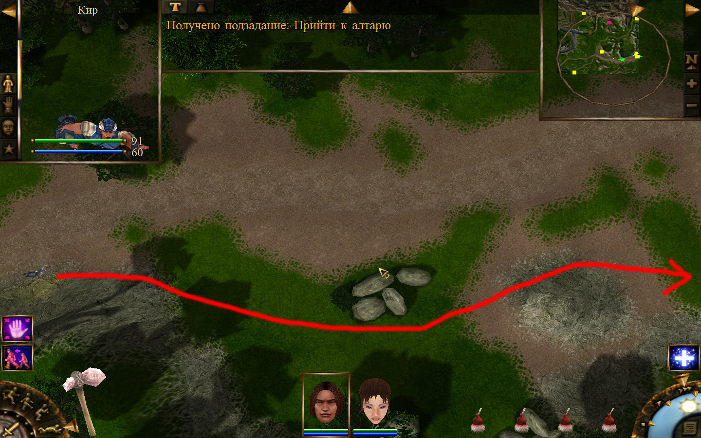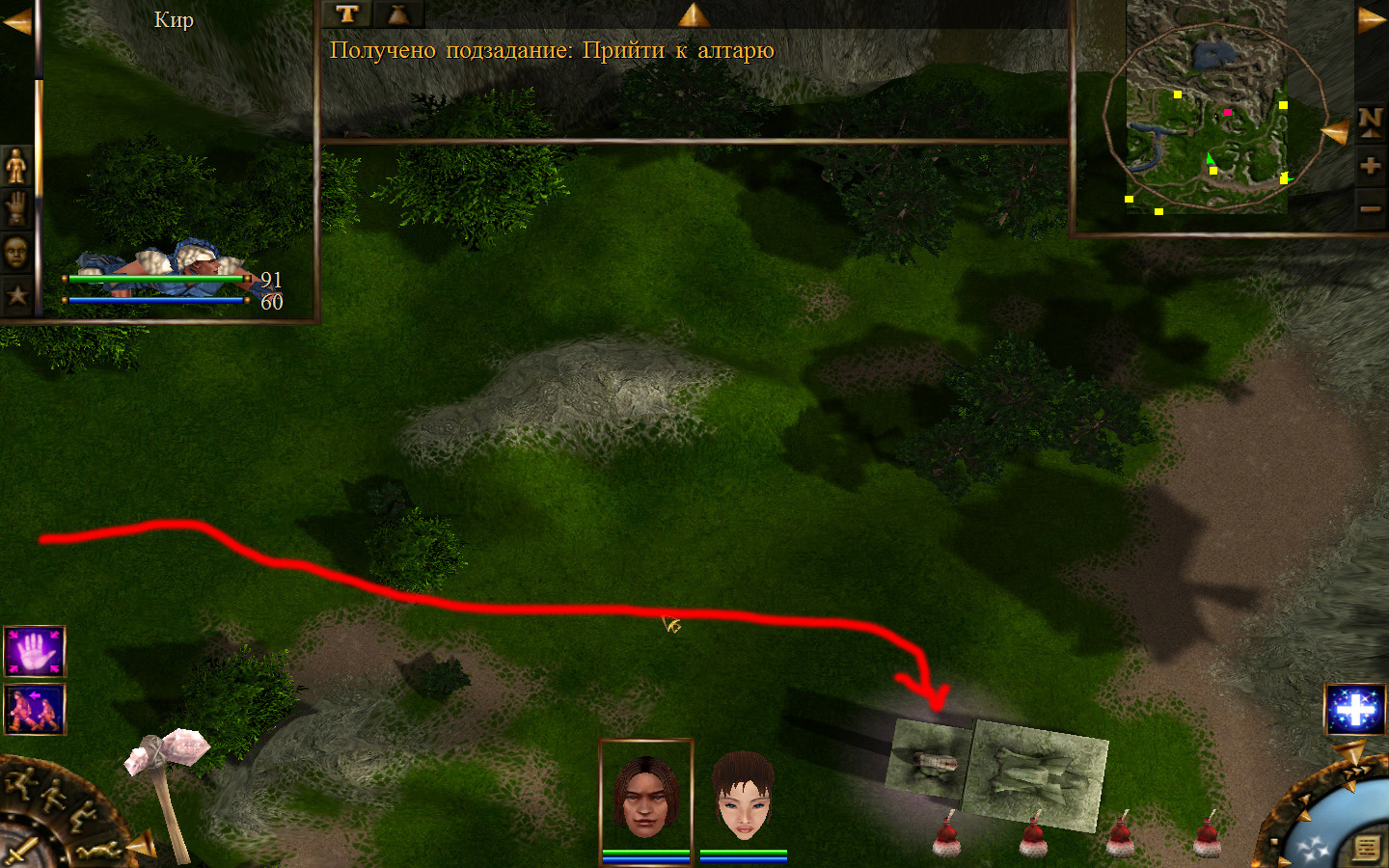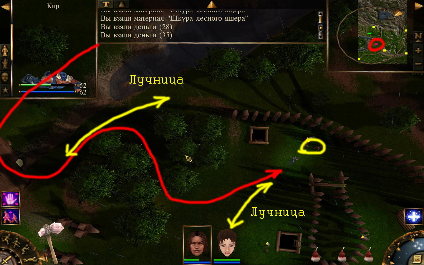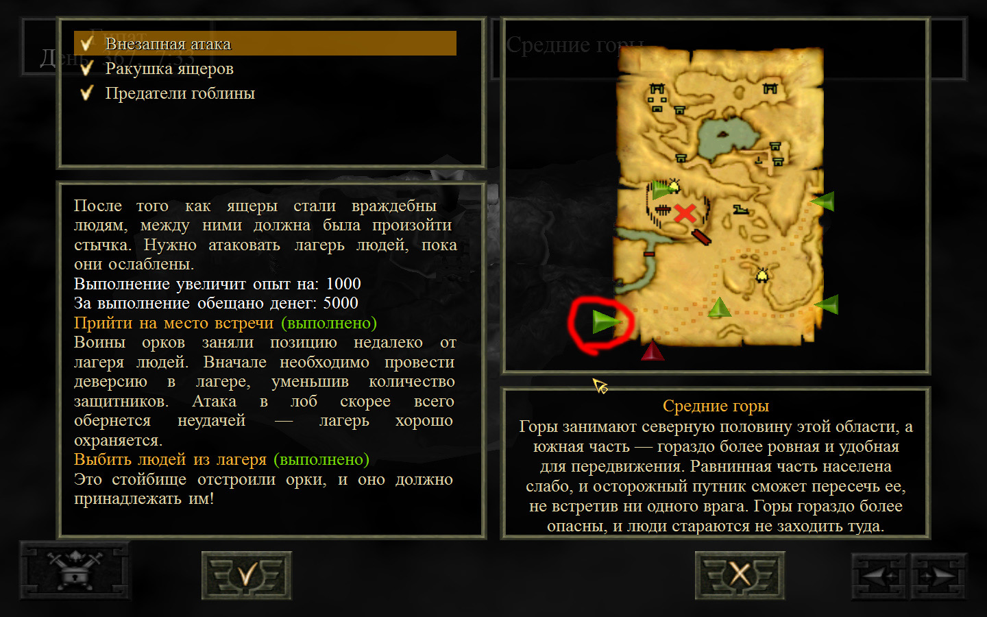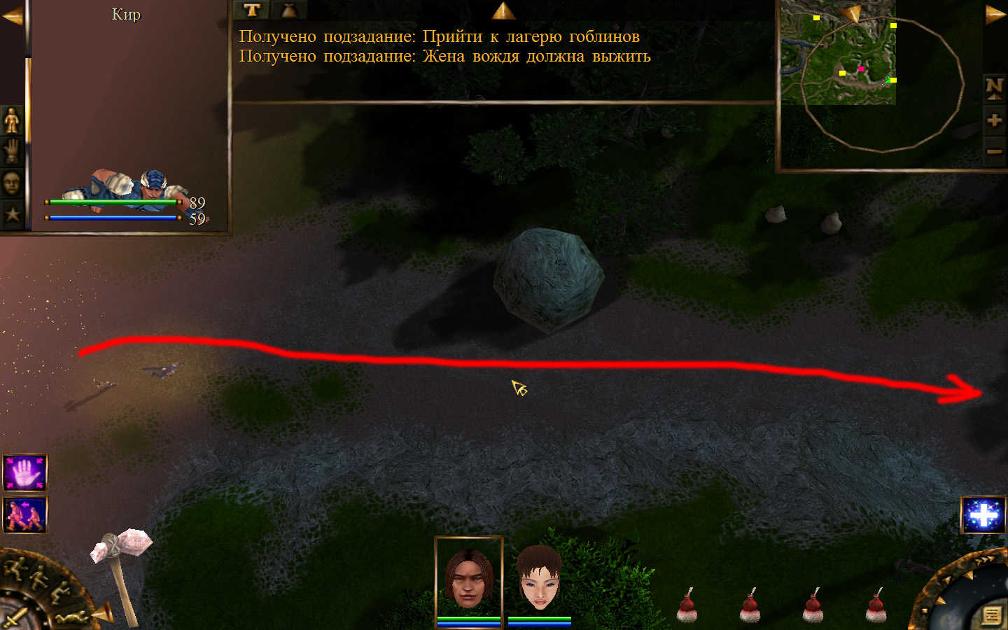 Ползем вдоль тропинки к поселку, как указанно на изображениях. Пробираемся через ворота в поселок. Если собаки у входа будут препятствовать и их необходимо будет убить, нужно нападать со спины, чтобы из поселка на шум битвы не выбежали охранники. Попав в поселок, уходим влево и ползем под горой к указанному розовым светом месту. По пути нужно будет убить одного гоблина, что бы он не мешал. А дальше активировать пирамиду. После чего выбраться из поселка. Молния от древней пирамиды убьет небольшой процент охраны в поселке, после чего нужно снова зайти в поселок и убить оставшуюся там охрану. На помощь придут вольные охотники с орками. Необходимо в первую очередь убивать магов, стражу бить обычными ударами, а лучников бить по ногам.