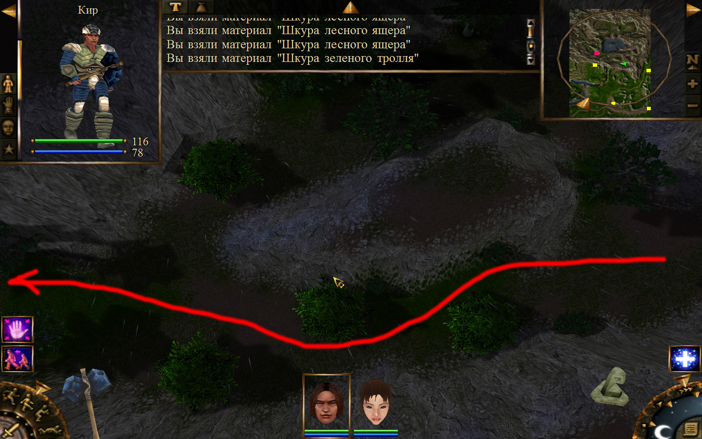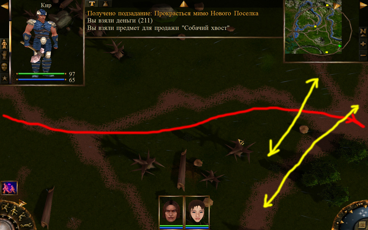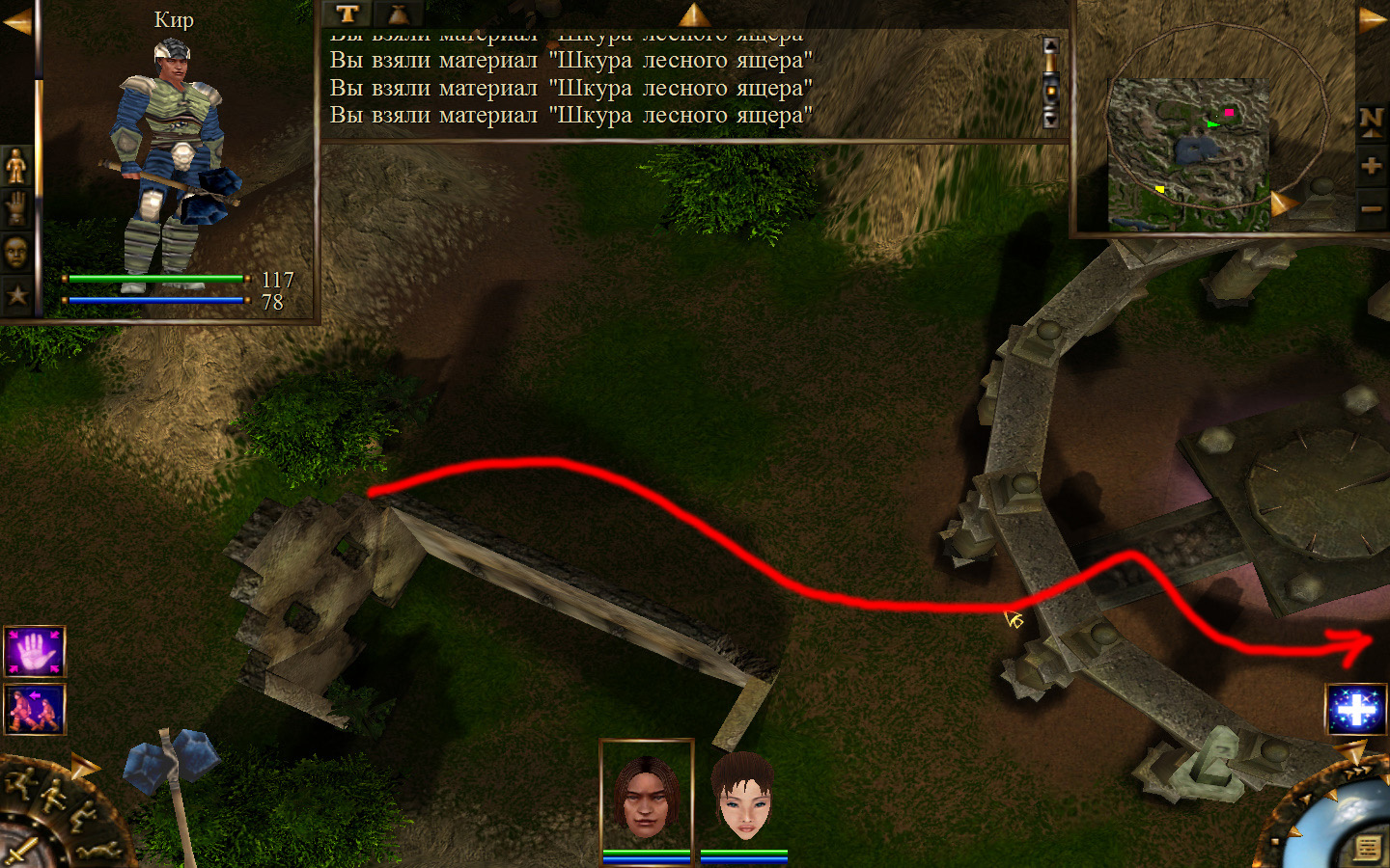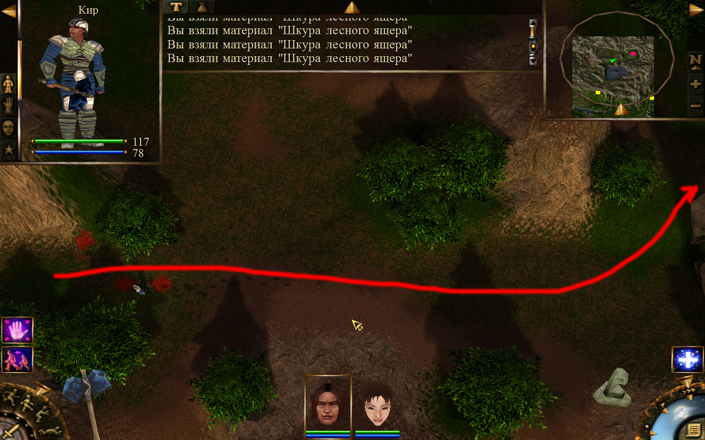 После разговора с Кель будет получено задание: отправиться к месту передачи породы и донесения. Отправляемся. Выходим из стойбища орков в локацию Мертвый город. Идем в сторону, в которую ходили ранее, когда породы собирали, только теперь не заходим в ущелье, а проходим мимо так, как показано на изображениях. Доходим до входа в Мертвый город. Лучше всего в данный момент перемещаться по-пластунски. Теперь необходимо по правой стороне дороги от города ползти к месту передачи документов. На изображениях показана траектория: как необходимо перемещаться и как перемещаются по дороге скелеты. К сожалению, в данный момент скелетов побить нельзя, поэтому их необходимо обползти, но осторожно, ведь обзор у них очень большой (это не то, что стражники на Суслангере). На одном из изображений показано, где нужно переждать, пока скелеты пройдут. В данном месте скелеты запрограммированы, они ходят не постоянно по нему, а только тогда, когда главный персонаж пересекает определенную черту. И вот, по дороге мы проползли, доползли до леса, а по лесу можно перемещаться стоя. Согласно траектории двигаемся до места передачи и кликаем на сундук все, по старой дороге возвращаемся обратно.