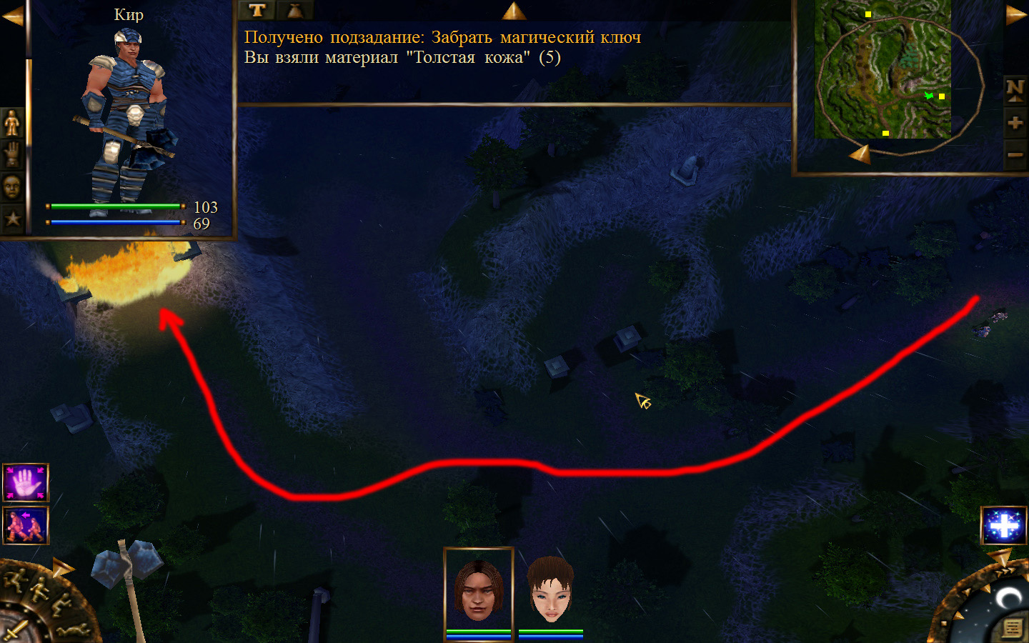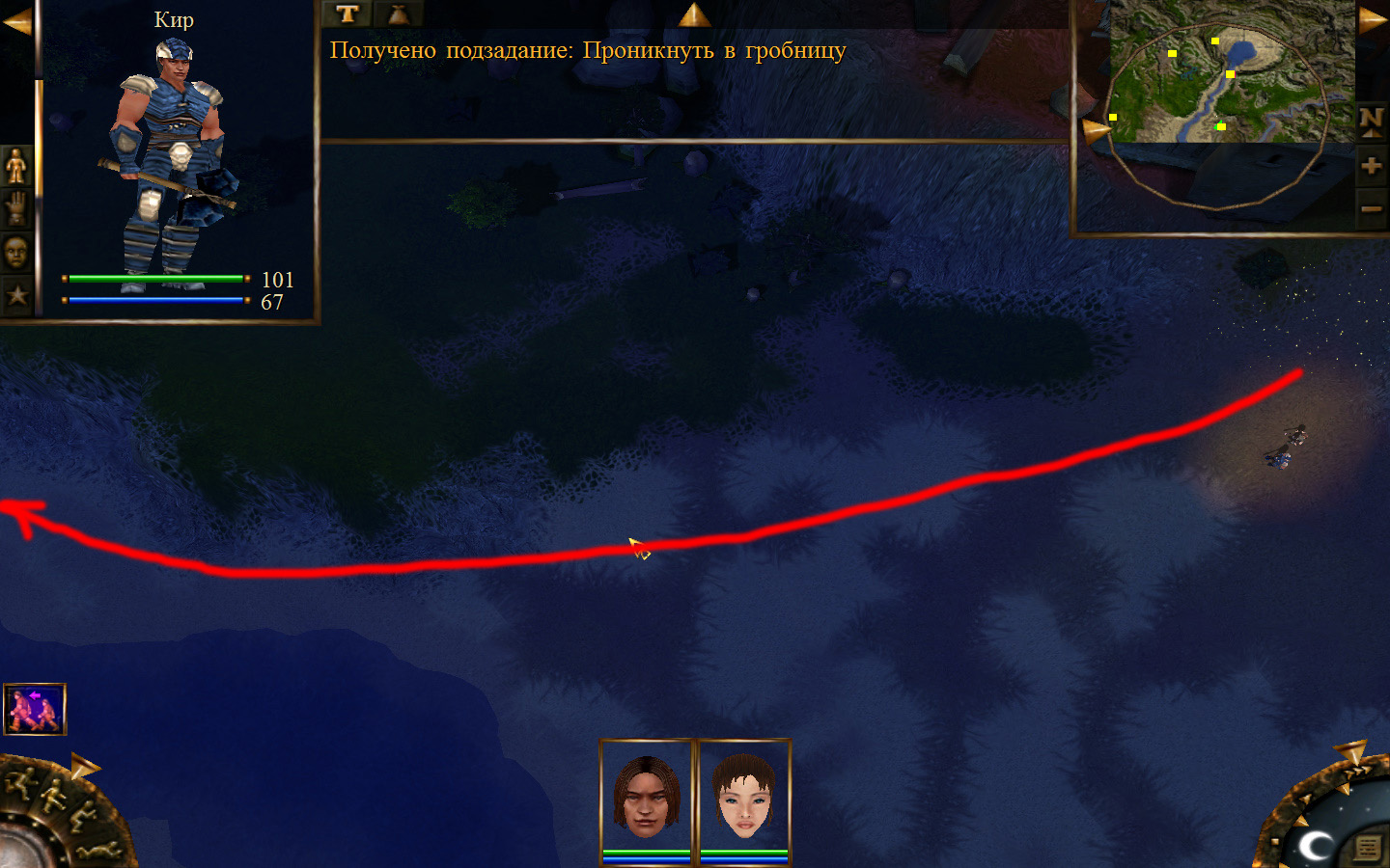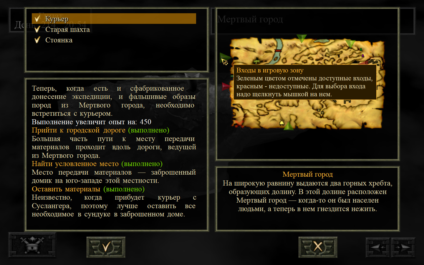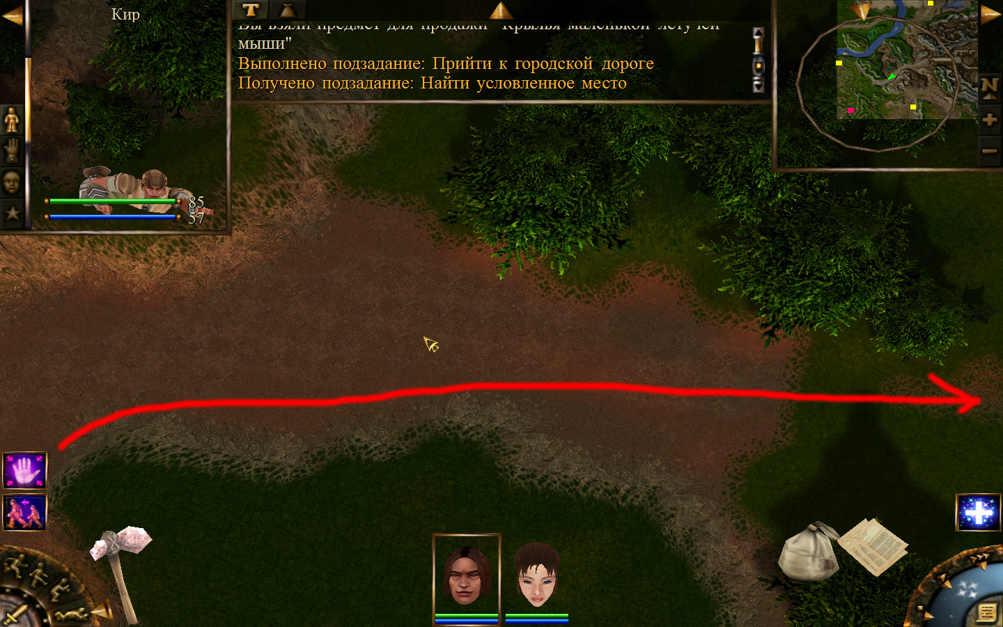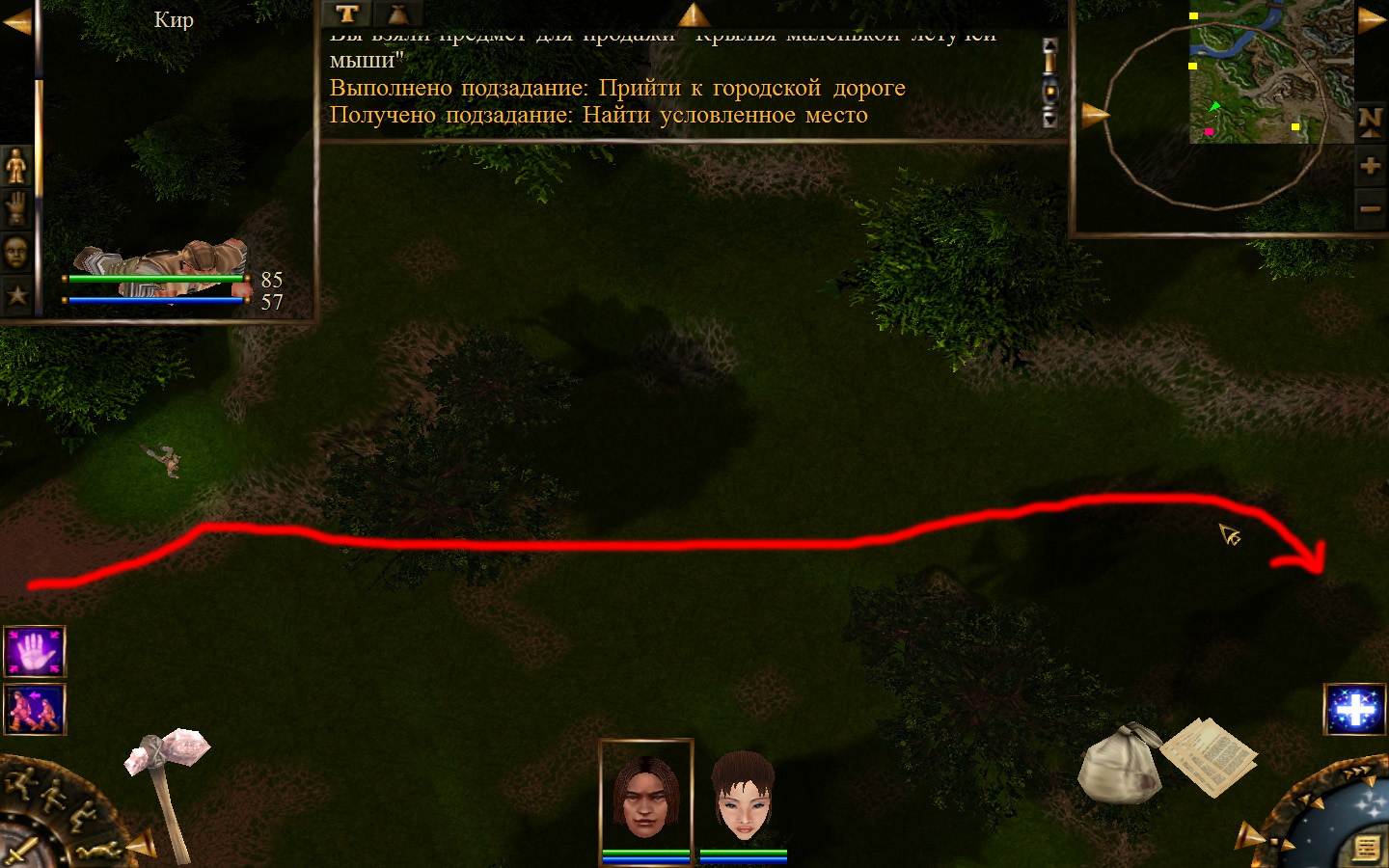 После разговора с Кель будет получено задание: отправиться к месту передачи породы и донесения. Отправляемся. Выходим из стойбища орков в локацию Мертвый город. Идем в сторону, в которую ходили ранее, когда породы собирали, только теперь не заходим в ущелье, а проходим мимо так, как показано на изображениях. Доходим до входа в Мертвый город. Лучше всего в данный момент перемещаться по-пластунски. Теперь необходимо по правой стороне дороги от города ползти к месту передачи документов. На изображениях показана траектория: как необходимо перемещаться и как перемещаются по дороге скелеты. К сожалению, в данный момент скелетов побить нельзя, поэтому их необходимо обползти, но осторожно, ведь обзор у них очень большой (это не то, что стражники на Суслангере). На одном из изображений показано, где нужно переждать, пока скелеты пройдут. В данном месте скелеты запрограммированы, они ходят не постоянно по нему, а только тогда, когда главный персонаж пересекает определенную черту. И вот, по дороге мы проползли, доползли до леса, а по лесу можно перемещаться стоя. Согласно траектории двигаемся до места передачи и кликаем на сундук все, по старой дороге возвращаемся обратно.