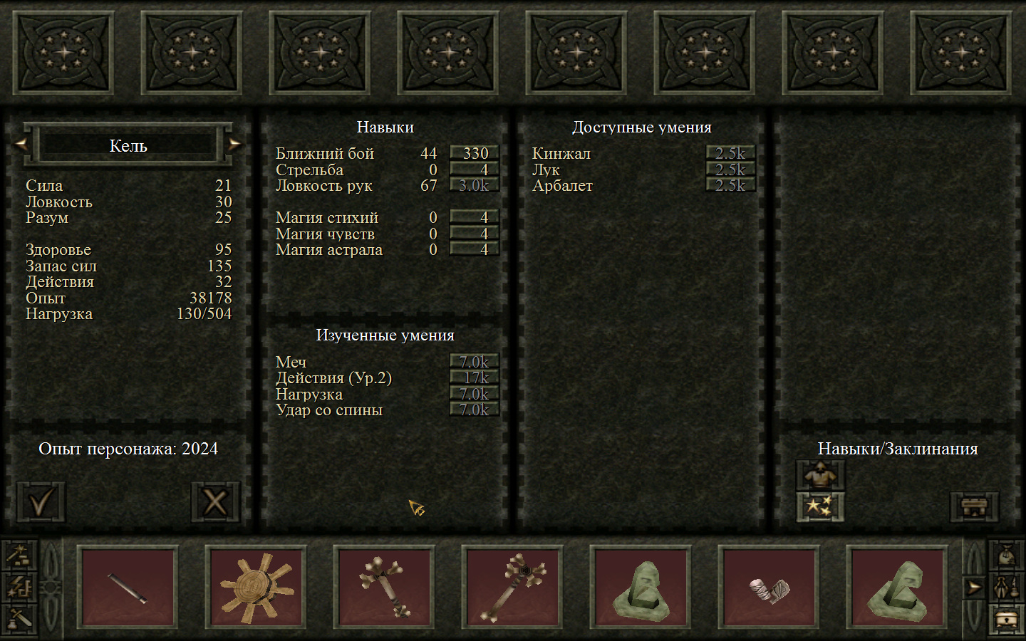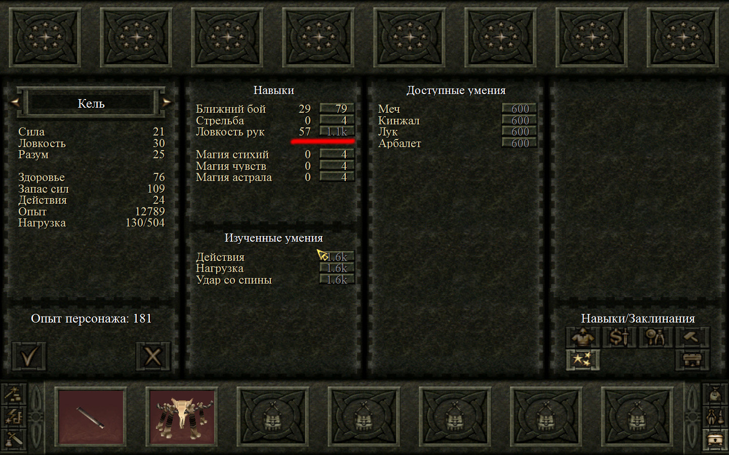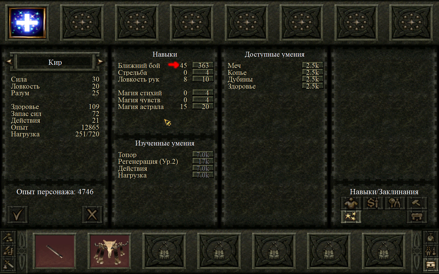 Необходимо будет сразу же зайти в магазин к вождю и сменить топор. Поставить Киру тот, который сделал вождь, а Кель поставить обычный топор, который мы сделали ранее. Опыт пока не распределяем, будем копить на стоящие навыки.