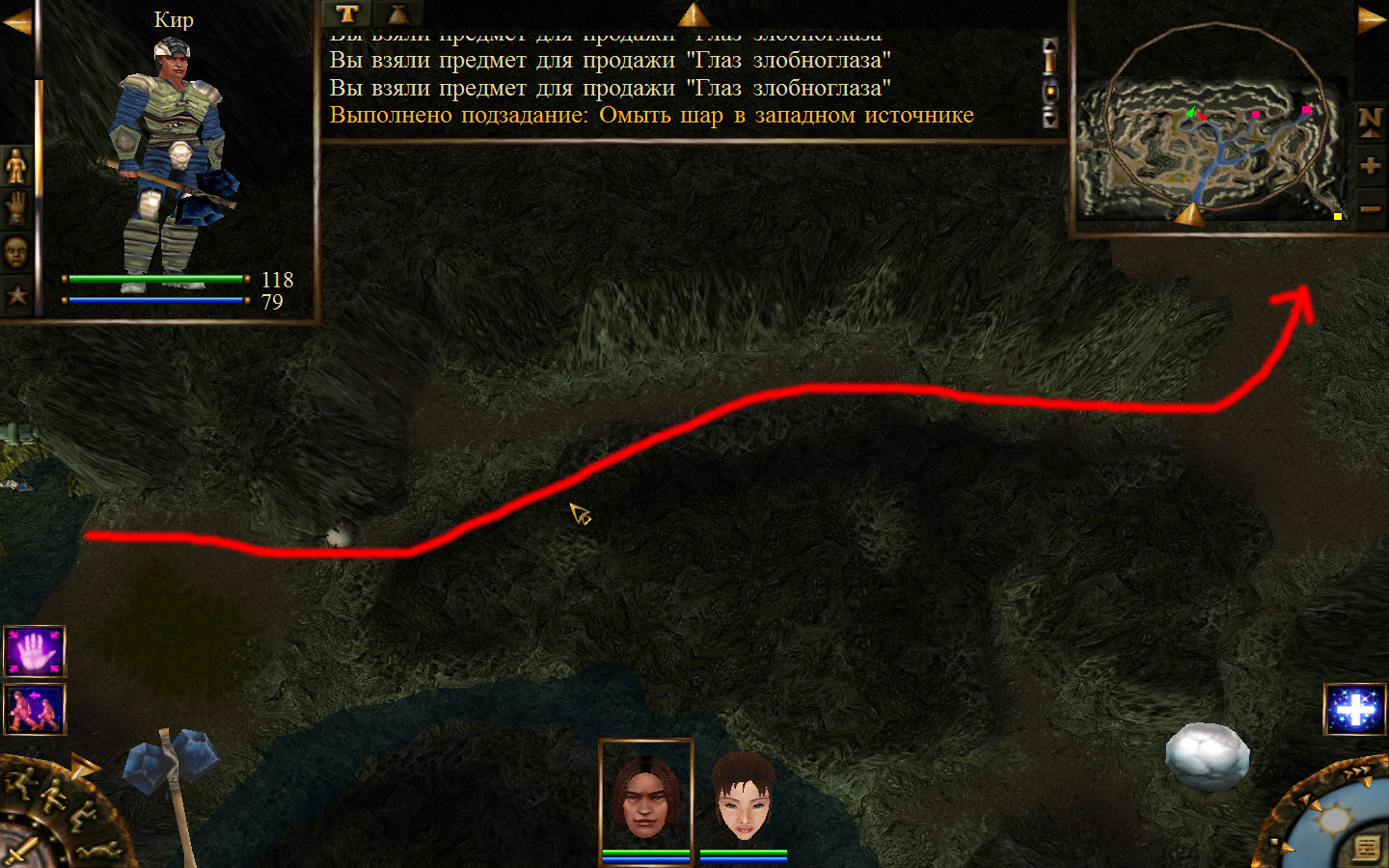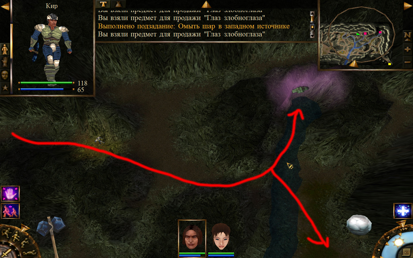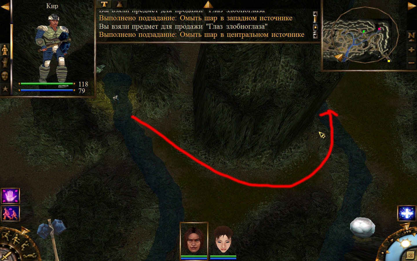 Попав в пещеру пробираемся до места, где убивали шамана, у которого отбирали ожерелье для Айри, и идем дальше по пути, указанному на изображениях. Добираемся до первого ручья и омываем в нем шар. По дороге вам будут встречаться каменные элементали, злобноглазы и панцирники, но убить их более чем легко. Дальше проходим ко второму ручью и в нем омываем шар, а после к третьему. В результате шар станет белым, а мы отправимся к знахарке.
