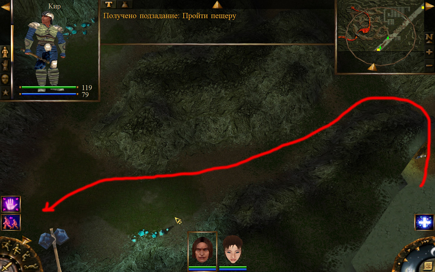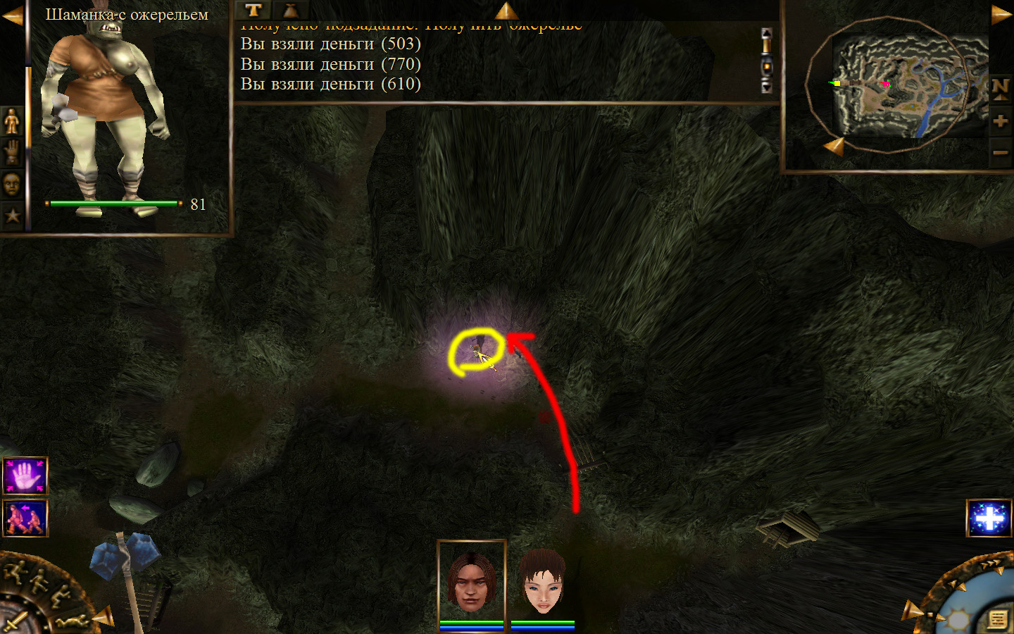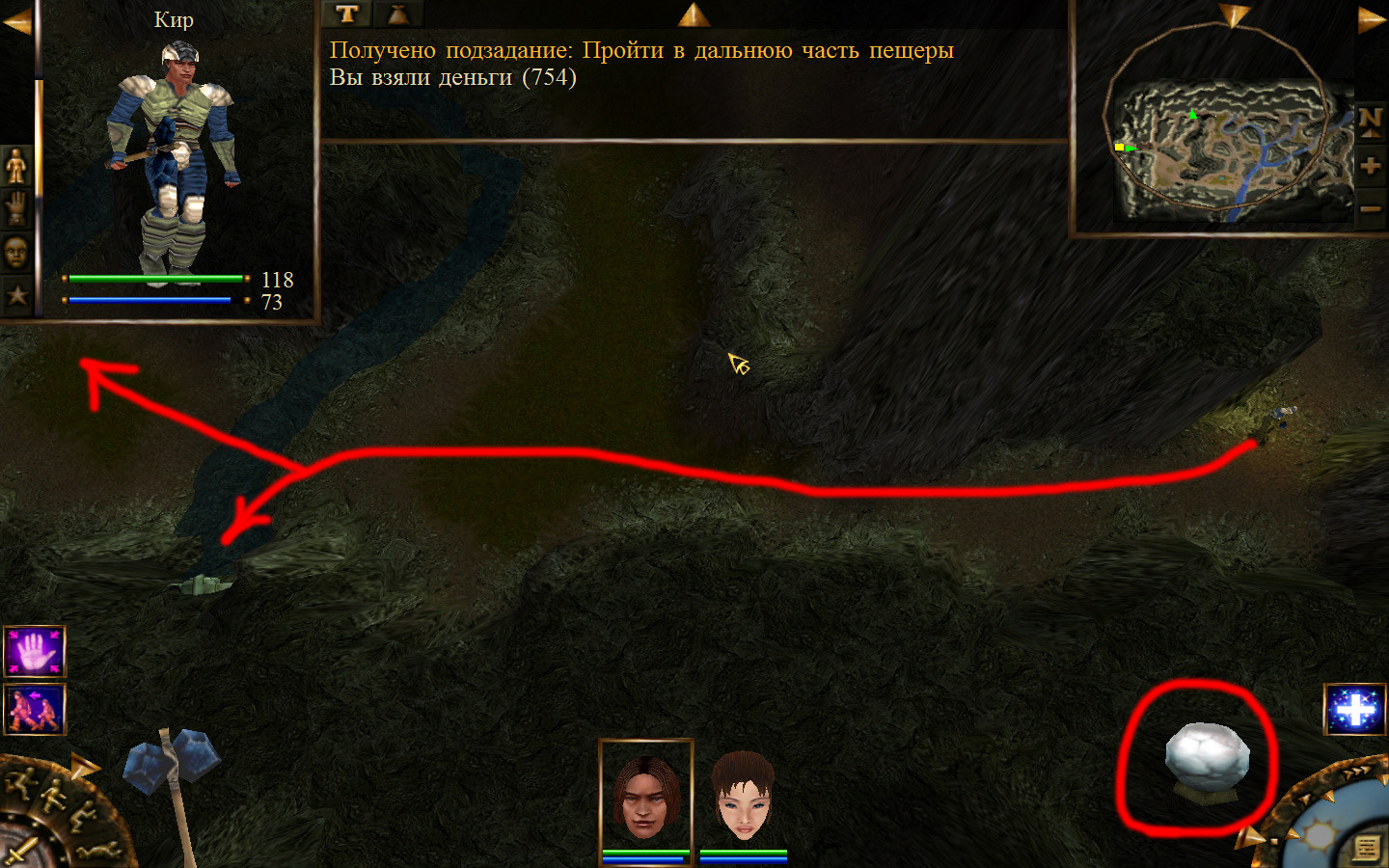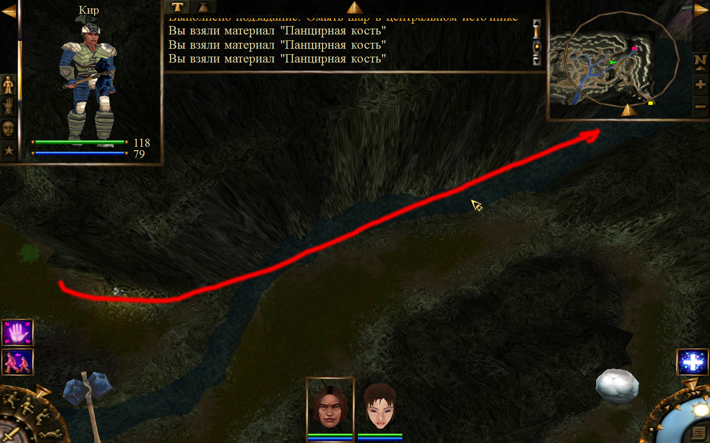 Попав в пещеру пробираемся до места, где убивали шамана, у которого отбирали ожерелье для Айри, и идем дальше по пути, указанному на изображениях. Добираемся до первого ручья и омываем в нем шар. По дороге вам будут встречаться каменные элементали, злобноглазы и панцирники, но убить их более чем легко. Дальше проходим ко второму ручью и в нем омываем шар, а после к третьему. В результате шар станет белым, а мы отправимся к знахарке.