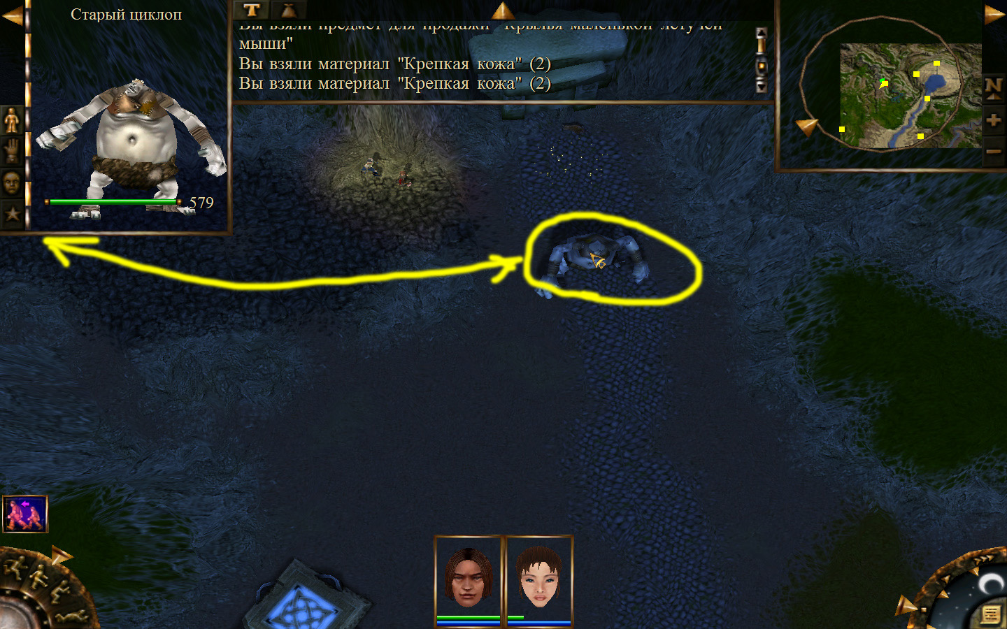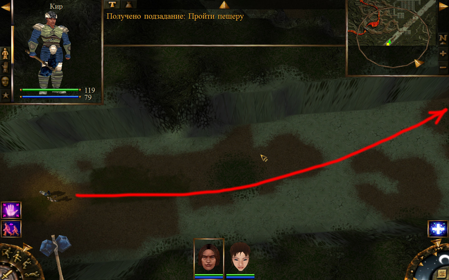 Переходим на локацию Дальние горы и идем к тому месту, где в самом начале необходимо было брать породу, рядом с шахтой. От этой самой шахты идем по ущелью к месту, указанному на карте розовым квадратом. По ущелью будет ходить старый циклоп. Необходимо дождаться, пока он встанет так, как на изображении и пробежать в пещеру.